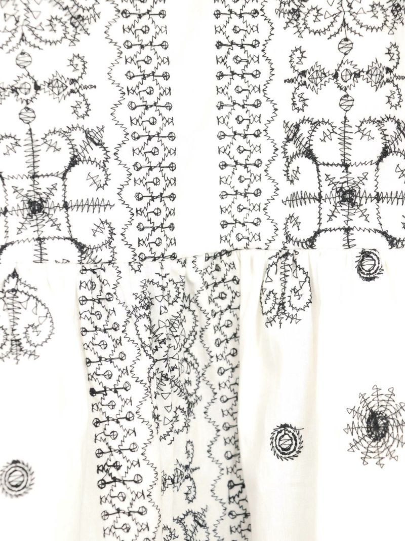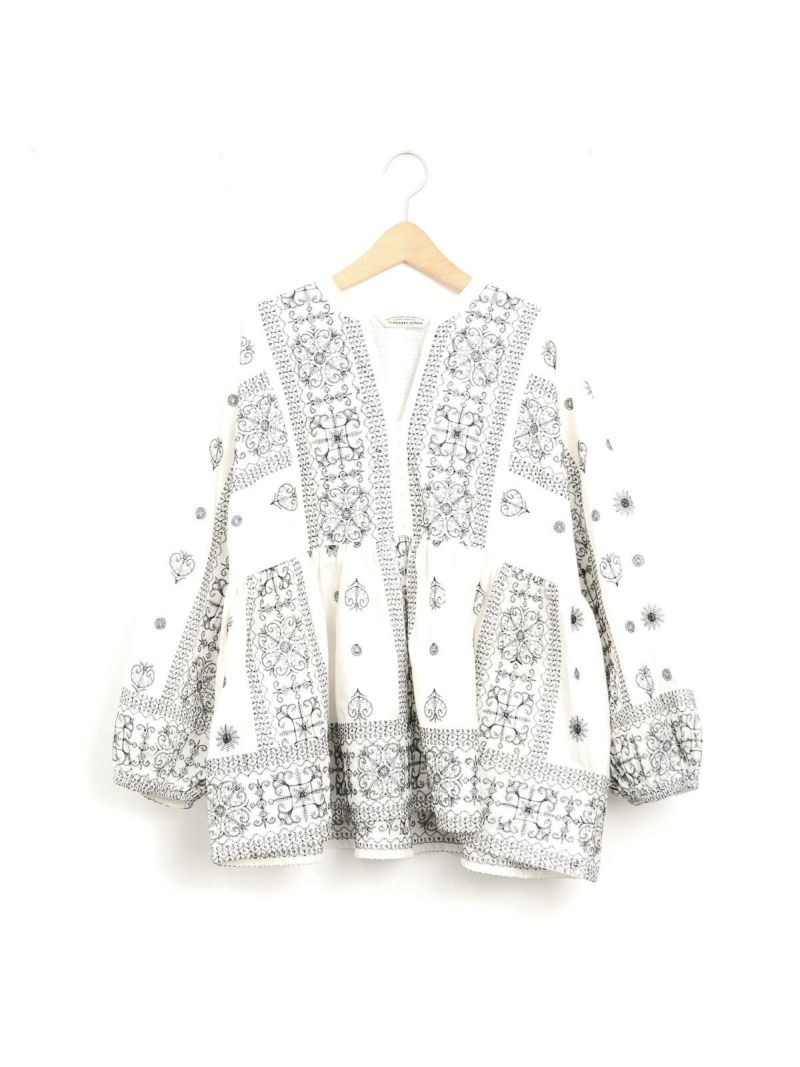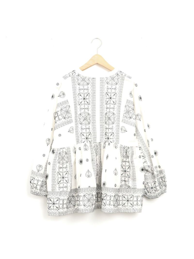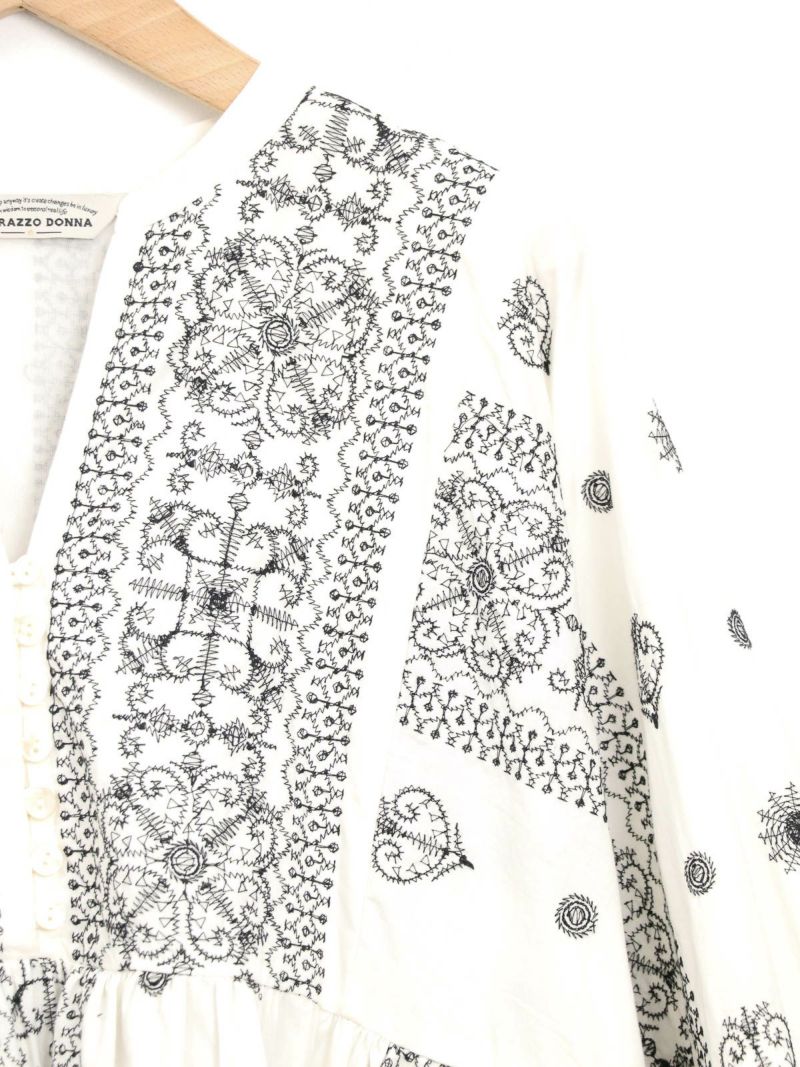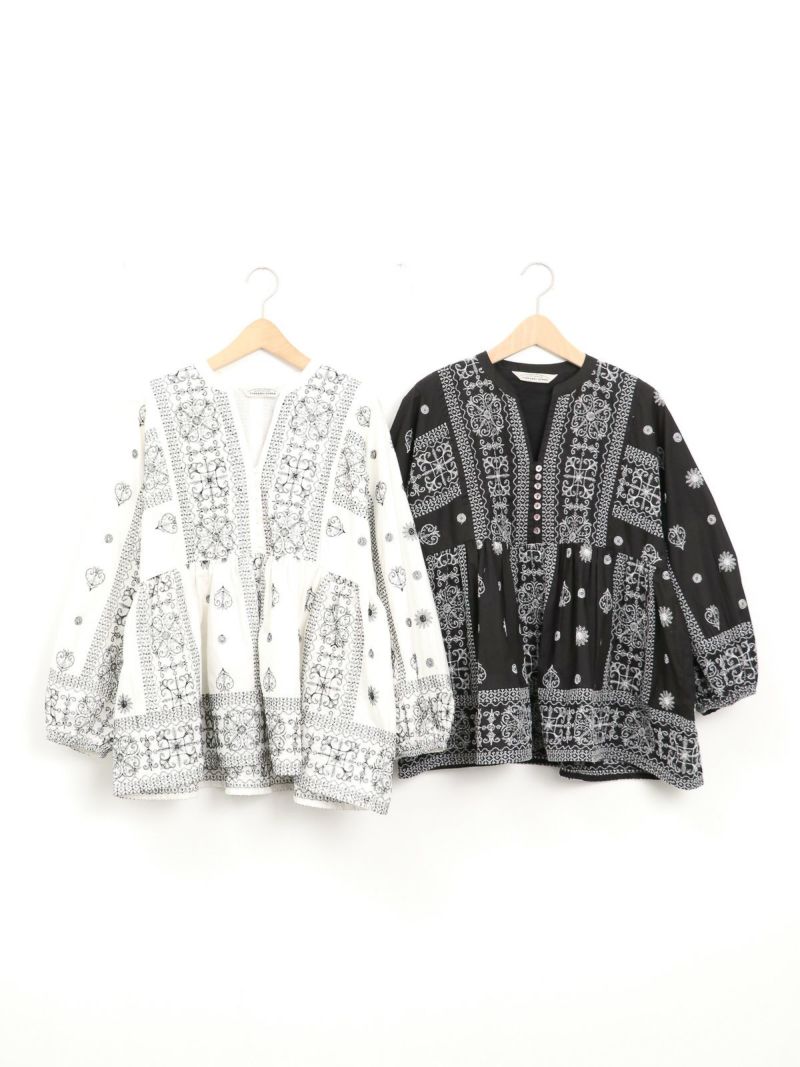たっぷりの刺繍をモノトーンで施し、大人っぽさと華やかさがのあるブラウス。 ウエスト切替位置をやや高めにデザインしているためスタイルアップも叶う1枚です。