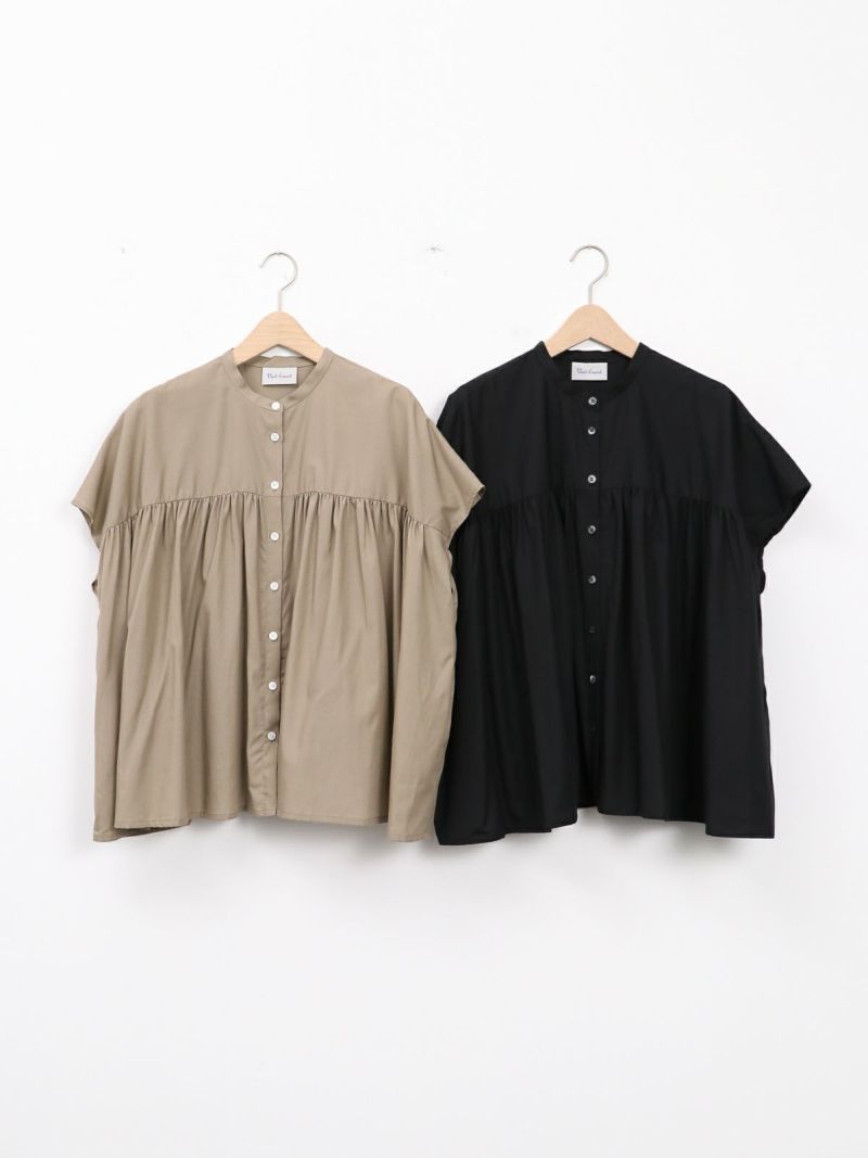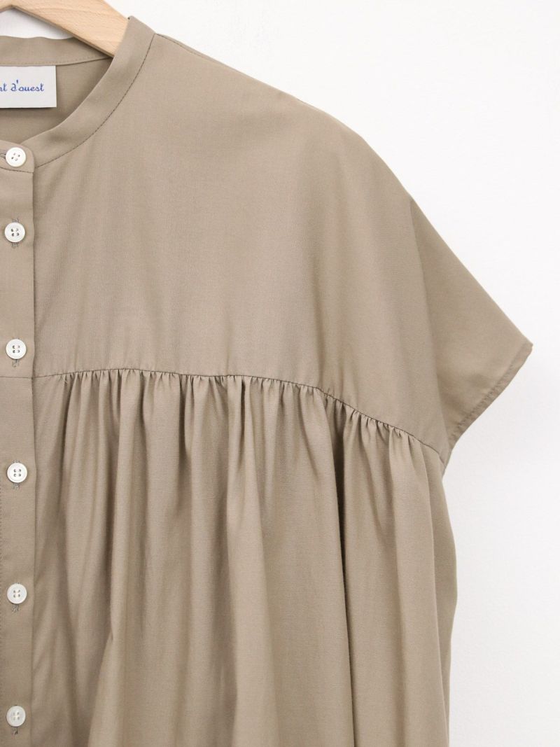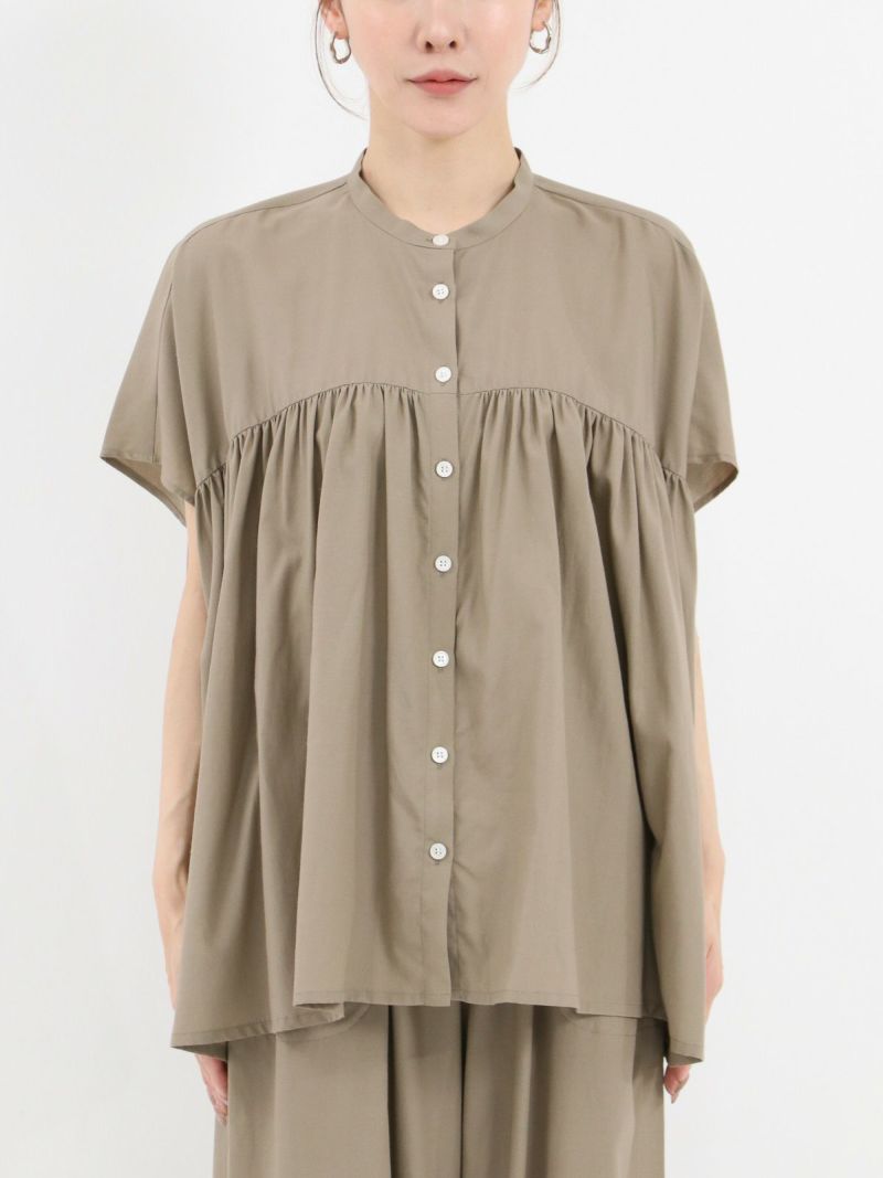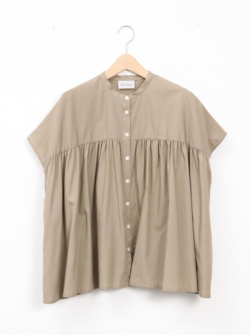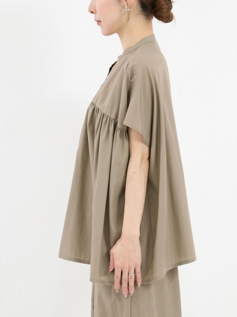胸下の切り替えからギャザーでふんわりと広がるブラウス。 首元はバンドカラーですっきり見え。フレンチスリーブですが身幅が広いためしっかりと袖が落ちてくれて羽織なしでも着やすいシルエットです。