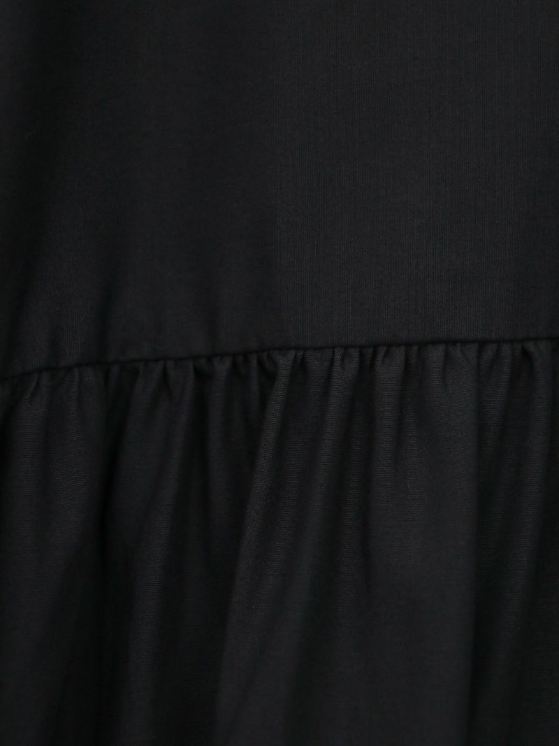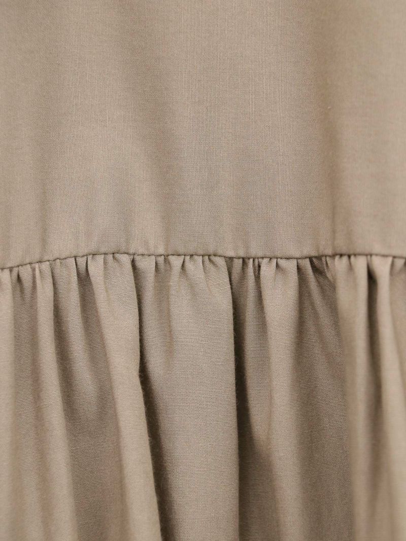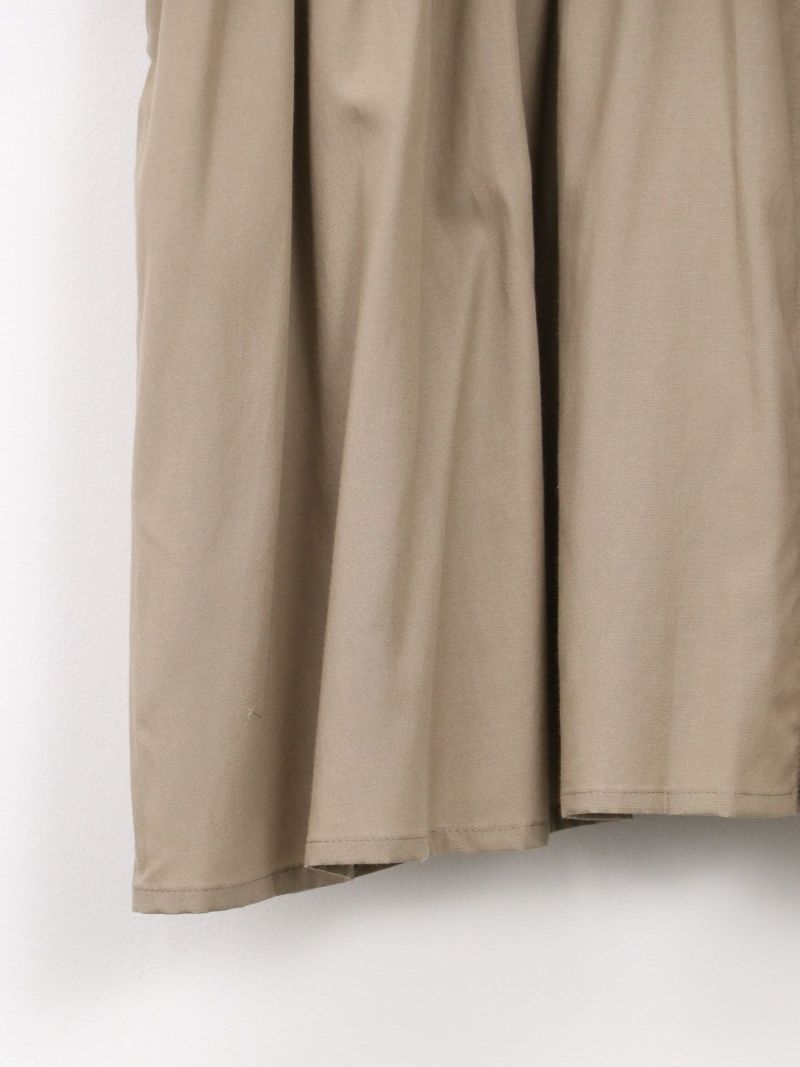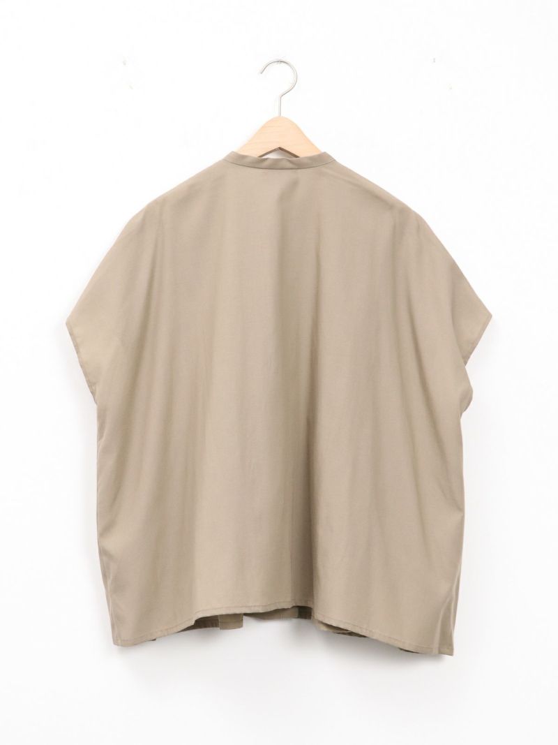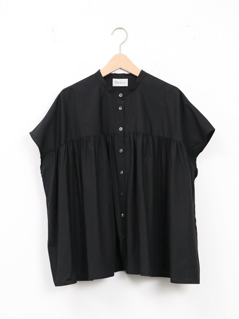 胸下の切り替えからギャザーでふんわりと広がるブラウス。 首元はバンドカラーですっきり見え。フレンチスリーブですが身幅が広いためしっかりと袖が落ちてくれて羽織なしでも着やすいシルエットです。