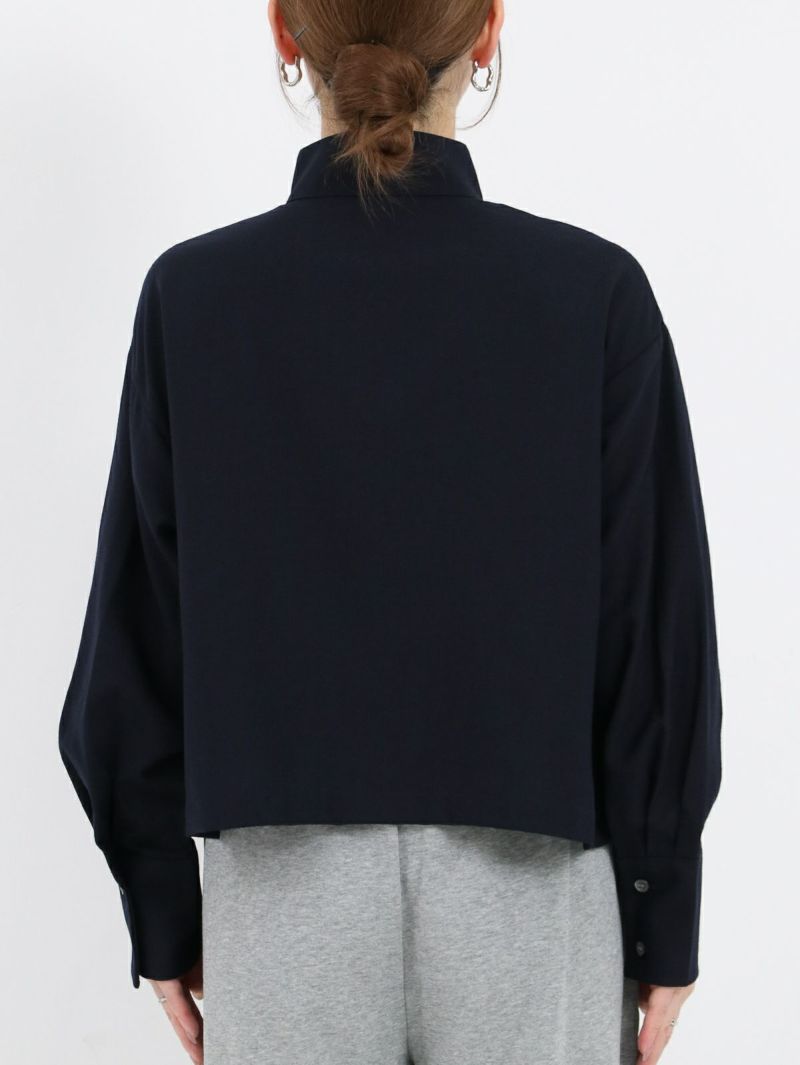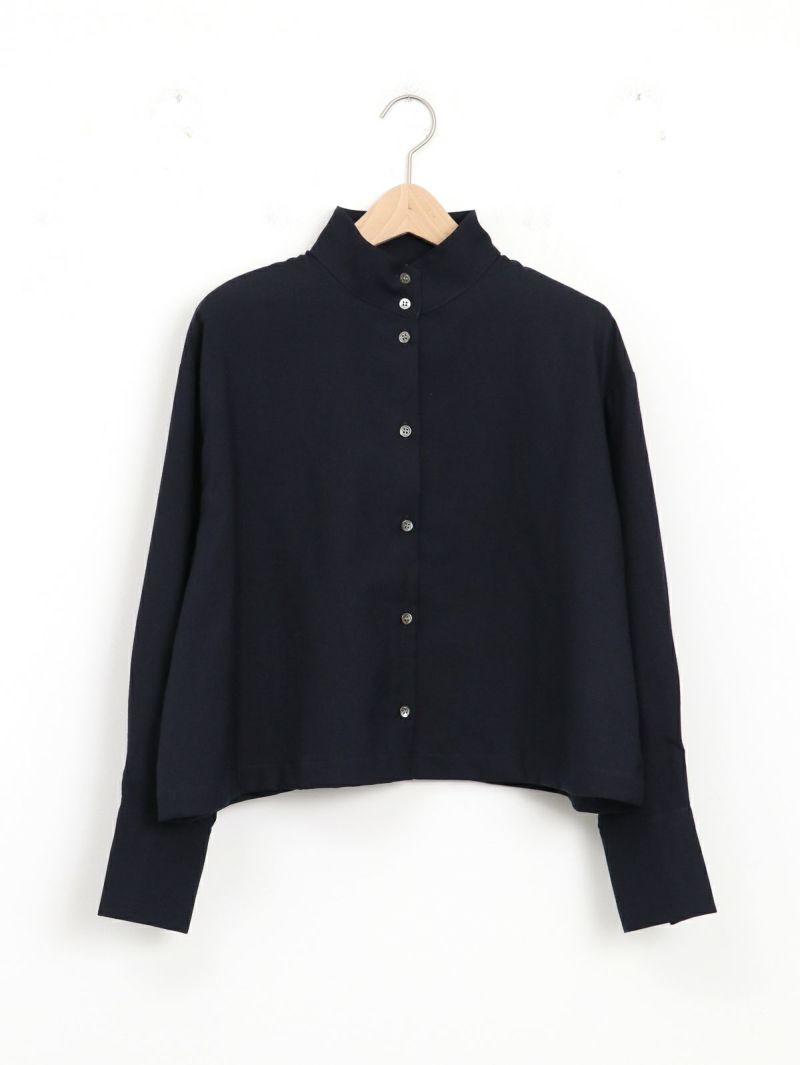 平織りサマーウールのSETTO定番オッカケシャツ。 クラシカルな雰囲気のスタンドカラーに、風を取り込むようなボックスシルエット。 身幅を広めにとった、ほどよくゆとりのあるフォルムが特徴です。短めの着丈と、長めのカフスがアクセントになり、全体のバランスにメリハリを。シンプルながら、細かなディテールにもこだわった一枚です。