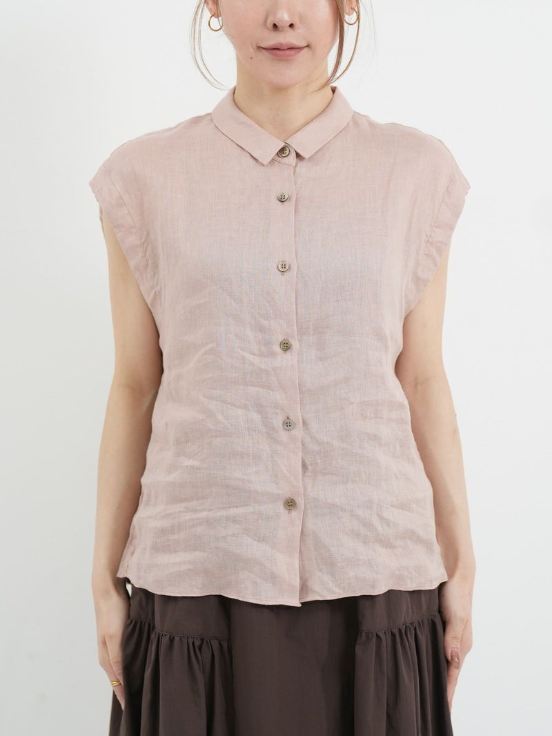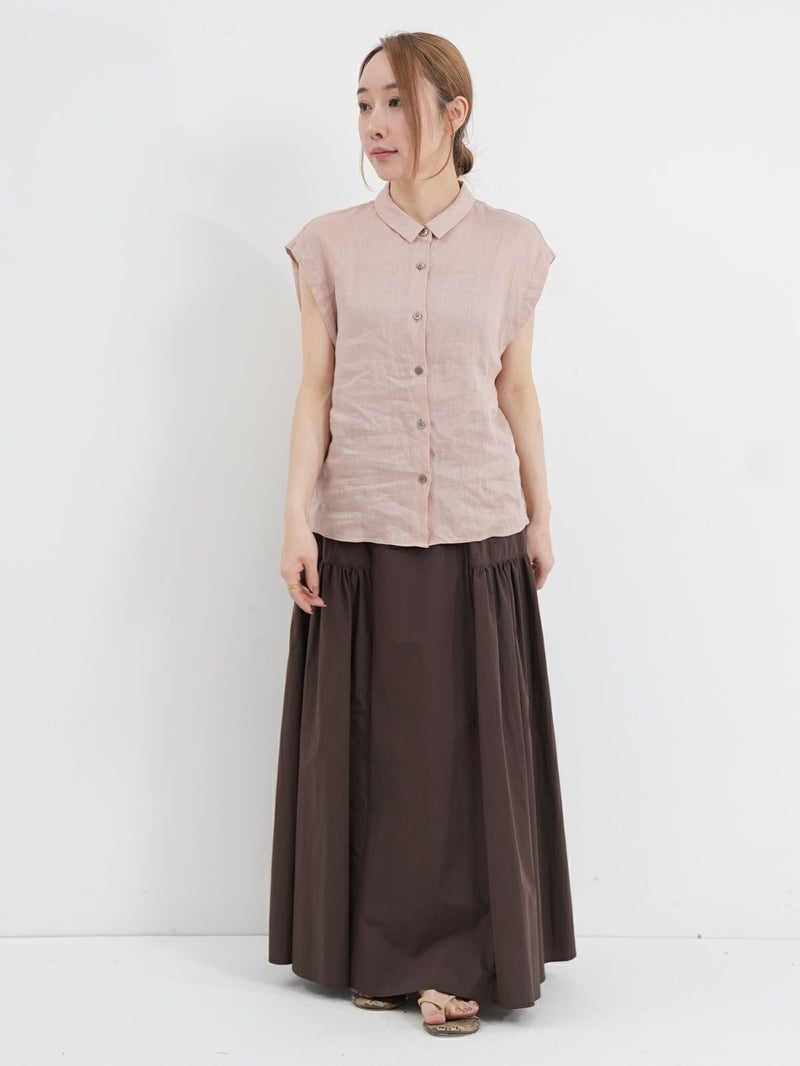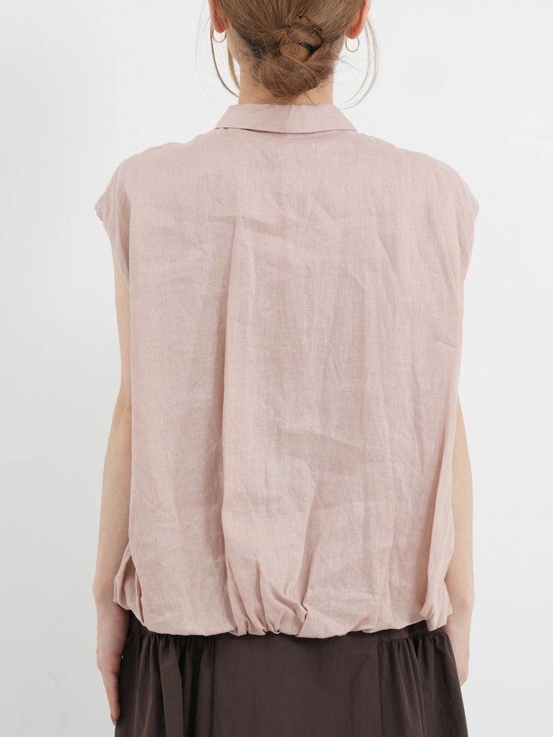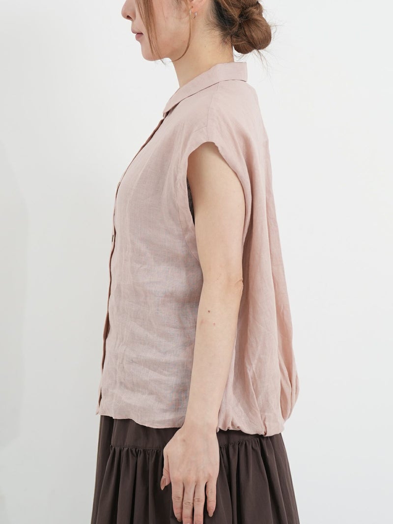 上品で涼し気な印象の60sリネンのバルーンシャツ。 後ろ見頃のみ2枚仕立てのバルーンシルエットにしており、ギャザーとタックで立体感を出しています。少し甘めのバックスタイルに対して、フロントはシンプルしてバランスの取れた1枚です。