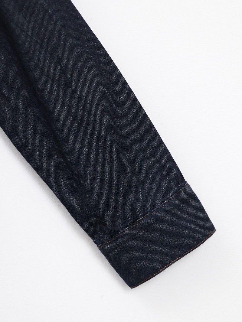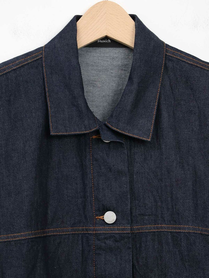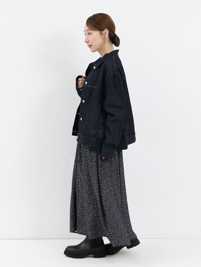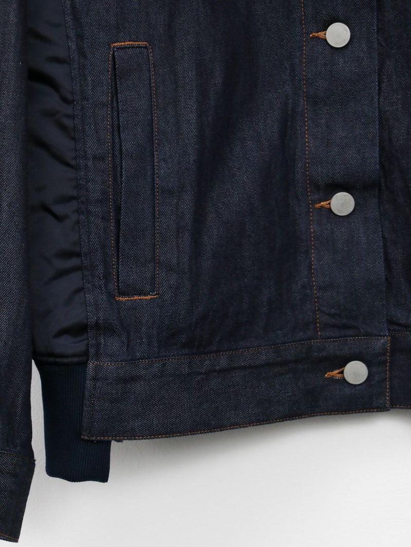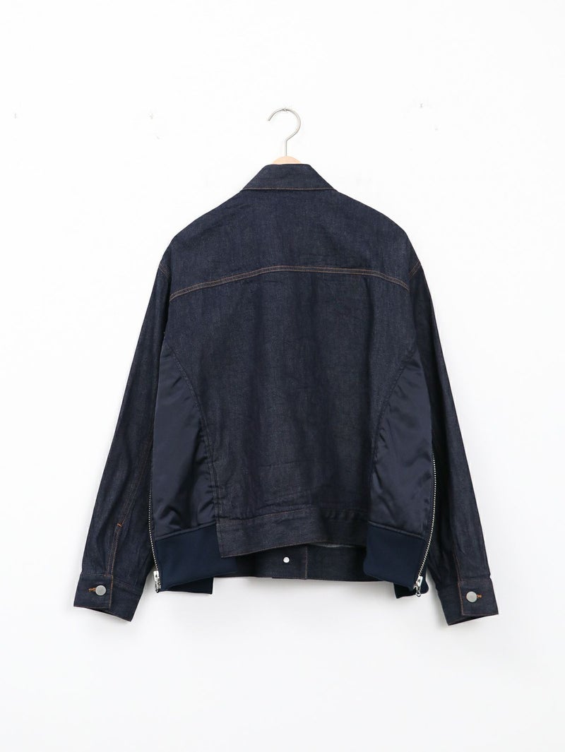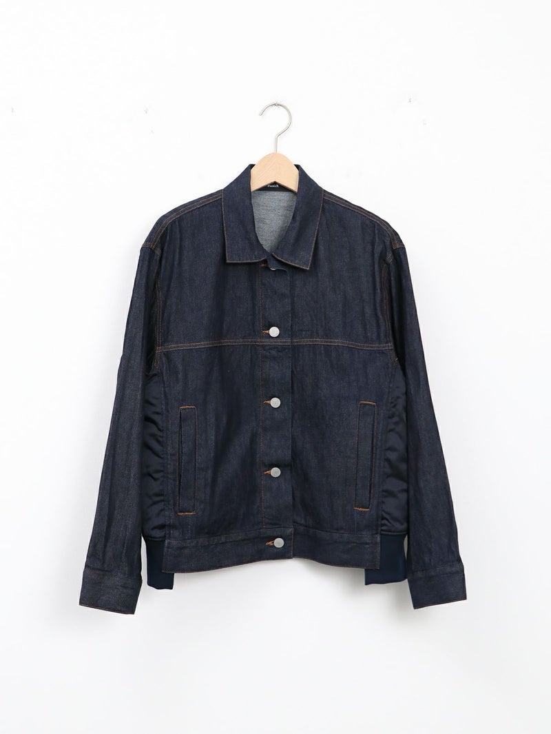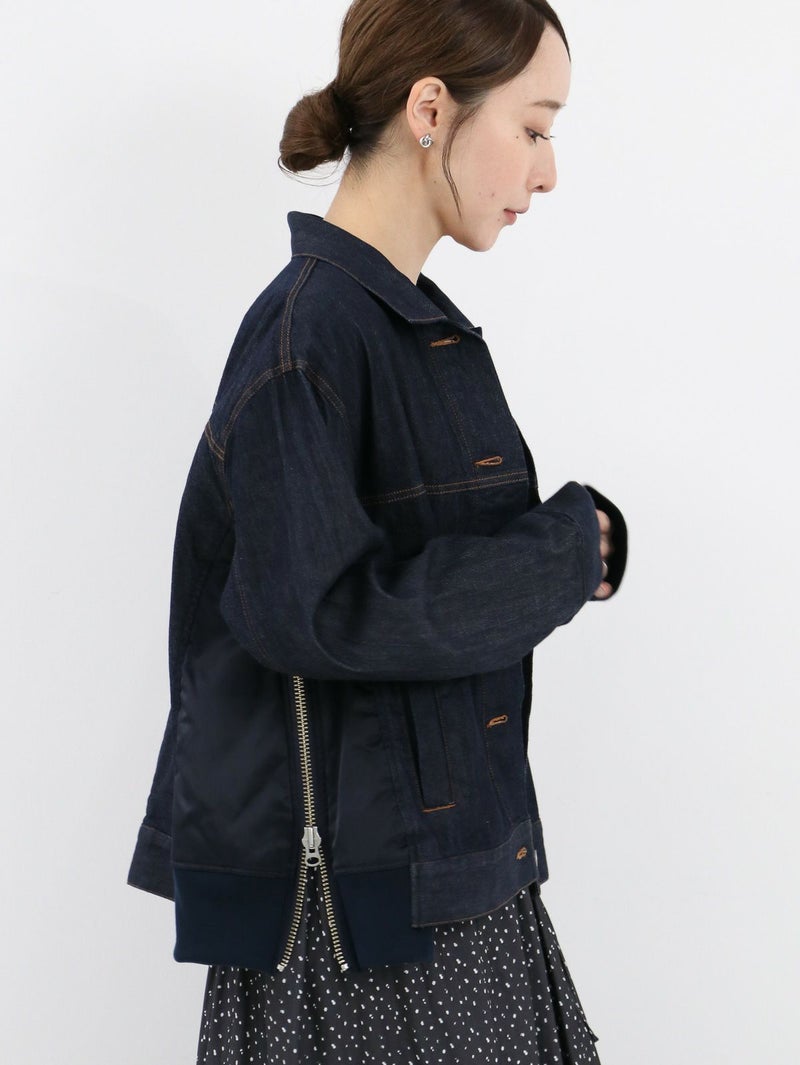 デニムトラッカーの脇身頃をフライトジャケットで切り替えたドッキングブルゾン。 正面からはベーシックなデザインにみえますが、裾丈に少し段差をつけ両脇とも深いファスナーあきにしているので、サイドや斜め後ろからの雰囲気が特徴的。同色系の組み合わせで、ディテールの押し出しが強くないところが逆にポイントです。両脇のファスナーを全開にするとシルエットがテントラインになりコーディネートに合わせて印象を変えられます。