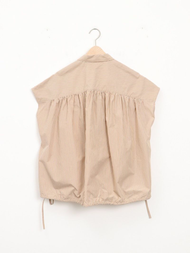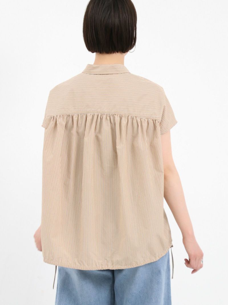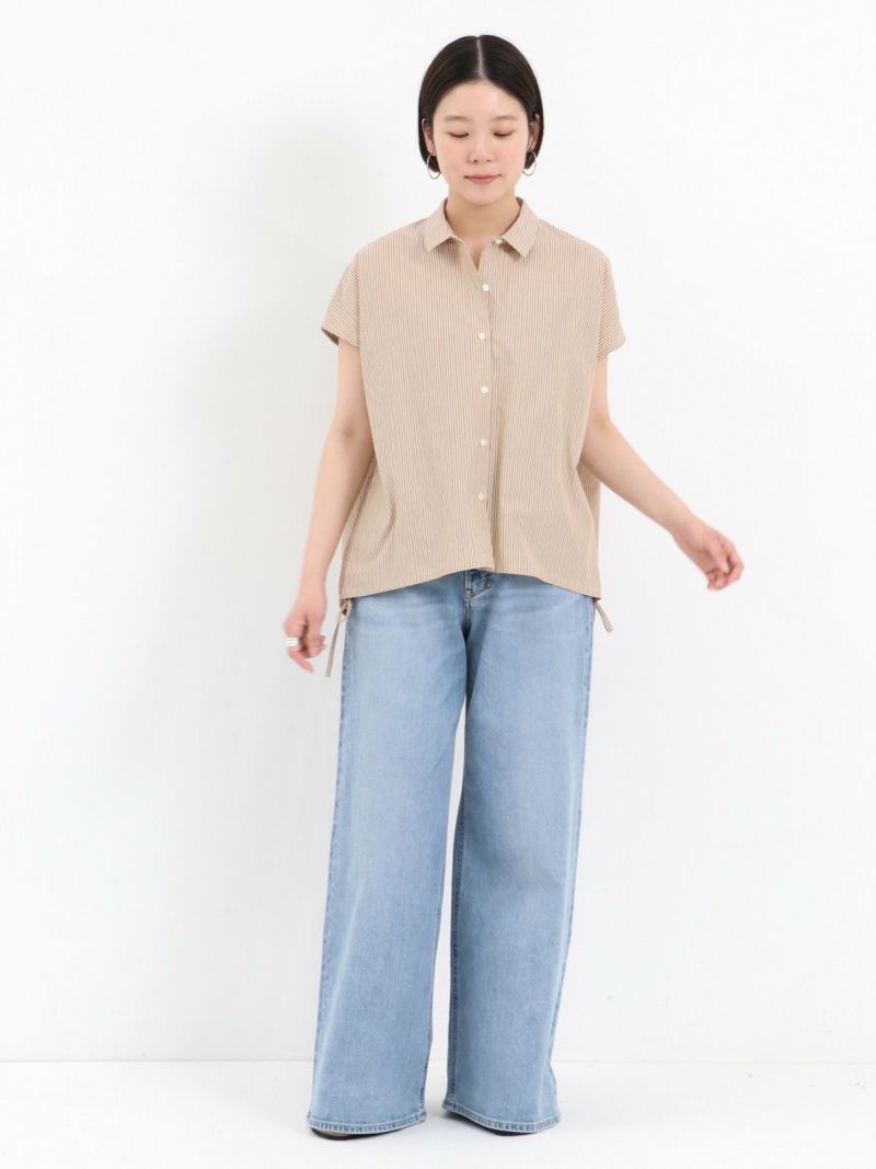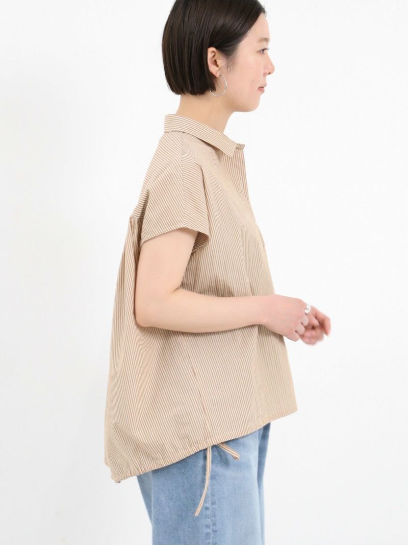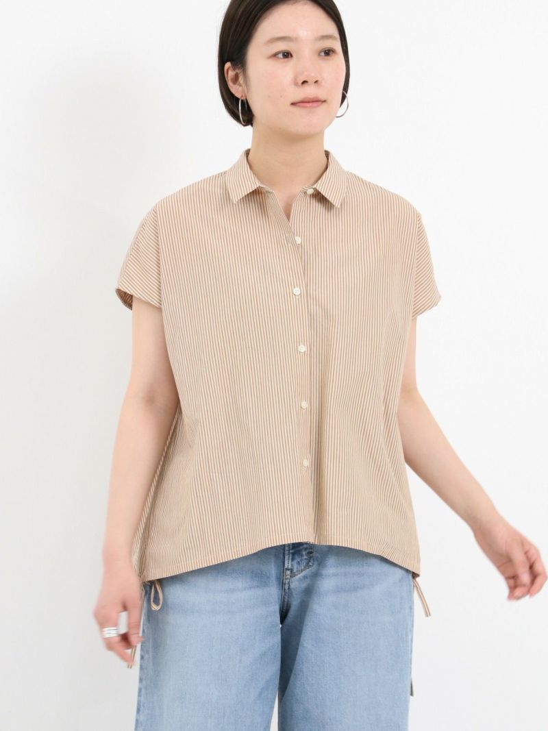 サイドのひもを絞って、雰囲気の変化を楽しめる2WAYデザインのシャツ。 ほどよいハリのあるコットンナイロン仕立てです。軽くて、さらりとしたドライタッチな肌触りで、暑い夏も快適に過ごせる素材です。フレンチスリーブのお袖は涼し気で アームラインをスッキリと見せてくれます。