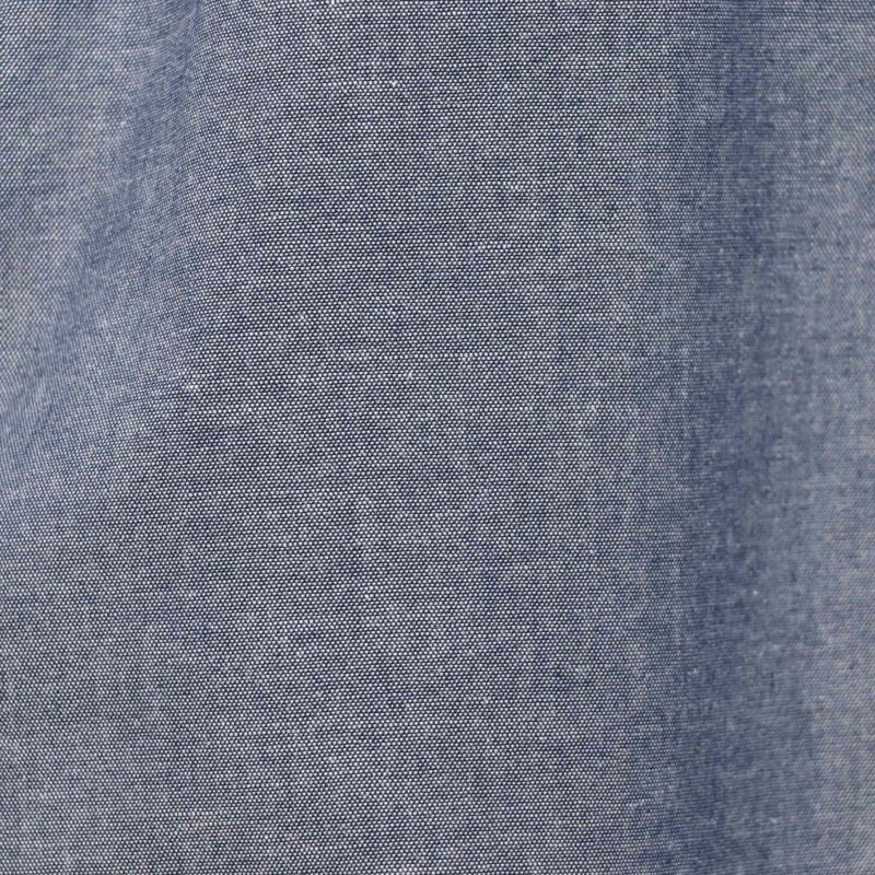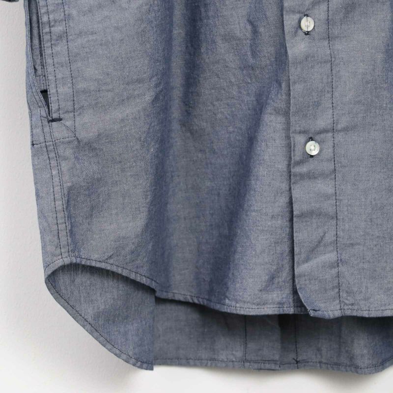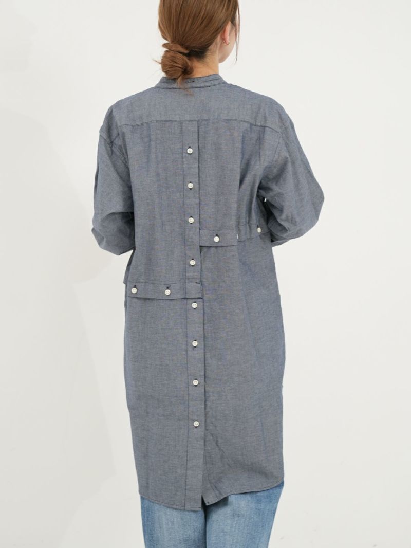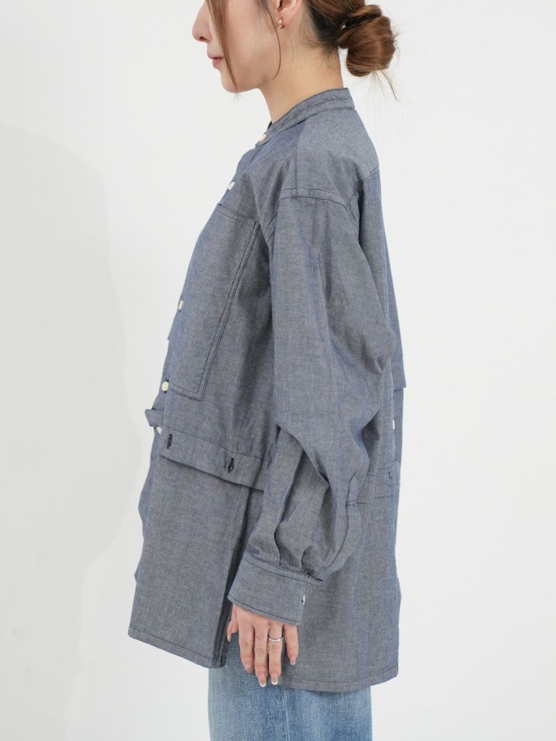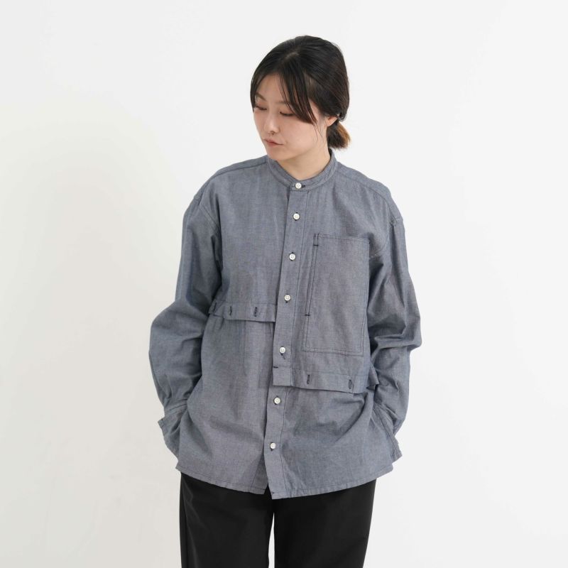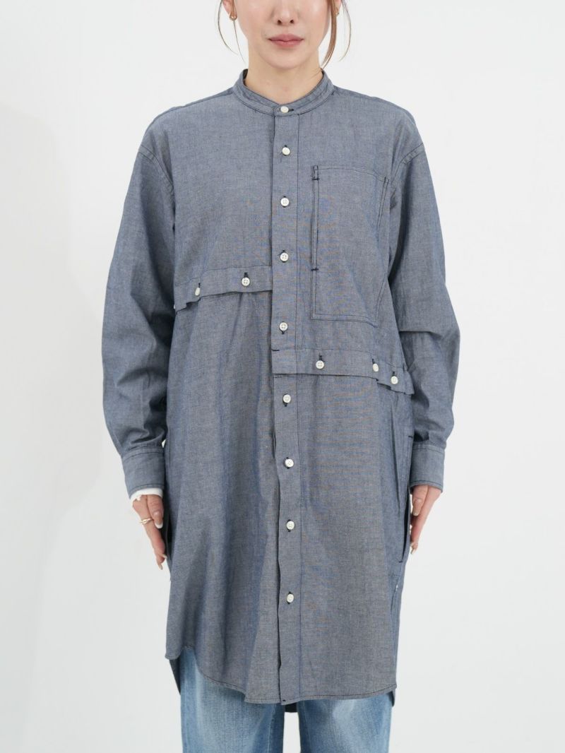 インディゴカラーのバンドカラーシャツ。 着丈が変形する仕様になっており、通常時がロング丈、横部分のボタンを外すことでシャツの着丈を短くできます。1枚ではもちろん、ジャケットやコートのインナーにも幅広いスタイリングで着用していただけます。