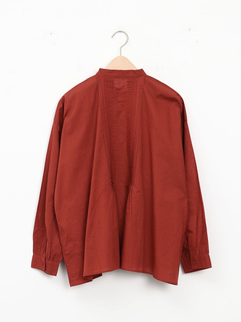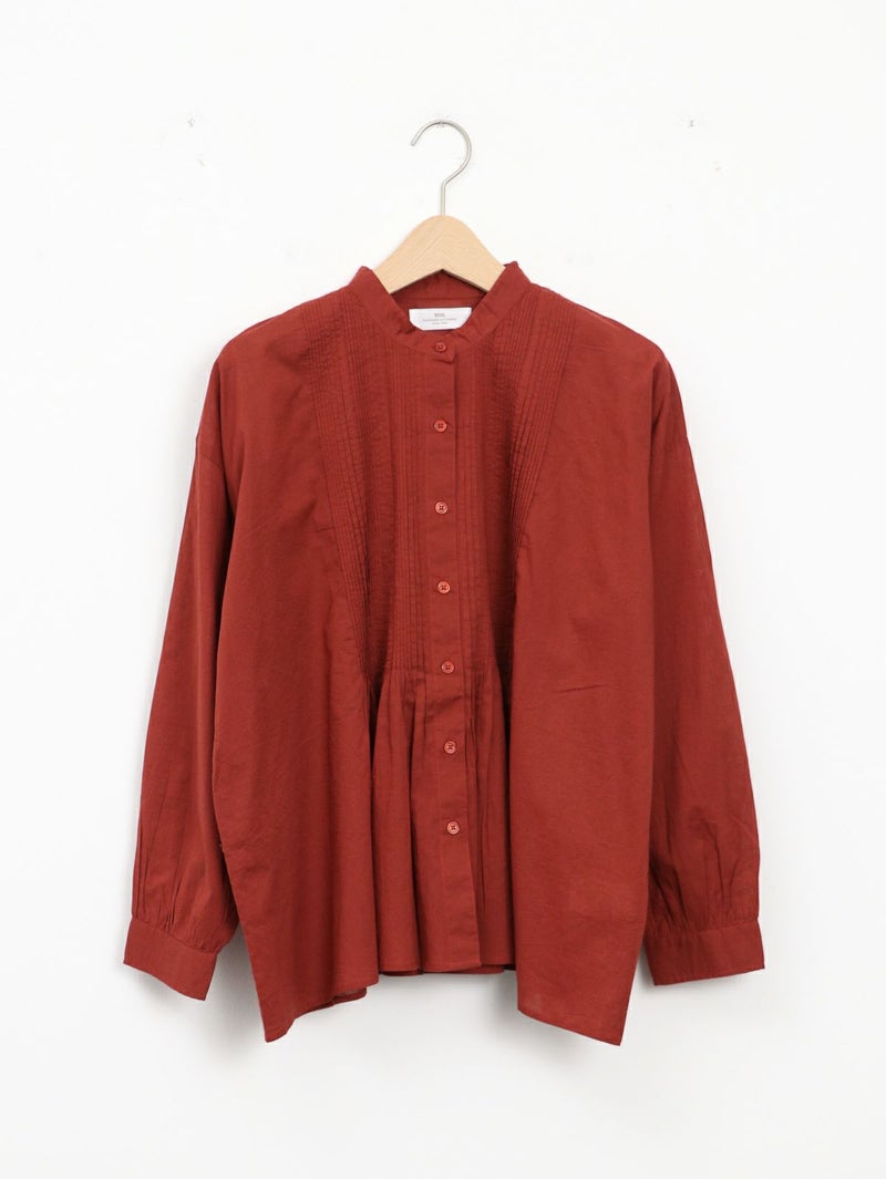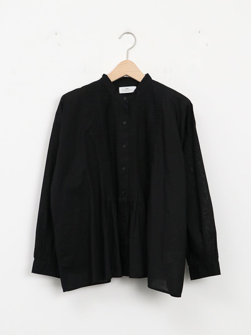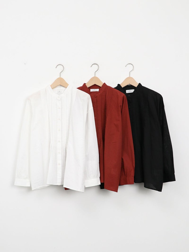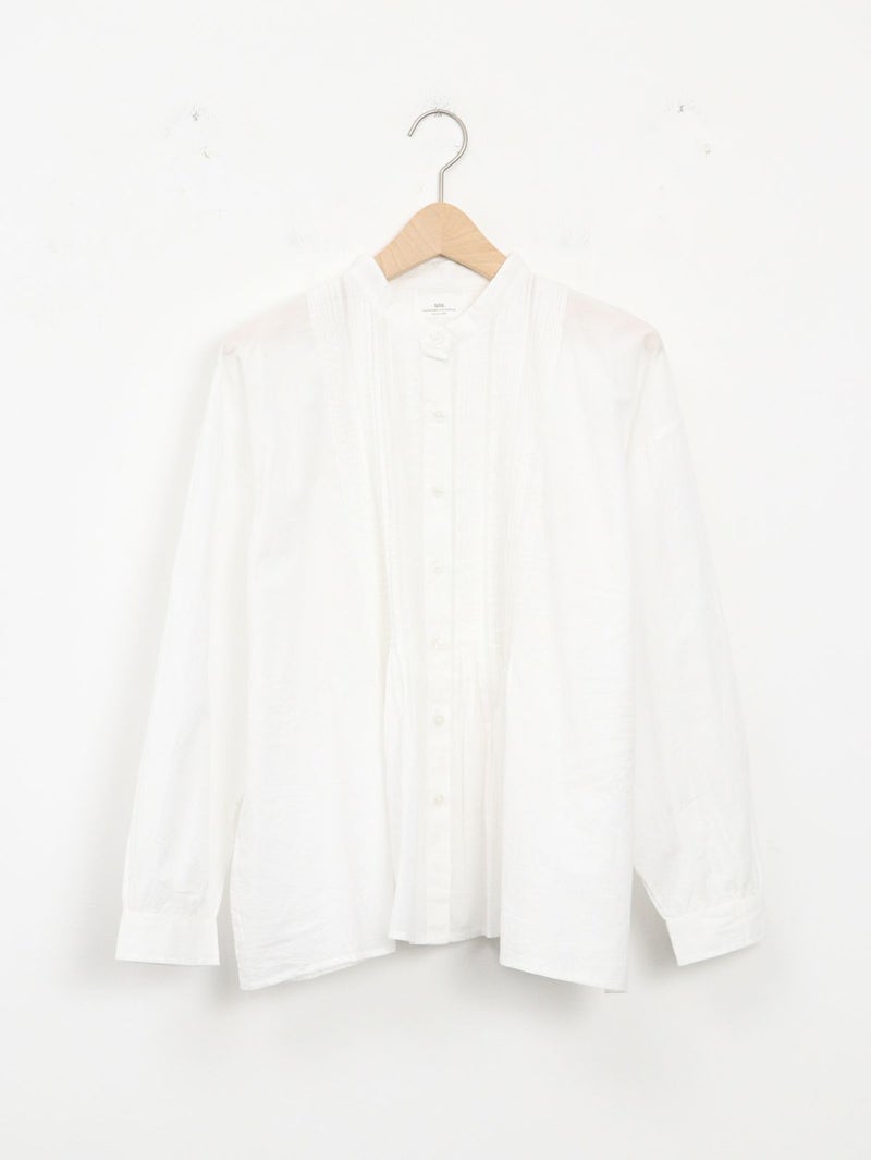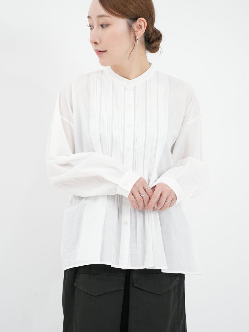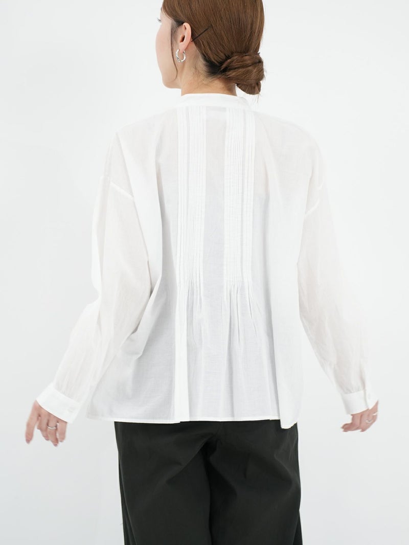 無地の平織り生地にCAMBRIC仕上げを施して、シーズン問わず着回せる柔らかな肌触りが魅力。前後に施されたピンタックで広がりすぎず、袖口部分にはふんわりとギャザーがあしらわれた、優しい雰囲気の1枚です。