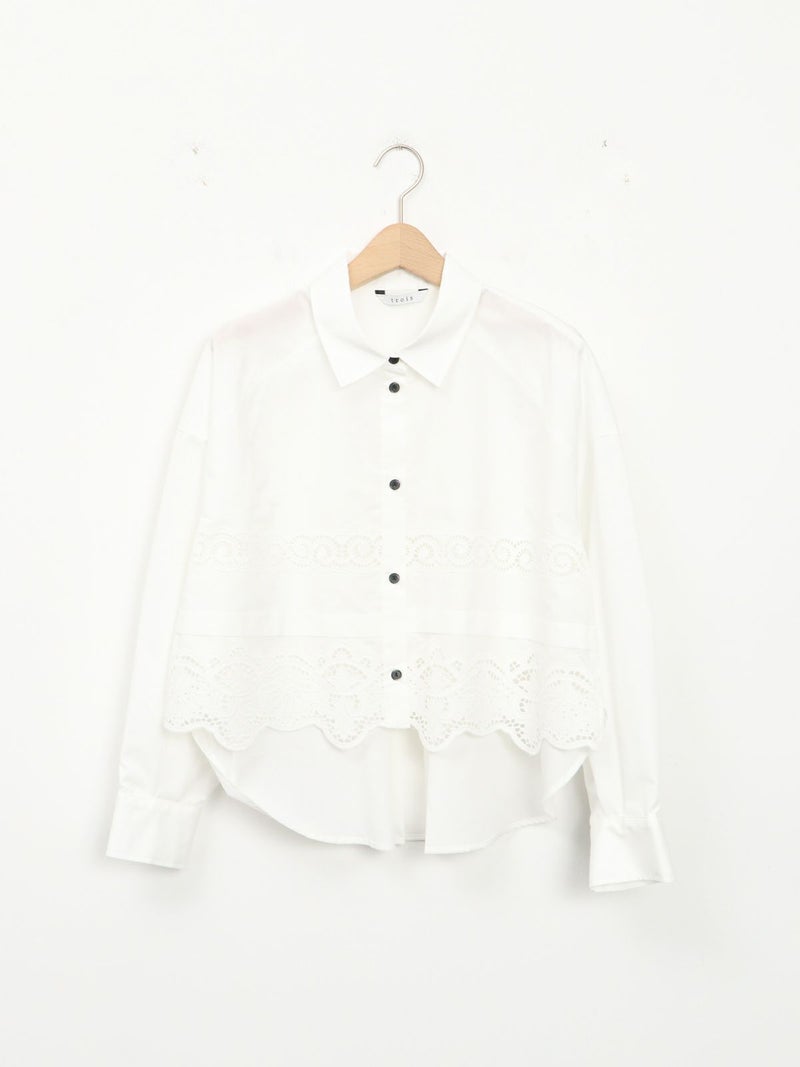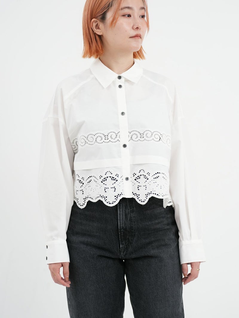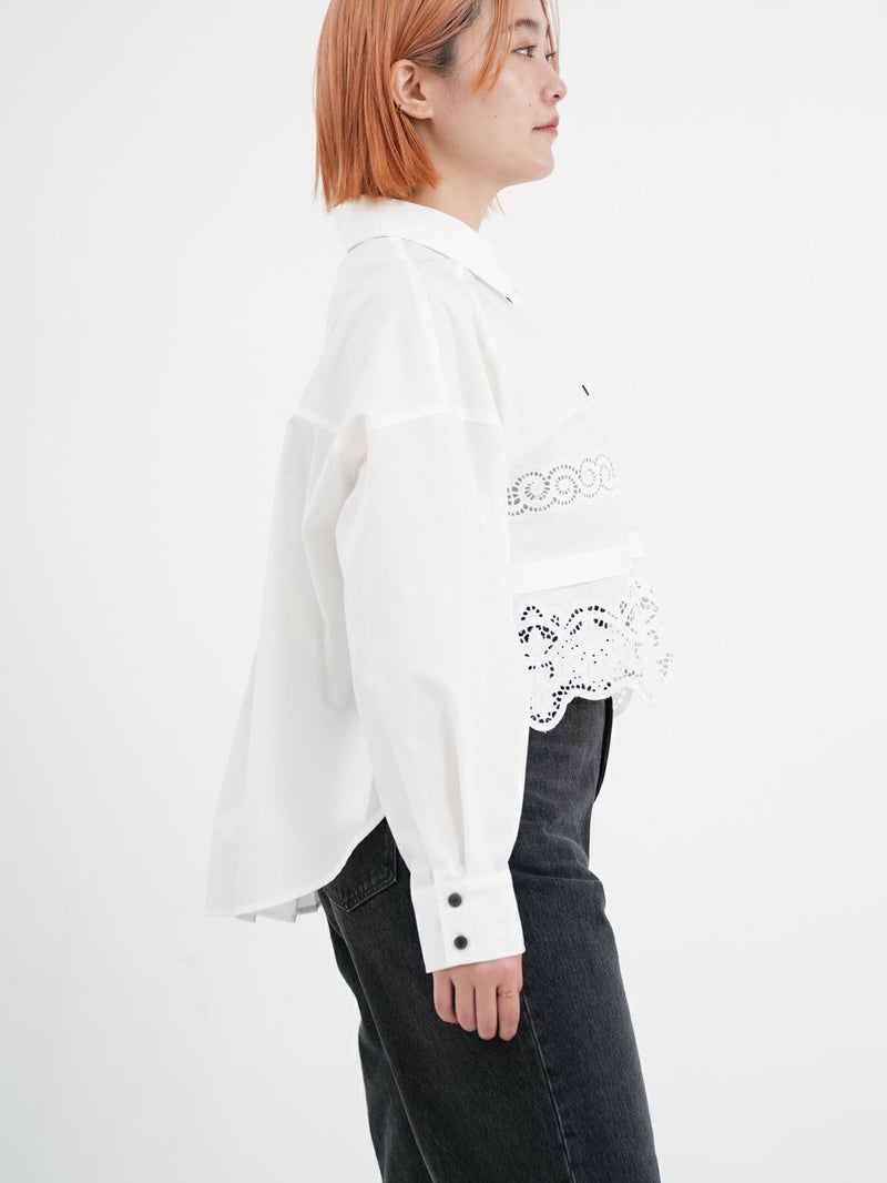 オリジナルの刺繍レースを使った一枚でサマになる主役級ブラウス。 程よいショート丈でジャケットやカーディガンとのコーデも◎フロントの刺繍レースが春コーデにぴったりの一枚。ゆったりとしたサイズ感も嬉しいポイントです。