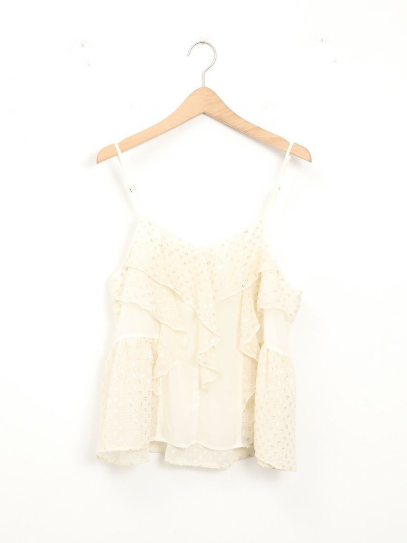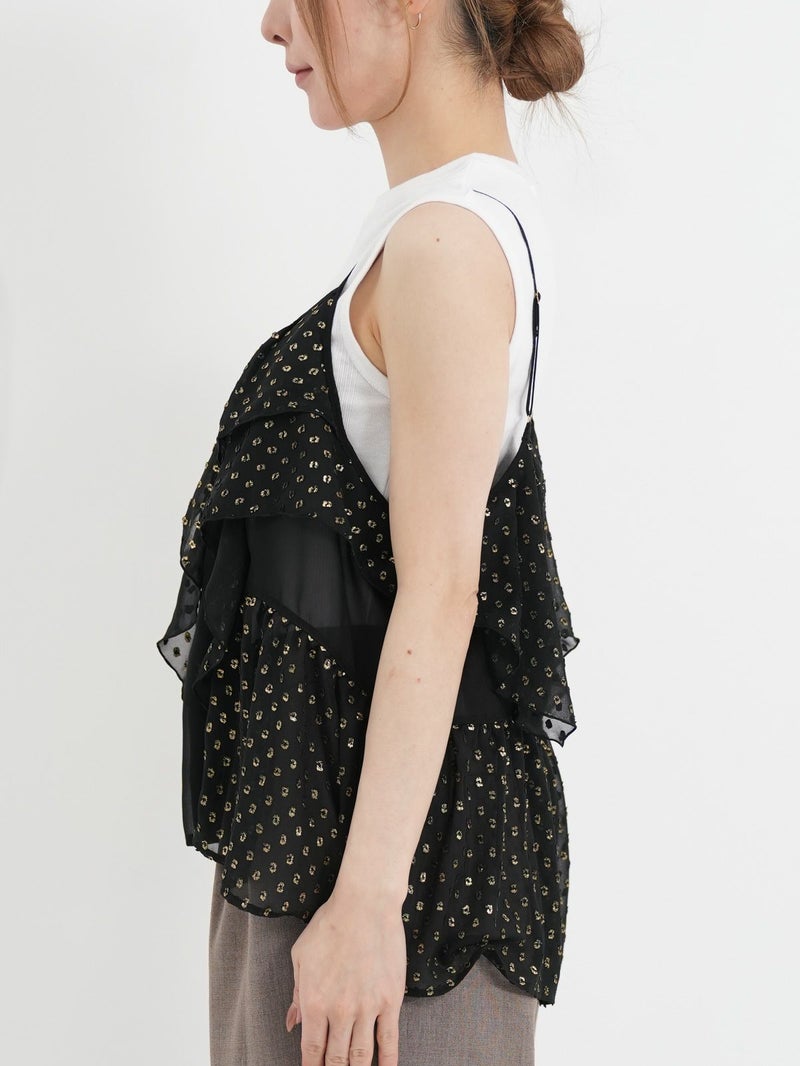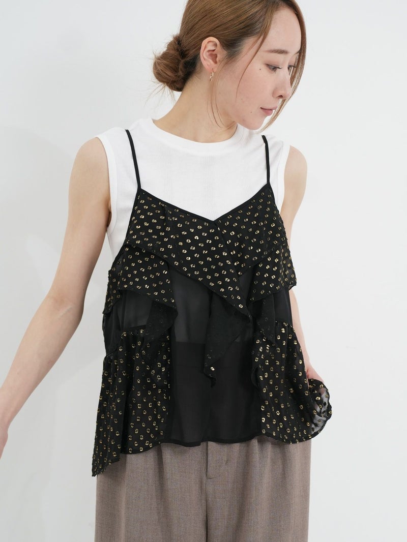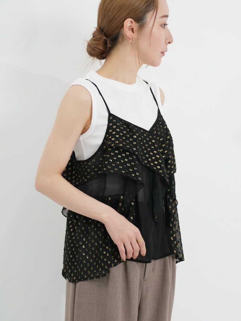 薄く柔らかいドット柄のジャガードと無地のシフォンを使ったキャミソール。 Tシャツなどのカットソーに重ねてシンプルすぎる着こなしにアクセントの1枚です。