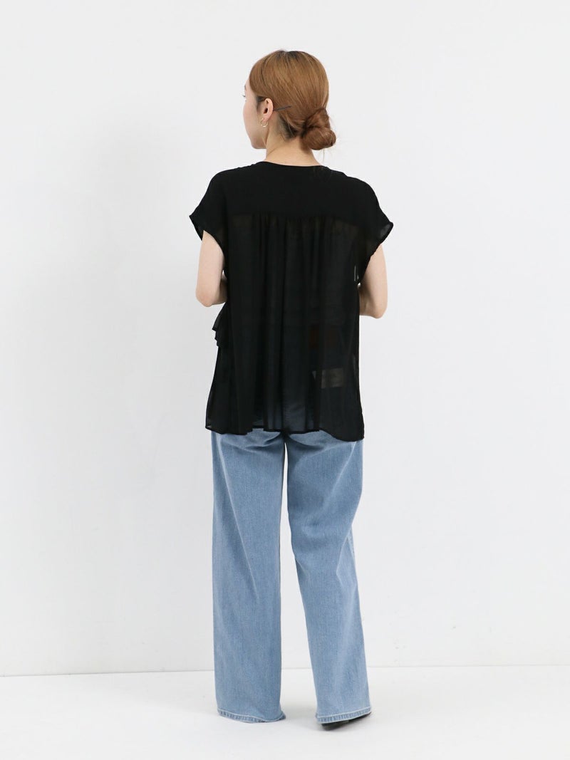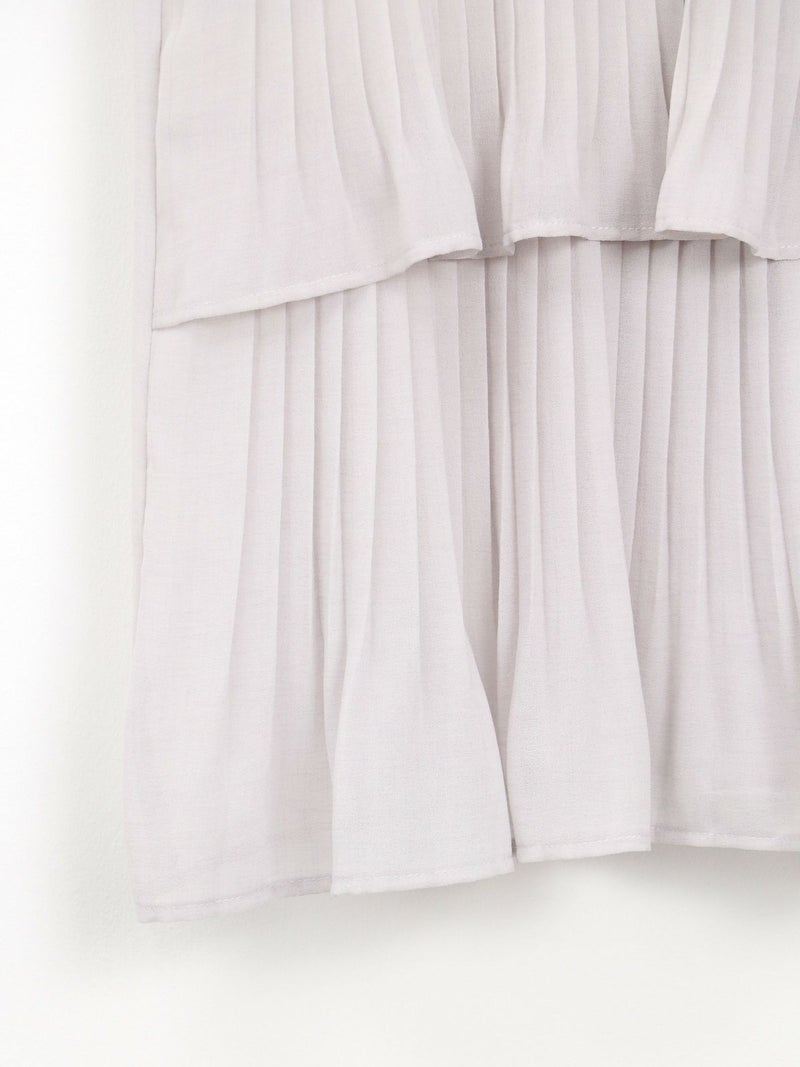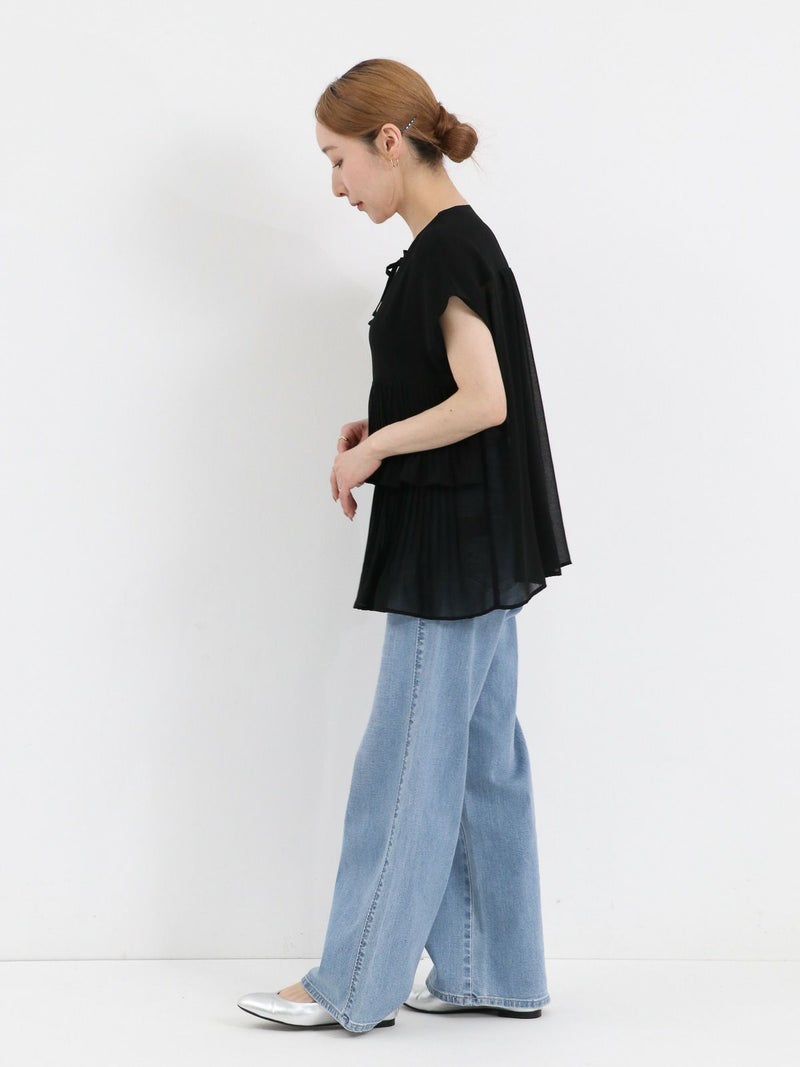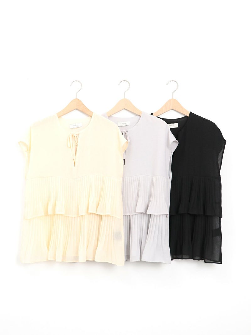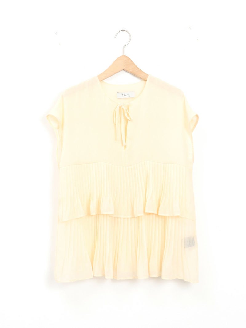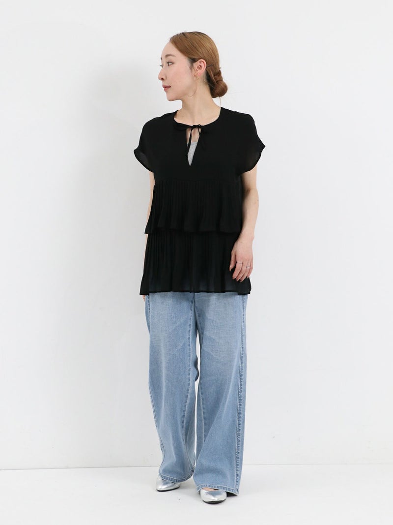 繊細なプリーツ加工とティアードデザインが魅力のフェミニンブラウス。 軽やかな素材でふんわりとしたシルエットが女性らしさを引き立てます。ON/OFF問わずに活躍します。