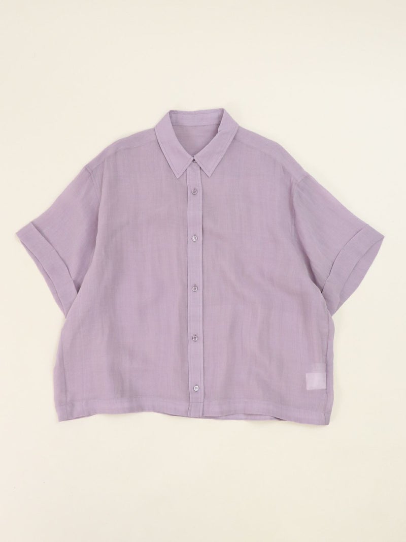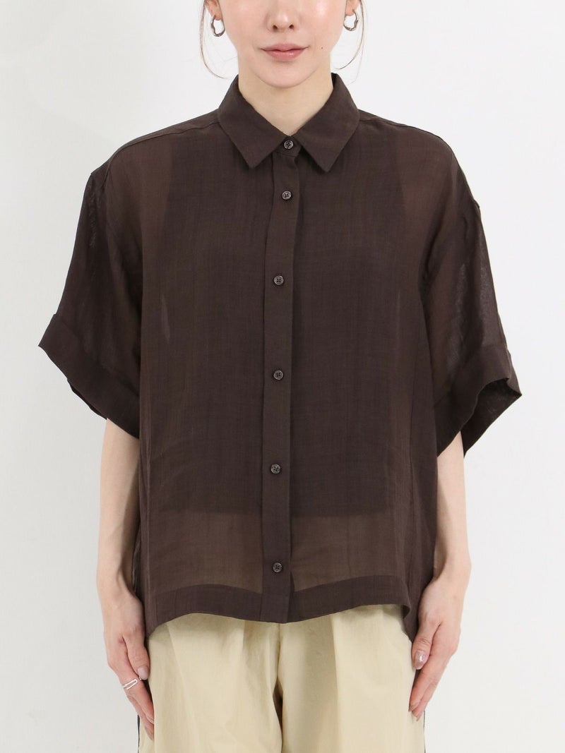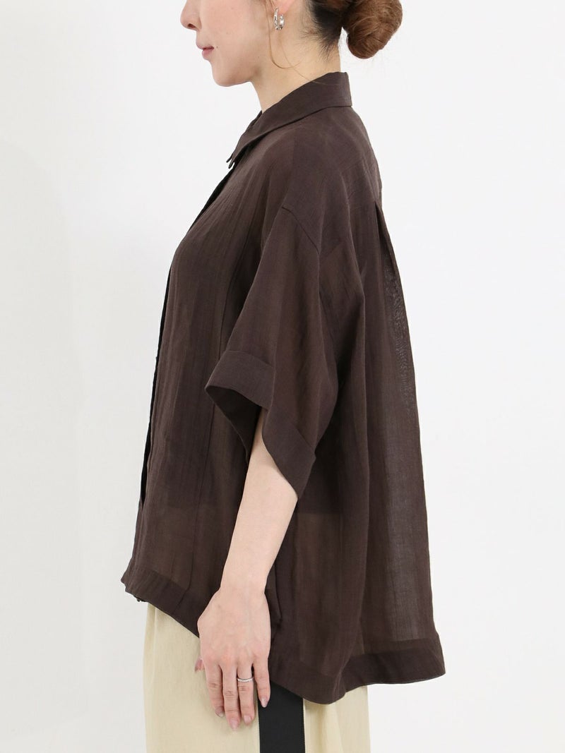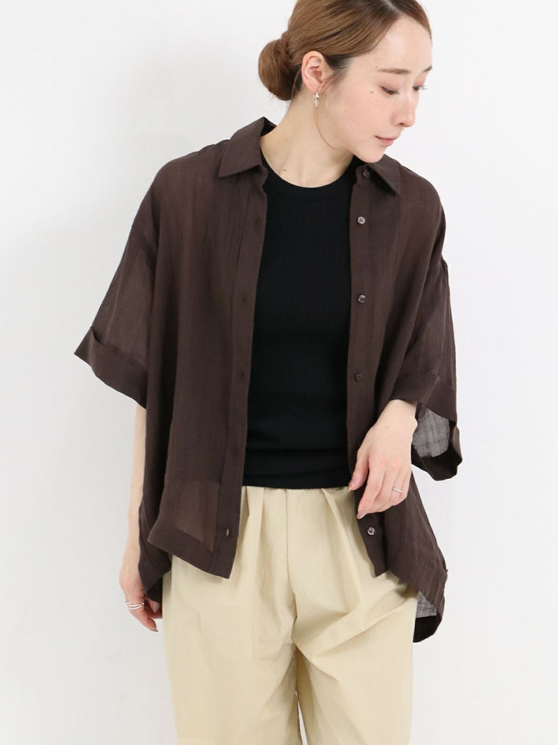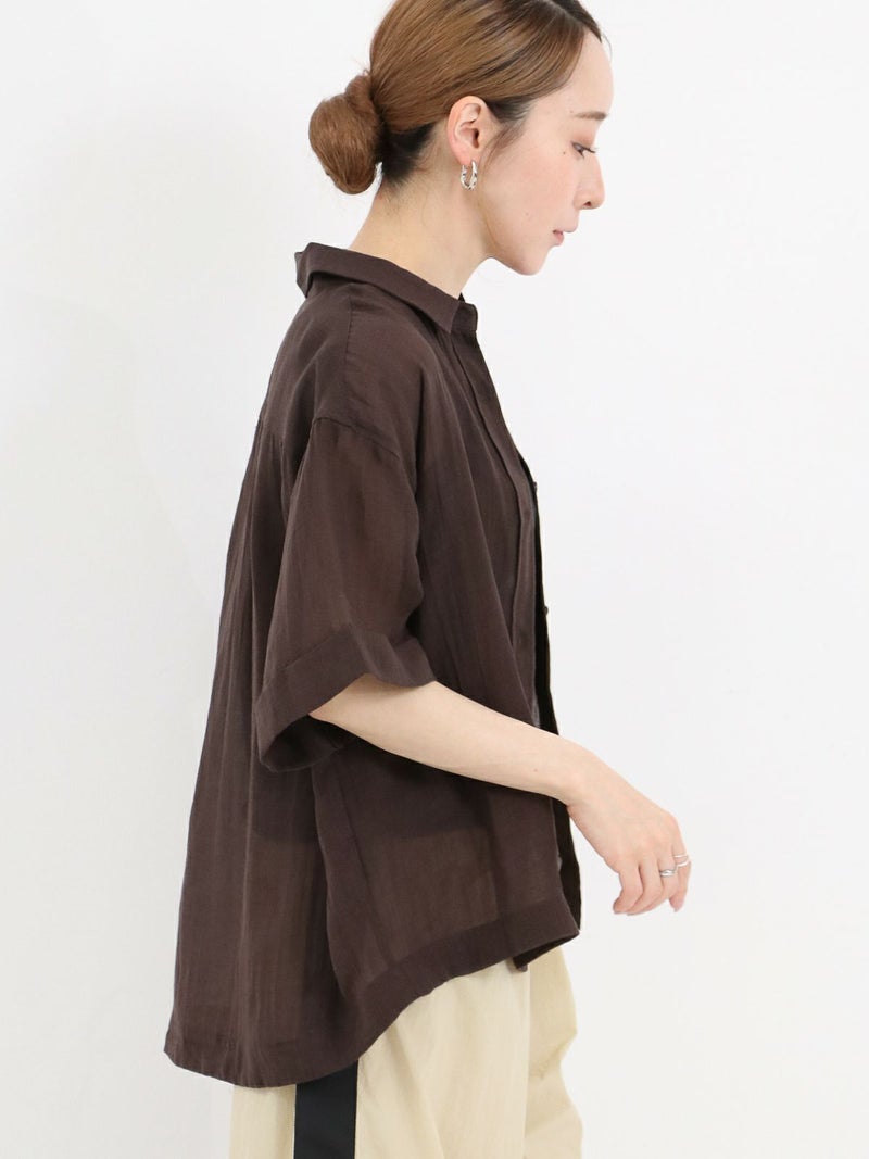 リネンの入ったシアー感のあるハーフスリーブシャツ。 少し透ける感じが涼し気な印象に。ゆとりのあるサイジングで1枚でも羽織でもサマになります。