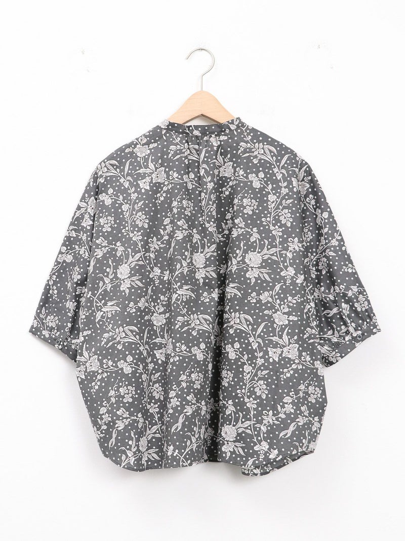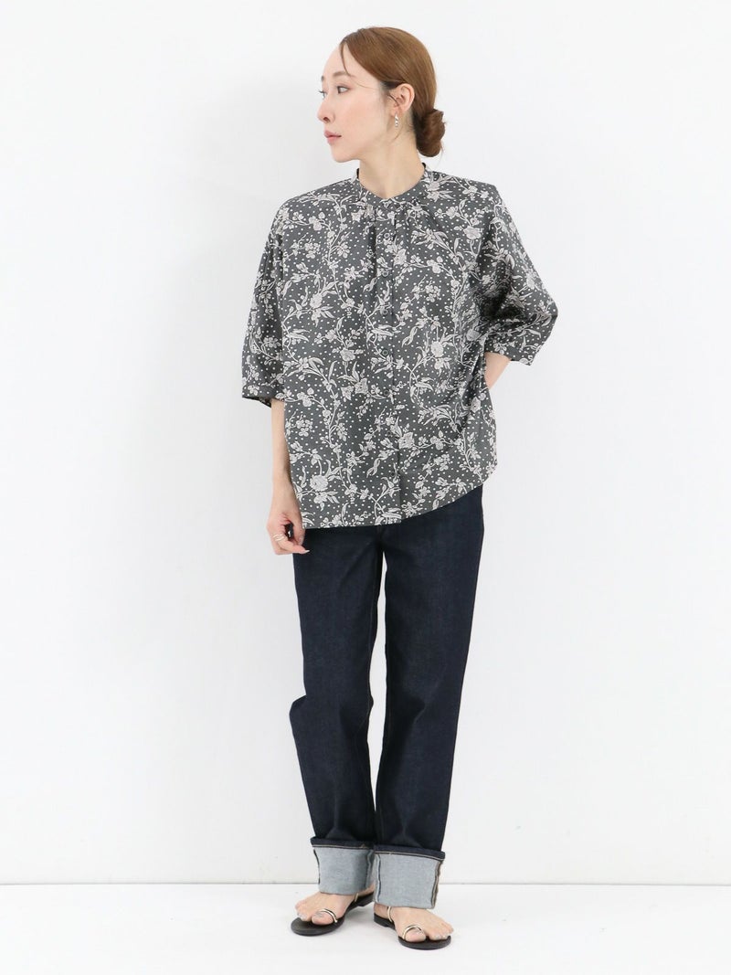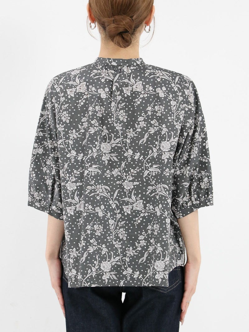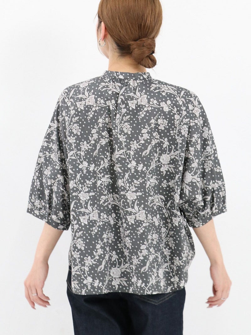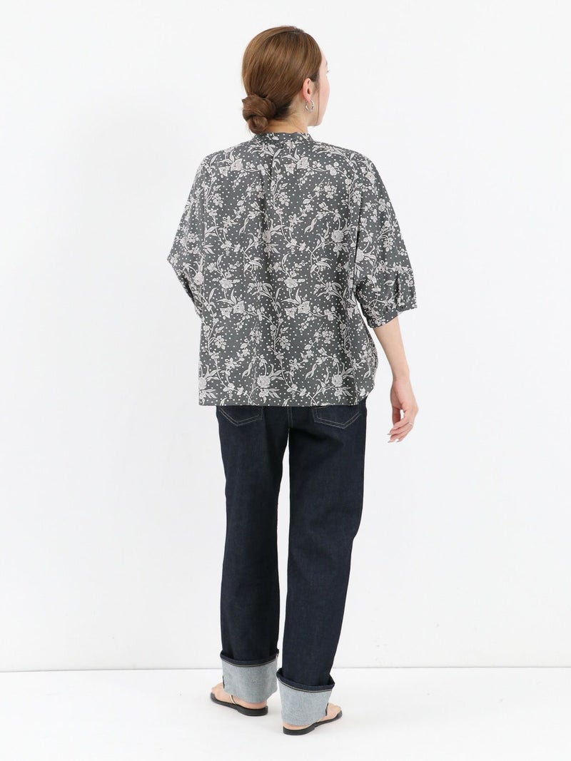 華やかなリバティプリントが着映えするスタンドカラーシャツ。 ゆとりのある身幅と5分袖のドルマンスリーブはゆったりとしたシルエットで締め付け感のない着心地です。