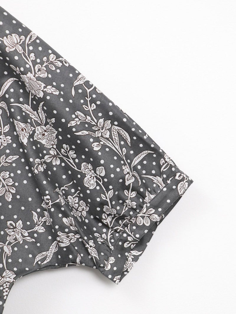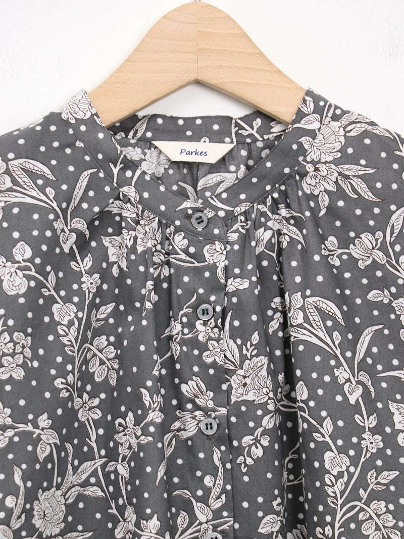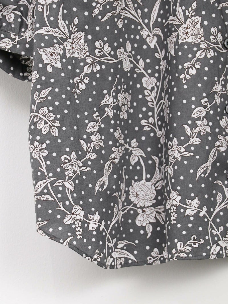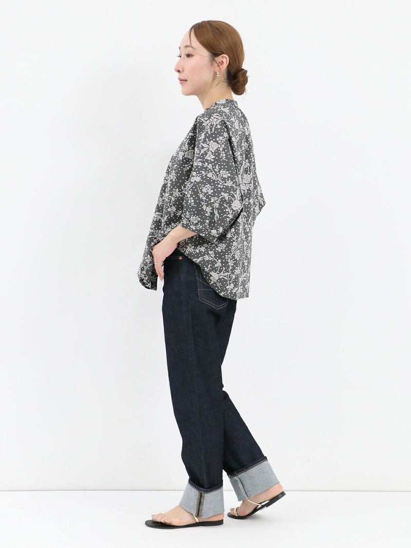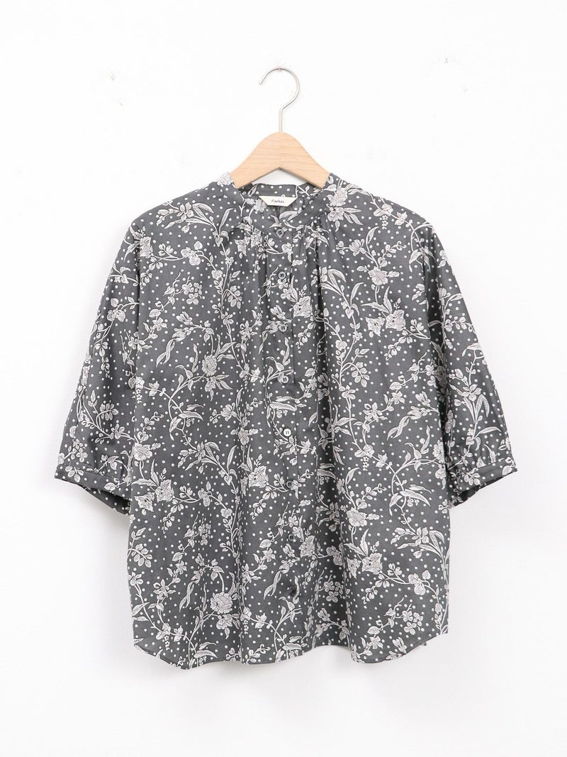 華やかなリバティプリントが着映えするスタンドカラーシャツ。 ゆとりのある身幅と5分袖のドルマンスリーブはゆったりとしたシルエットで締め付け感のない着心地です。
