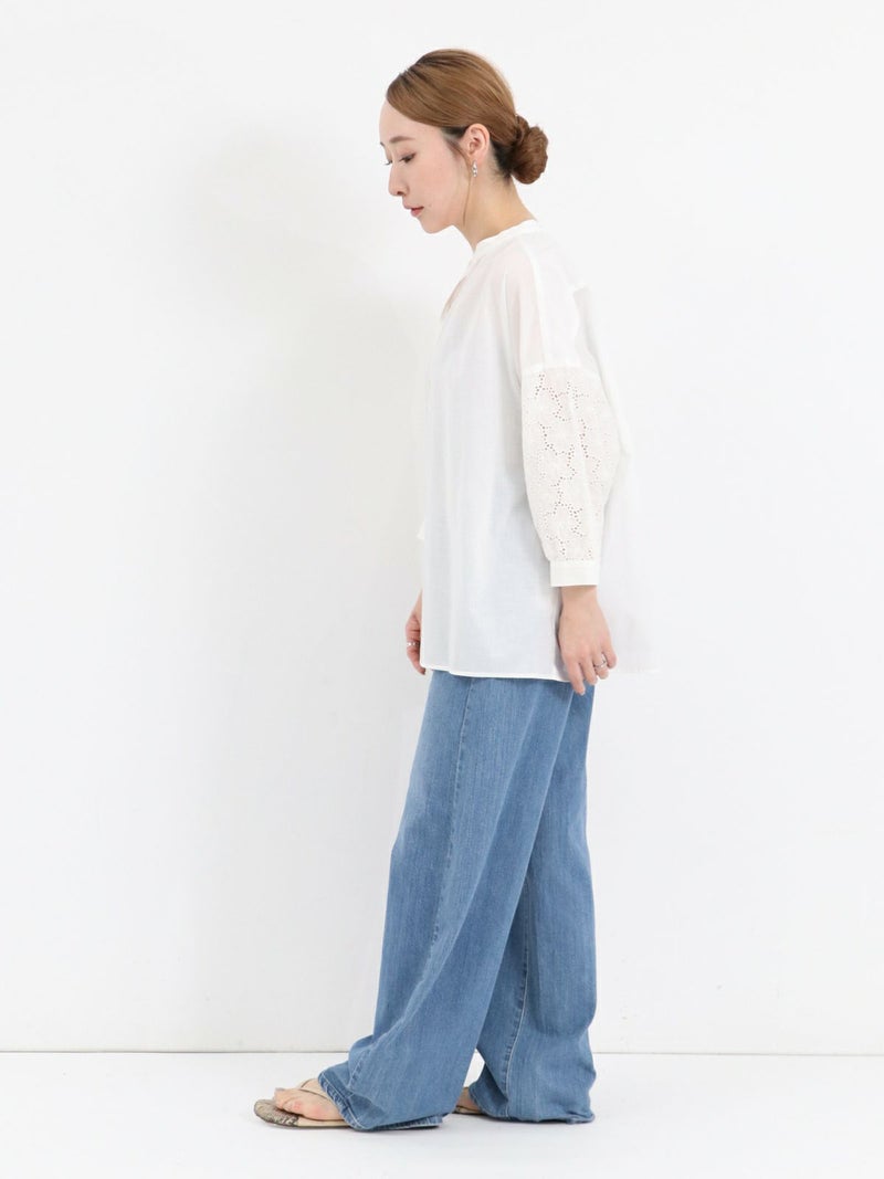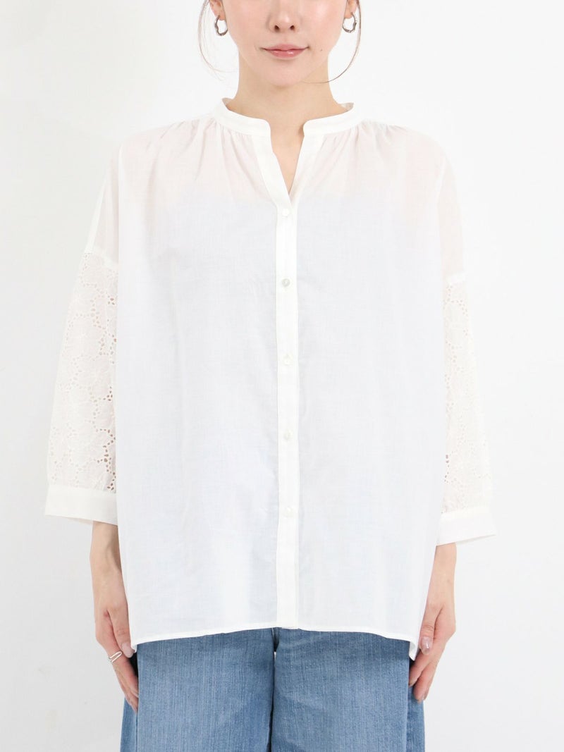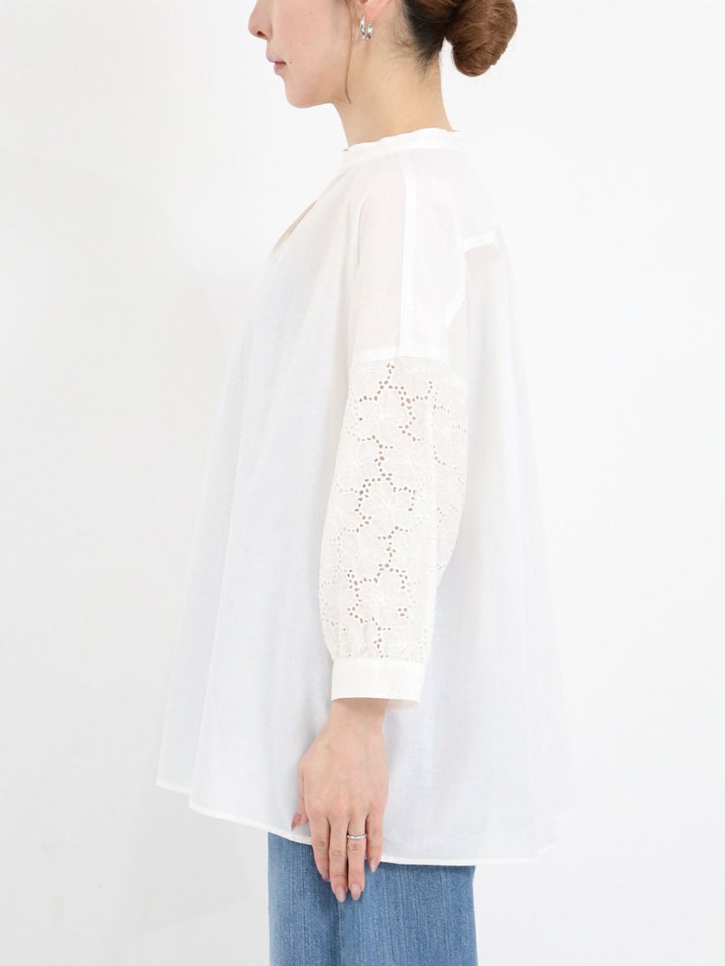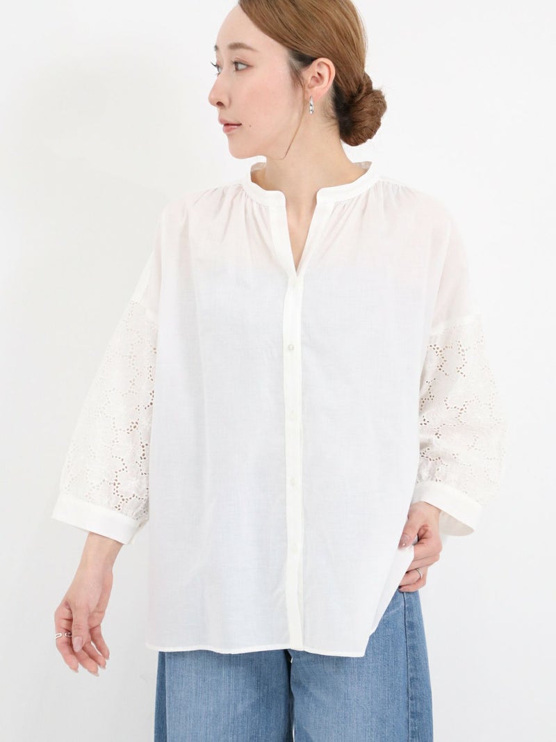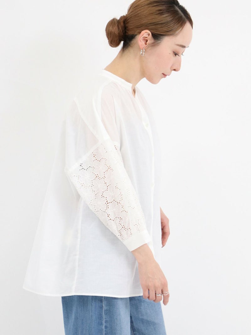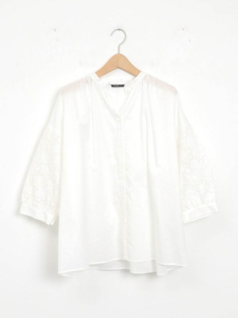 袖のデザインがアクセントになるスキッパーブラウス。 袖のレースはフラワーモチーフで、ボリューム感があります。スキッパータイプなので顔周りすっきりと、やや透け感のあるローン素材ですので、真夏も涼しく着ていただけます。