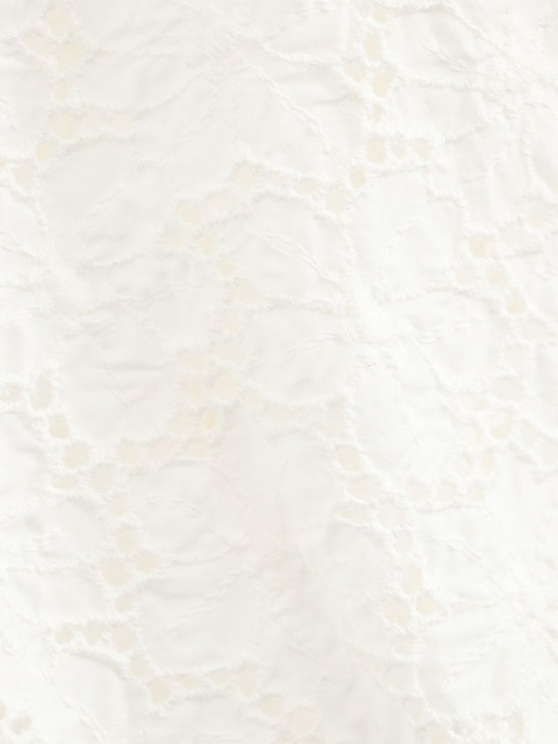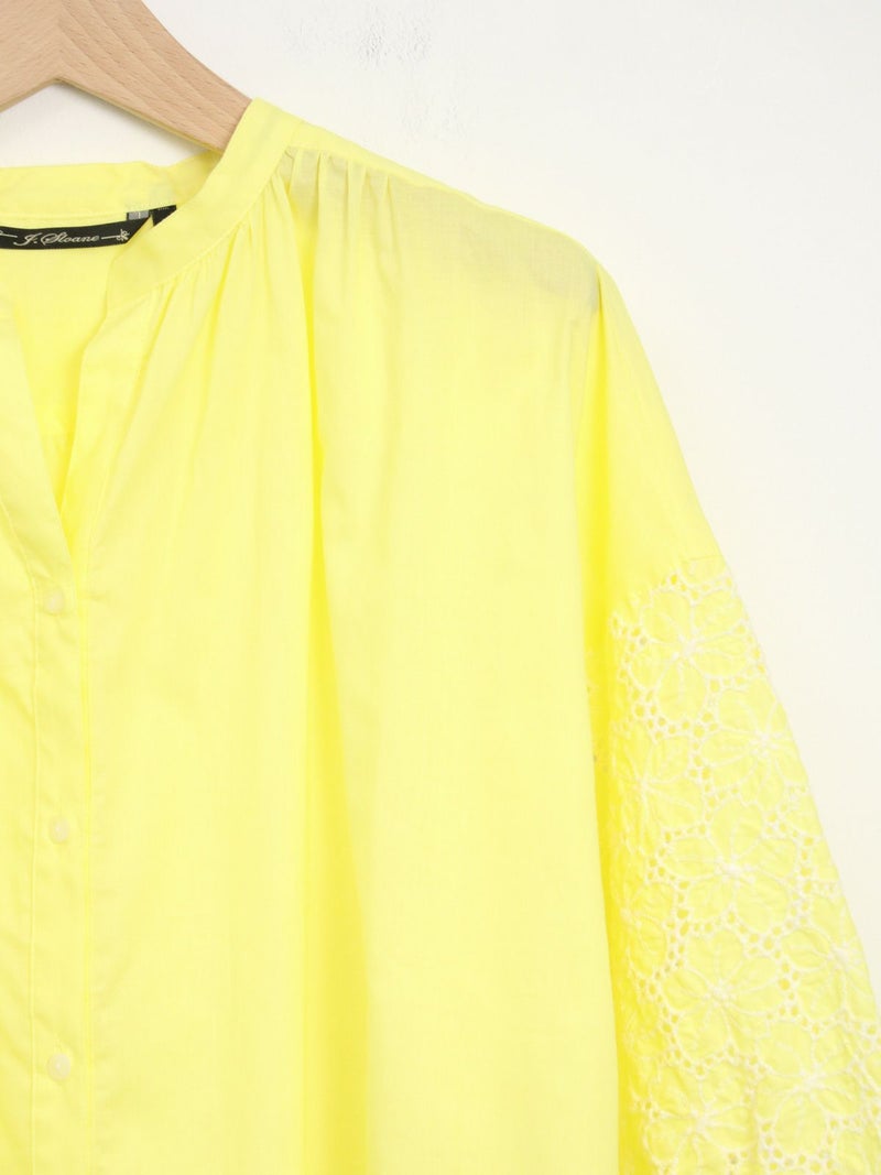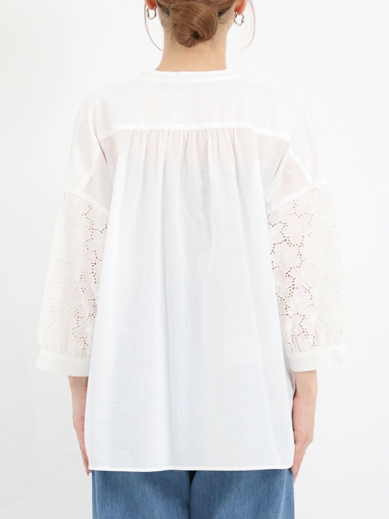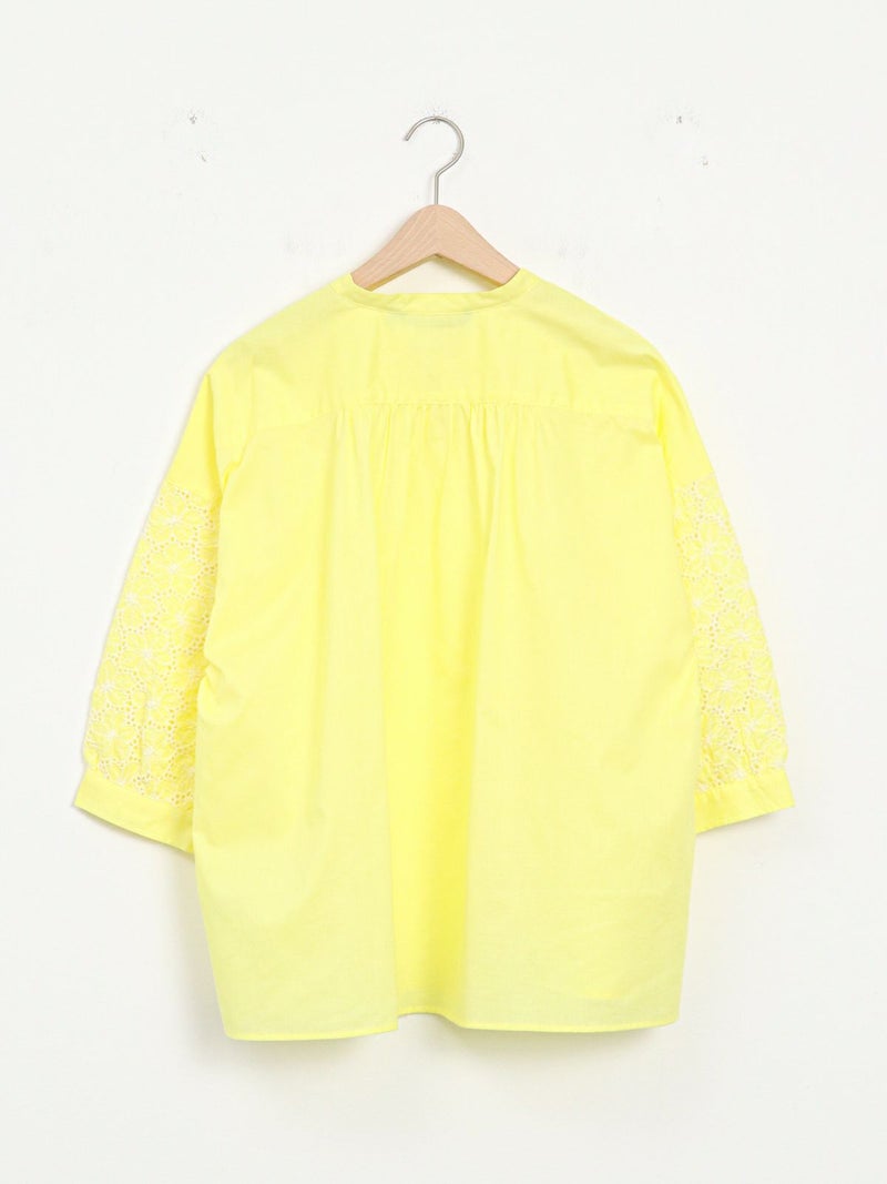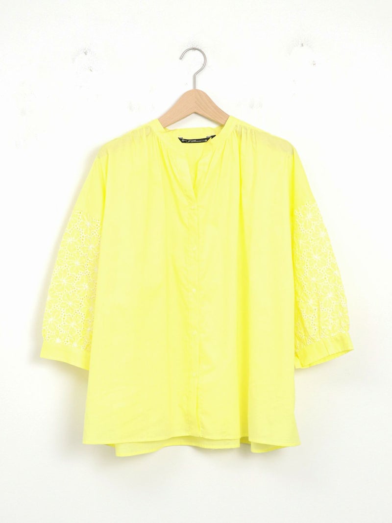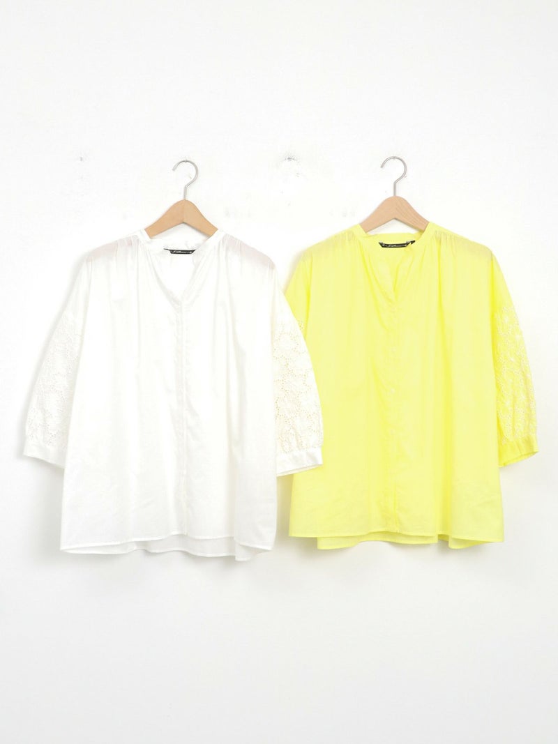 袖のデザインがアクセントになるスキッパーブラウス。 袖のレースはフラワーモチーフで、ボリューム感があります。スキッパータイプなので顔周りすっきりと、やや透け感のあるローン素材ですので、真夏も涼しく着ていただけます。