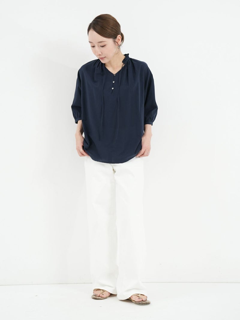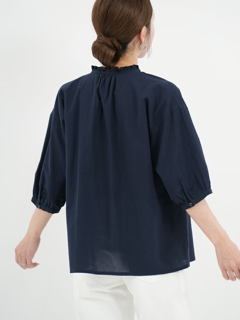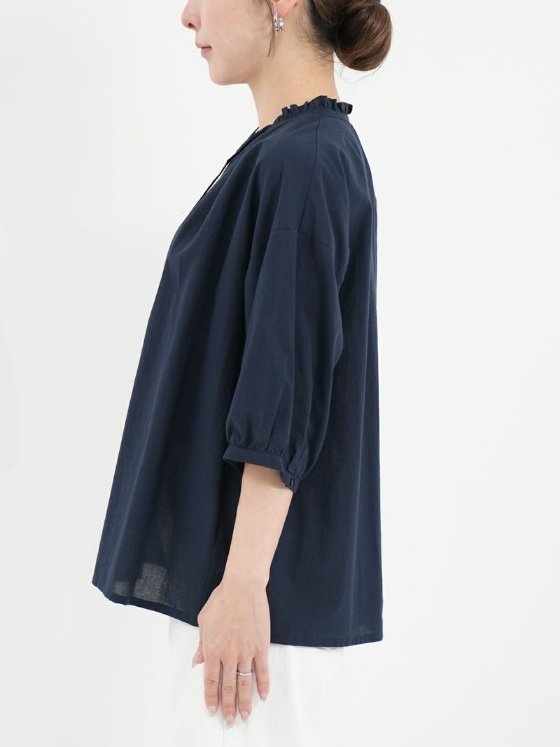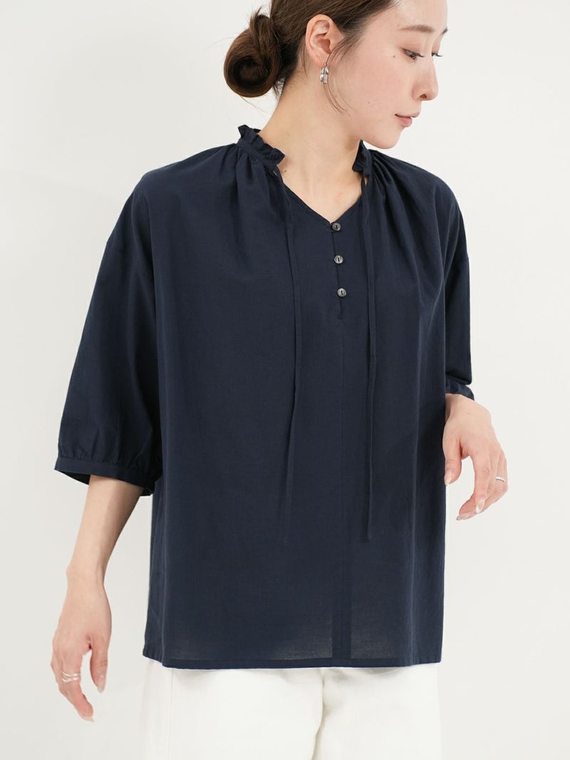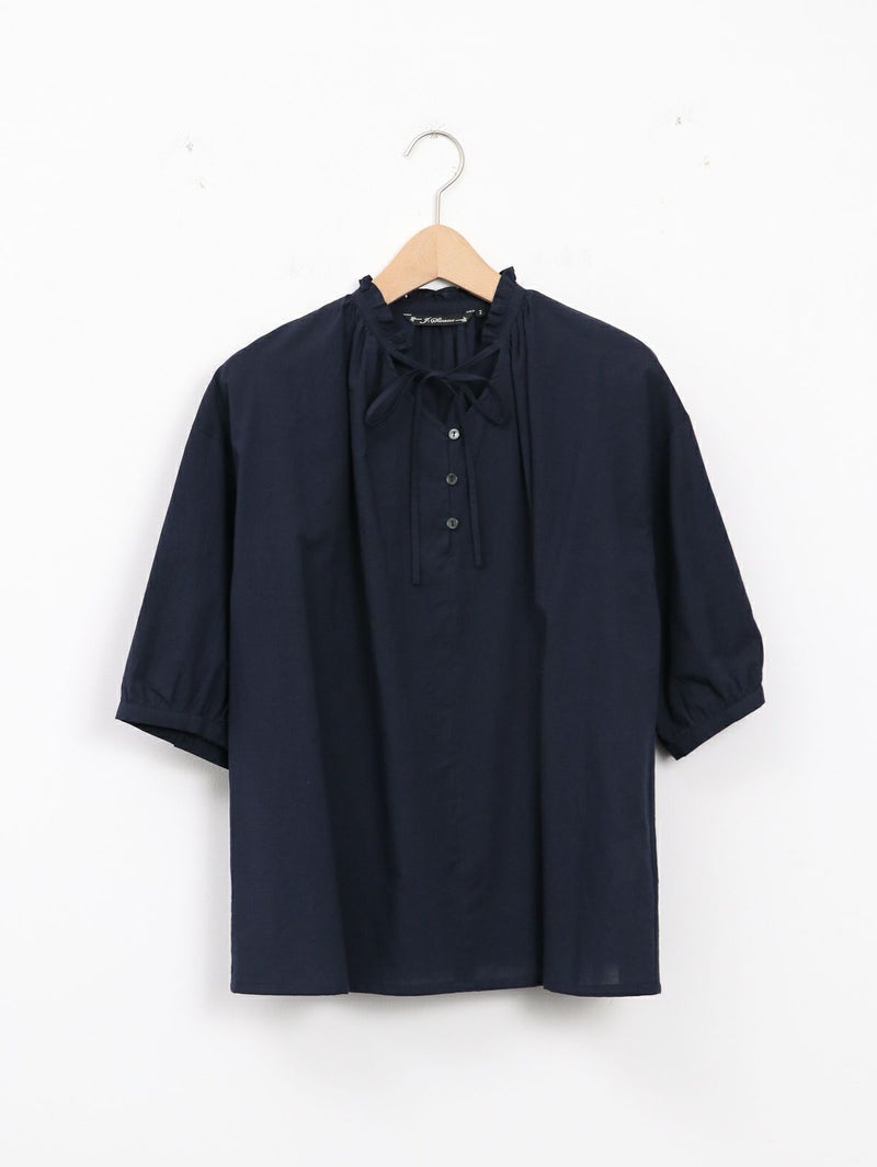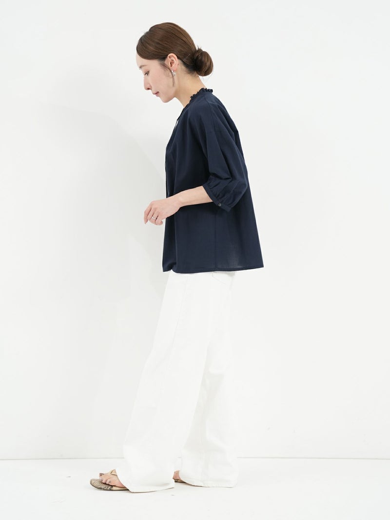 軽く、優しい肌触りの綿ローンを使用したブラウス。 襟元のフリルがさりげないポイントです。リボンは結んでも垂らしても。すっきりとした着丈で、ボトムインせずともバランス良く着ていただけます。