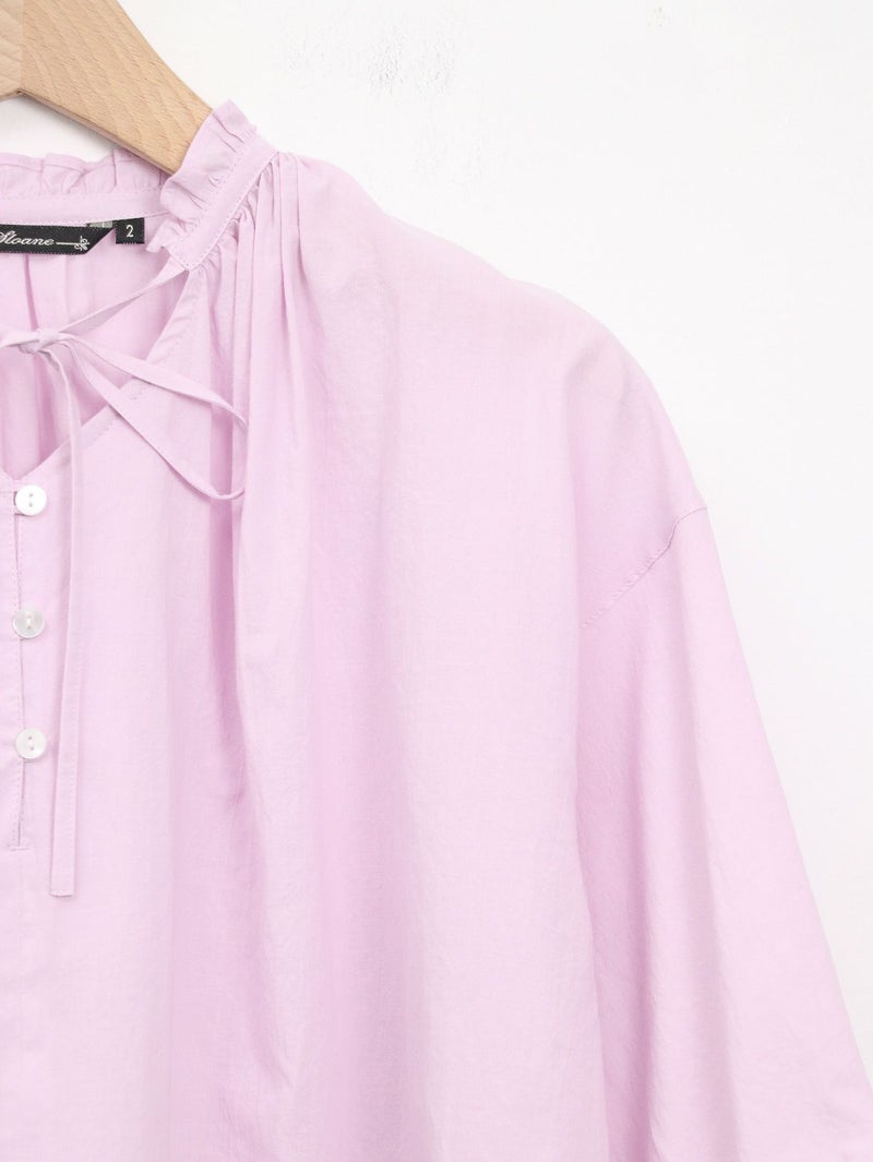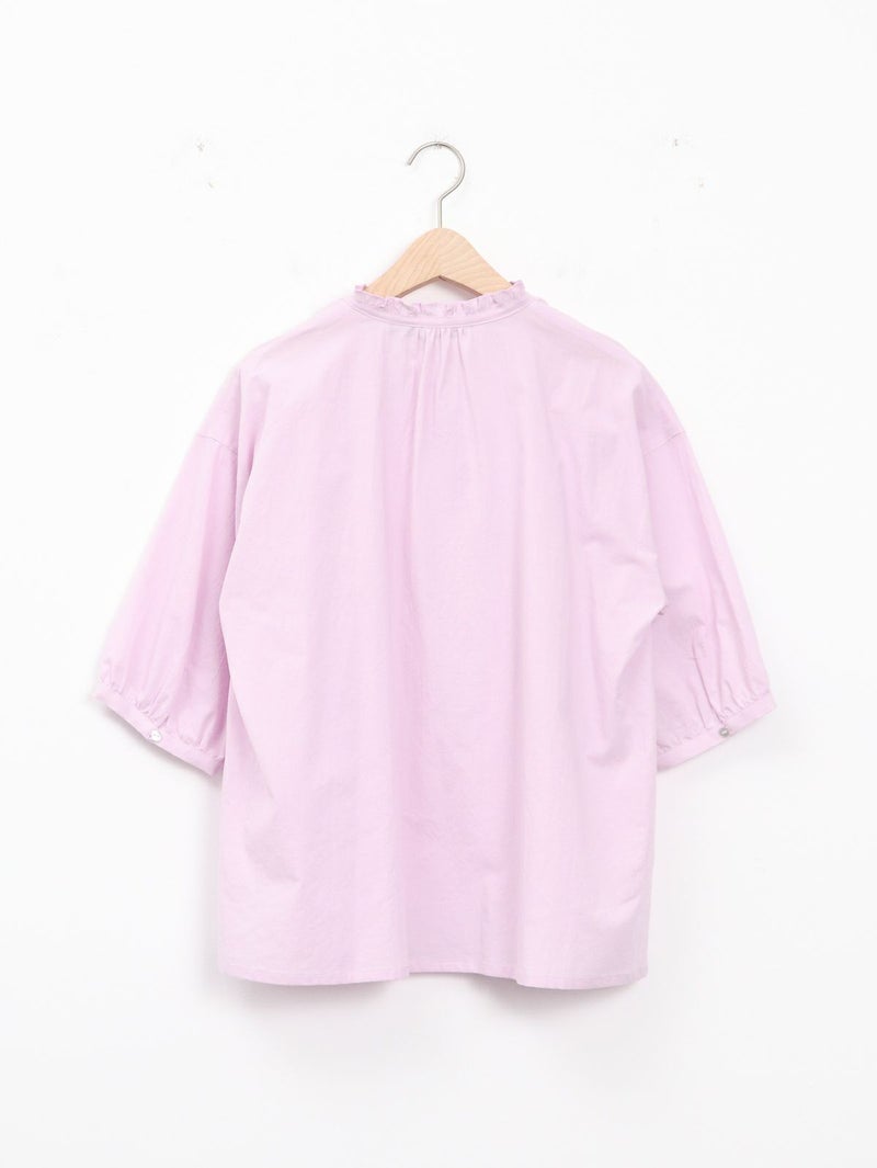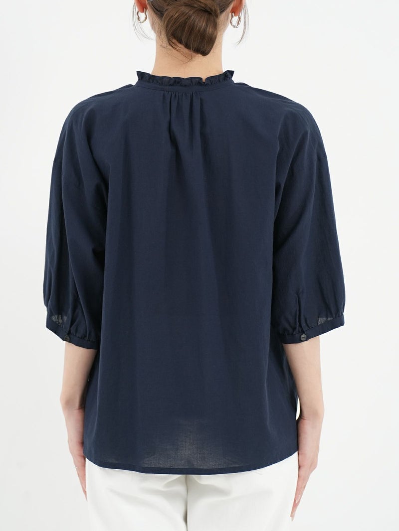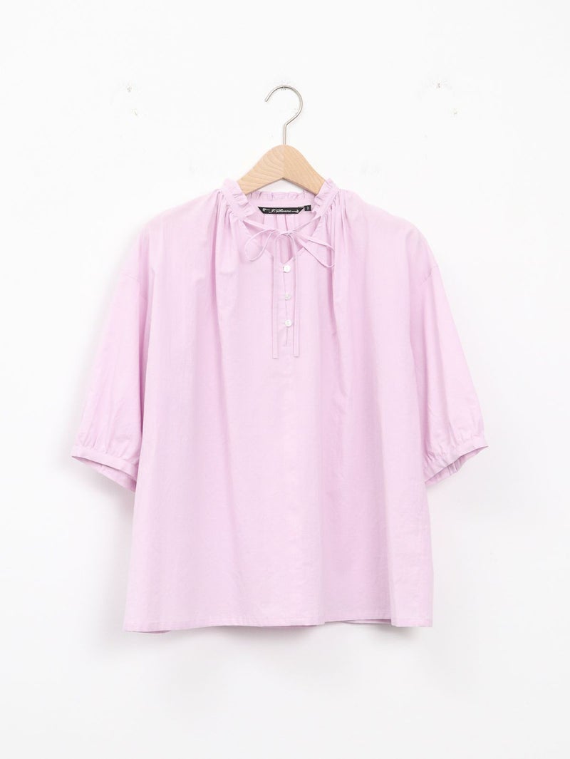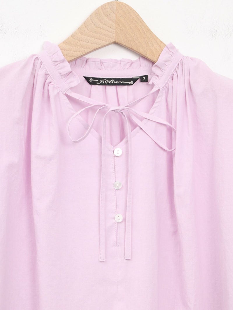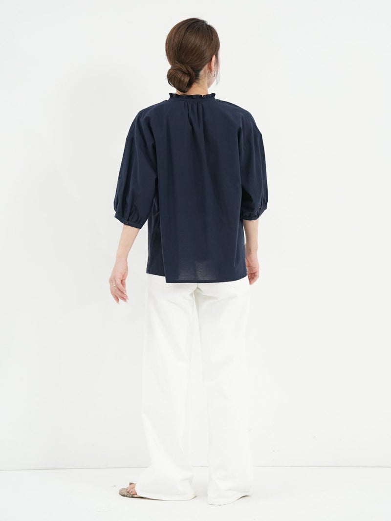 軽く、優しい肌触りの綿ローンを使用したブラウス。 襟元のフリルがさりげないポイントです。リボンは結んでも垂らしても。すっきりとした着丈で、ボトムインせずともバランス良く着ていただけます。