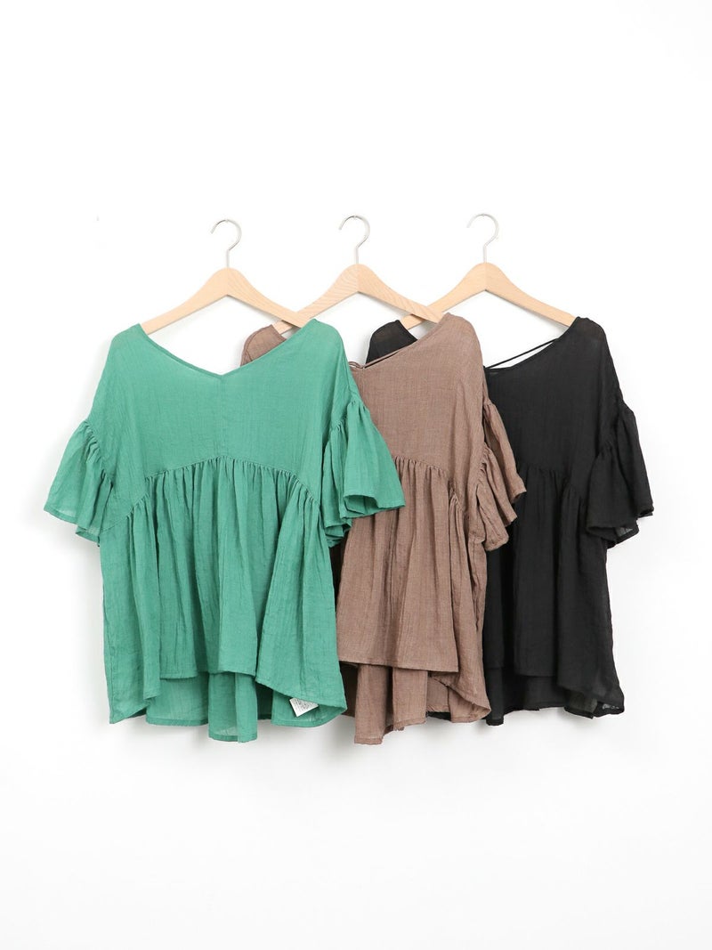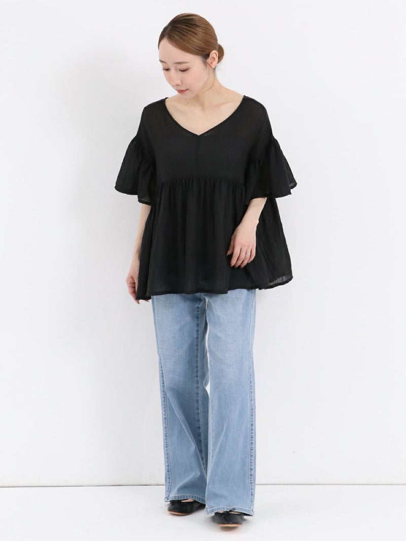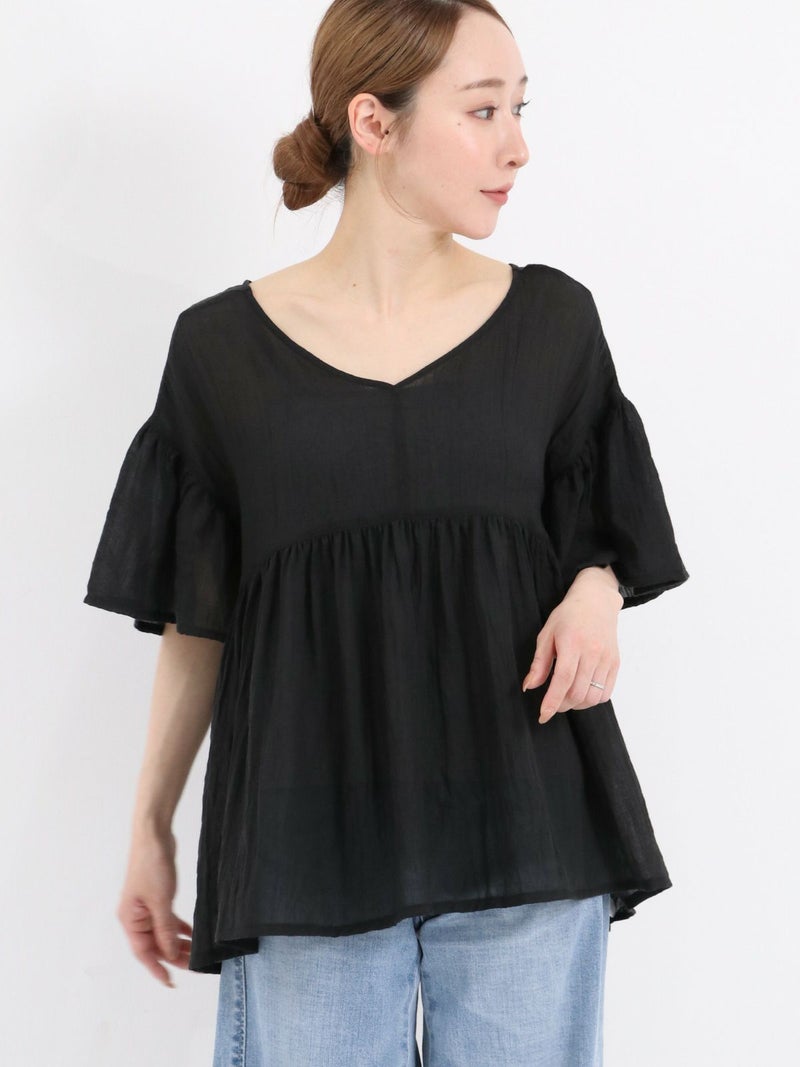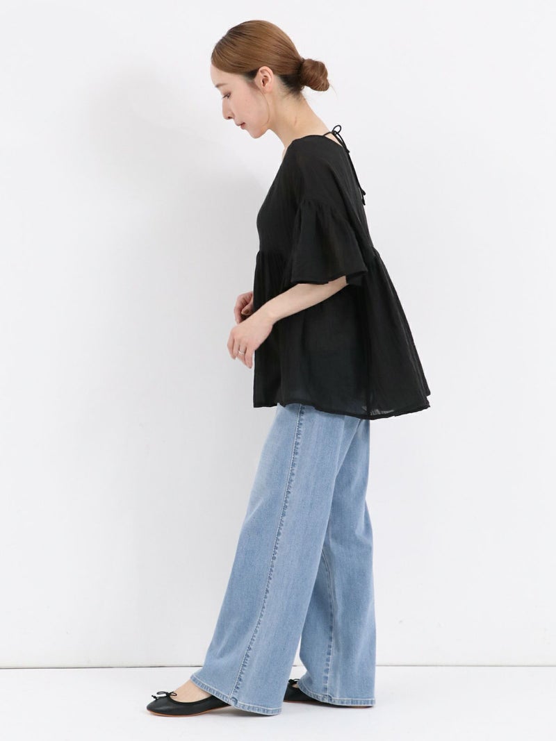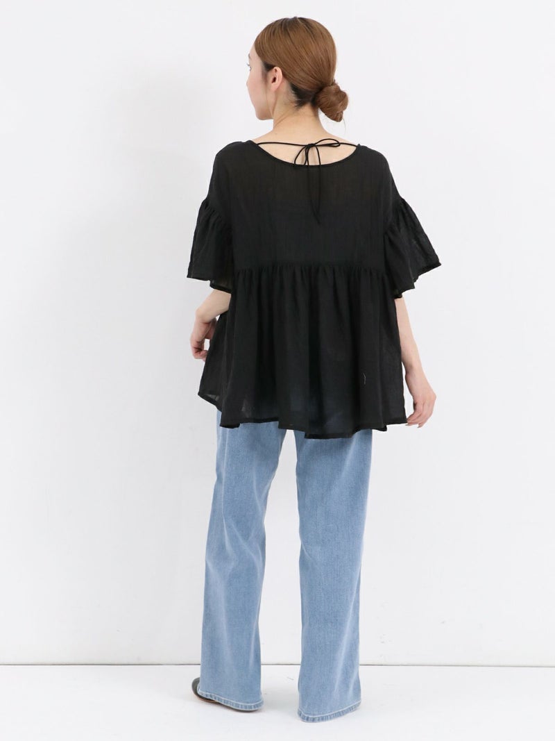 T/Cガーゼを使用したギャザーボリュームブラウス。 軽く清涼感のある素材感と、バックスタイルのリボンがアクセントになります。