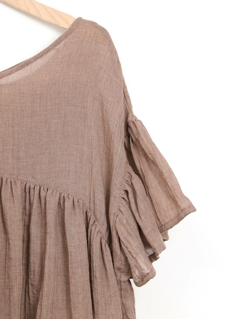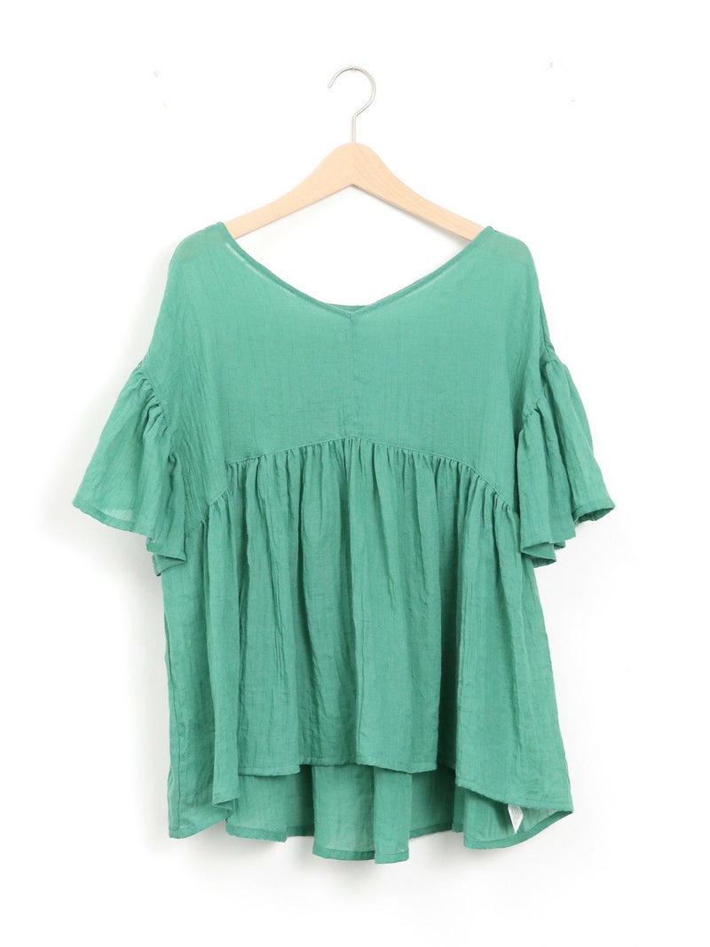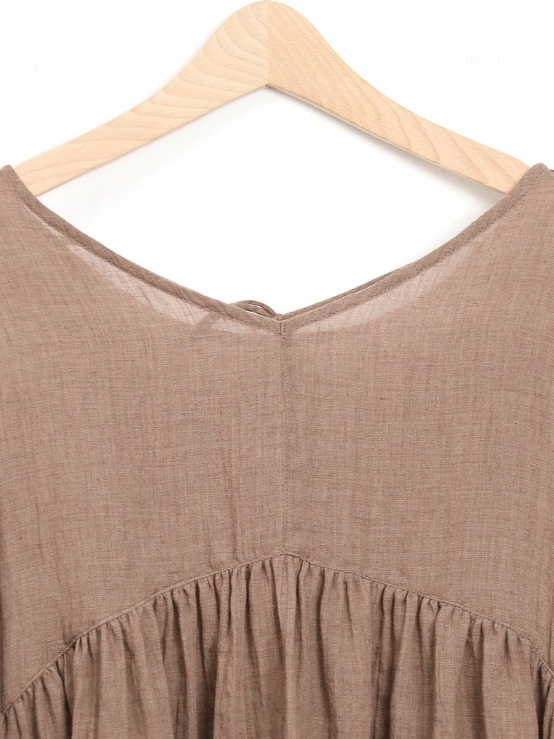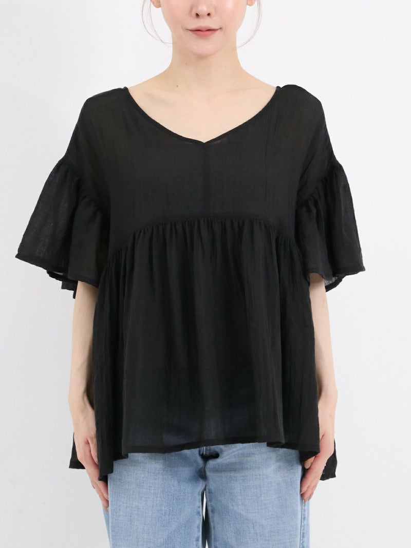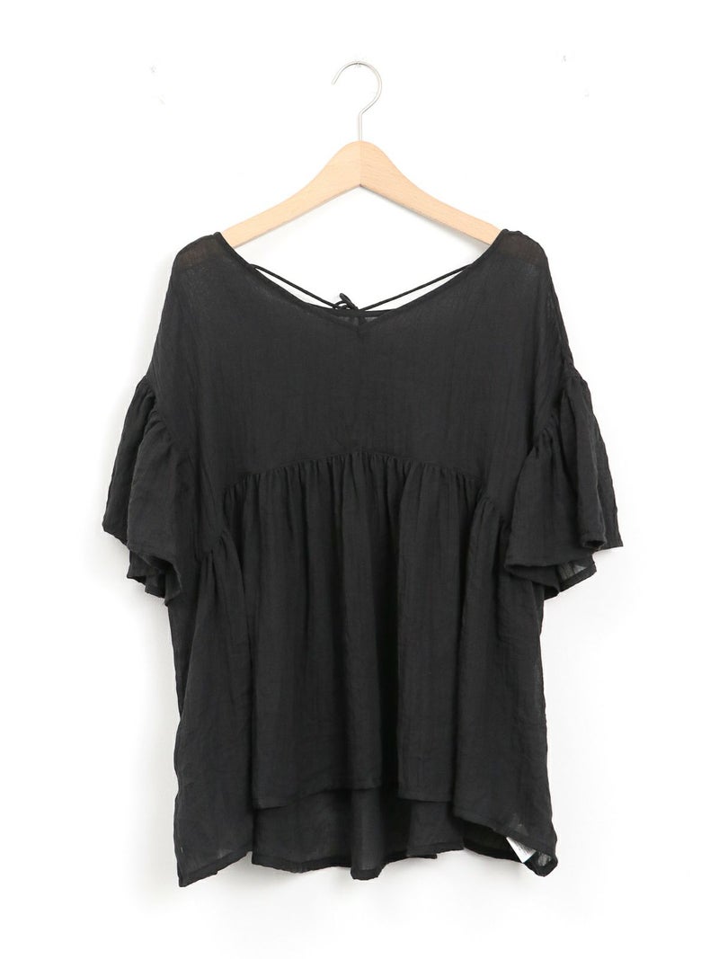 T/Cガーゼを使用したギャザーボリュームブラウス。 軽く清涼感のある素材感と、バックスタイルのリボンがアクセントになります。