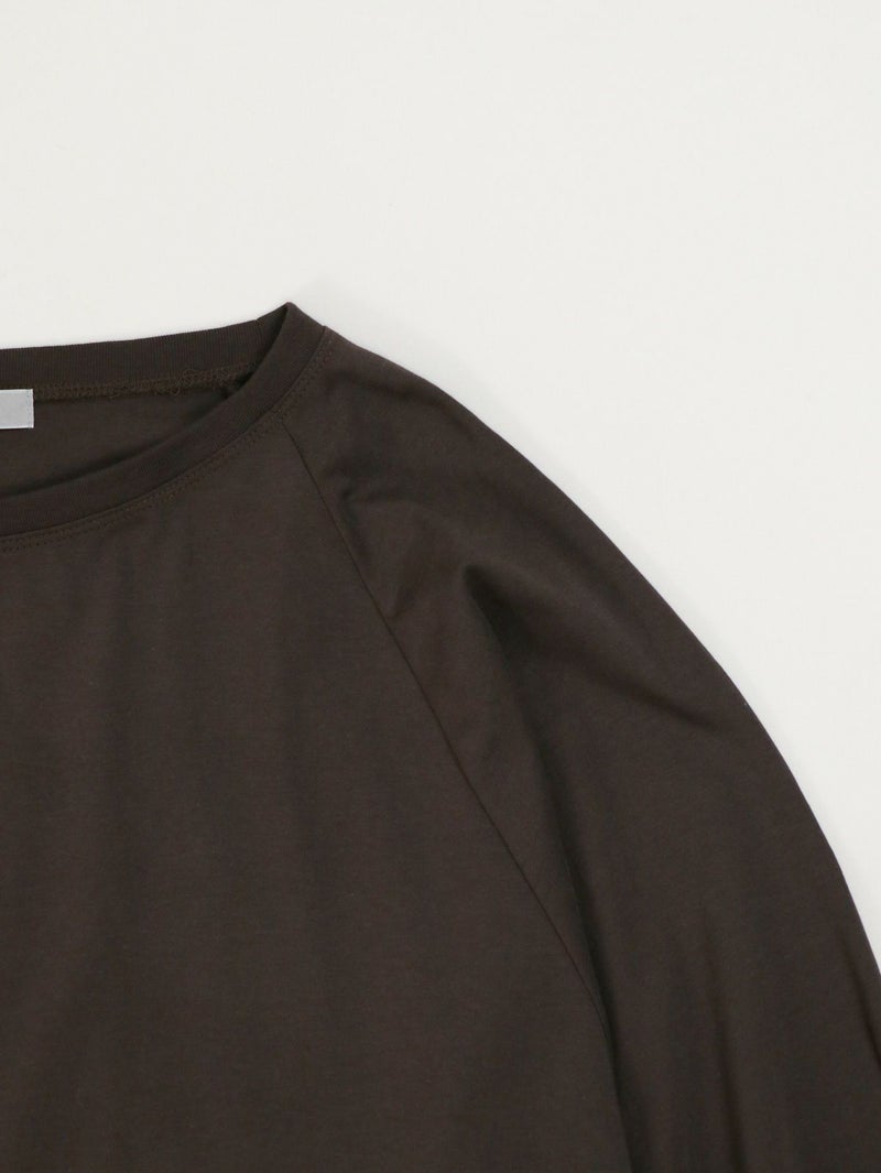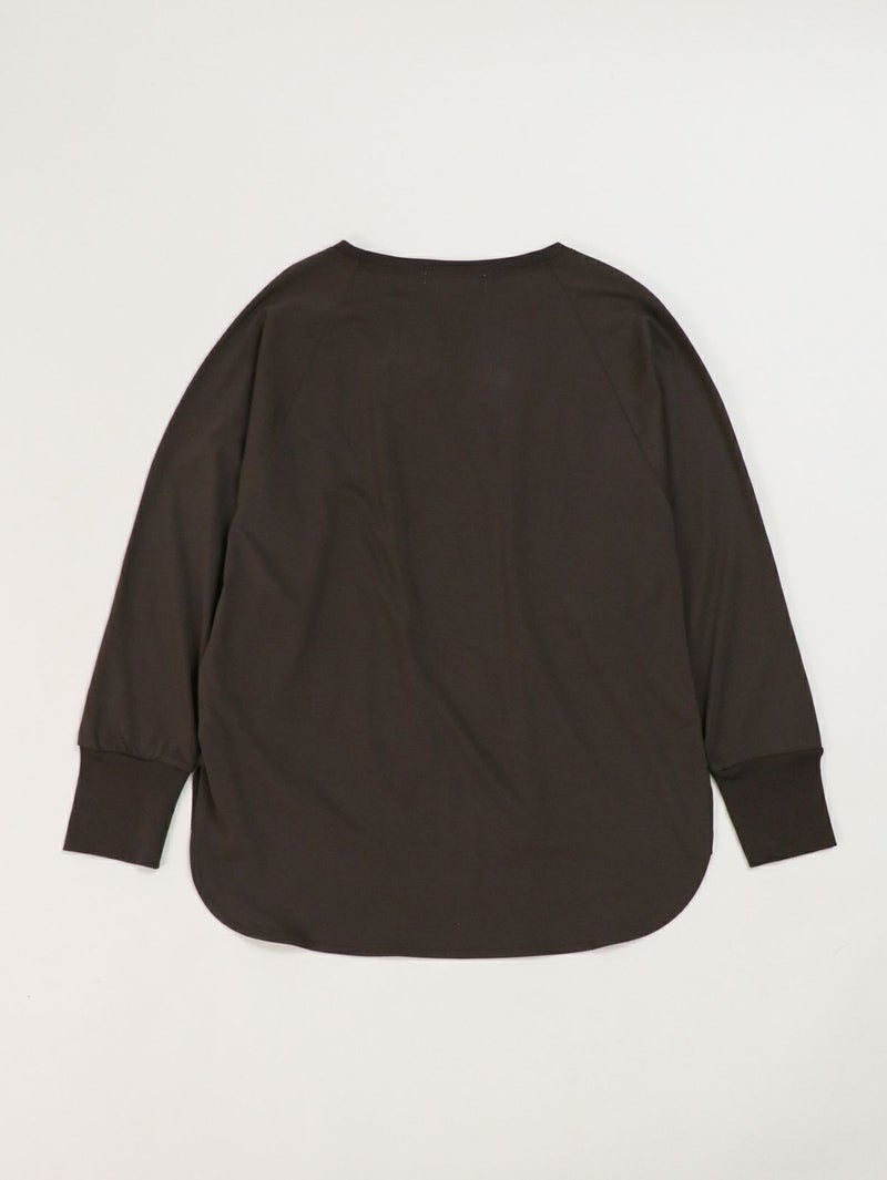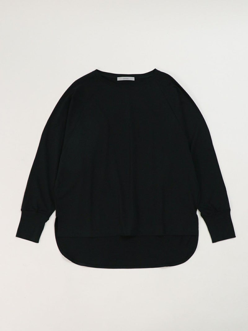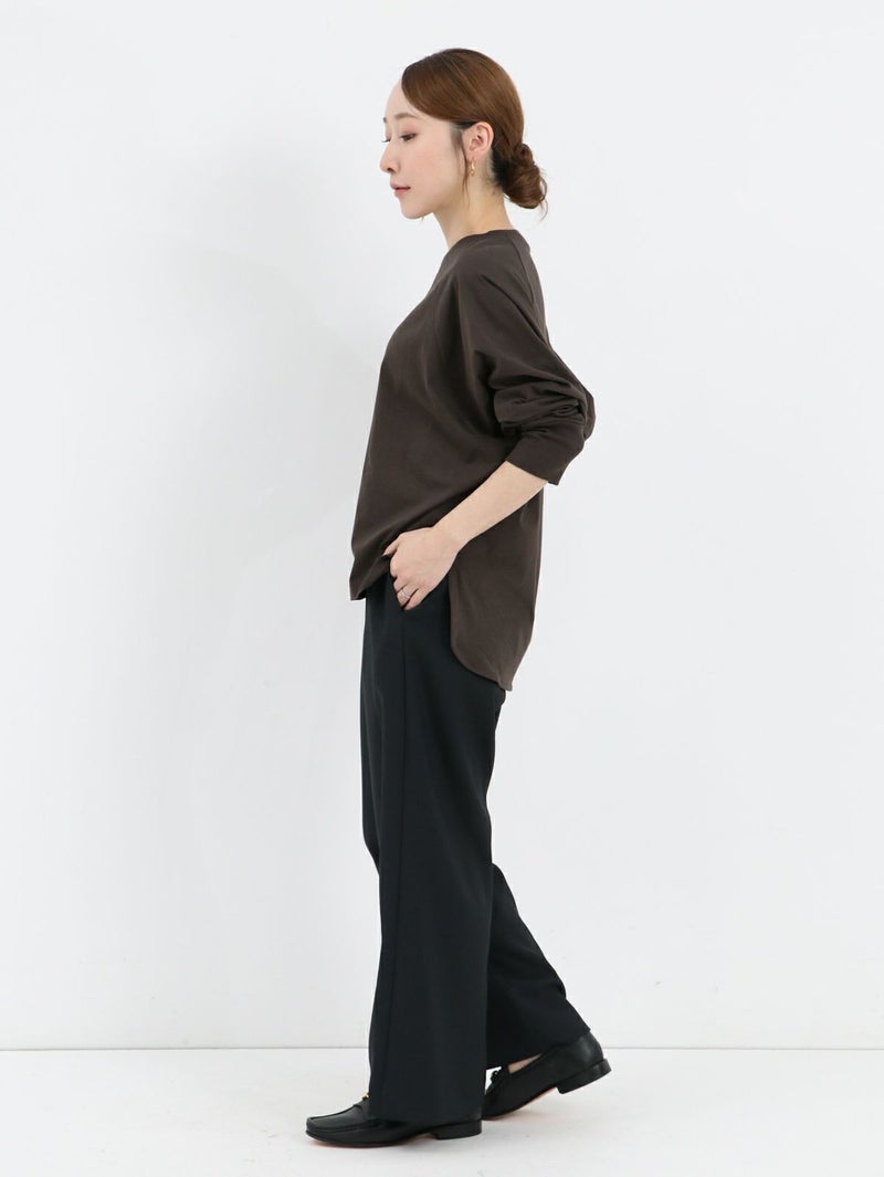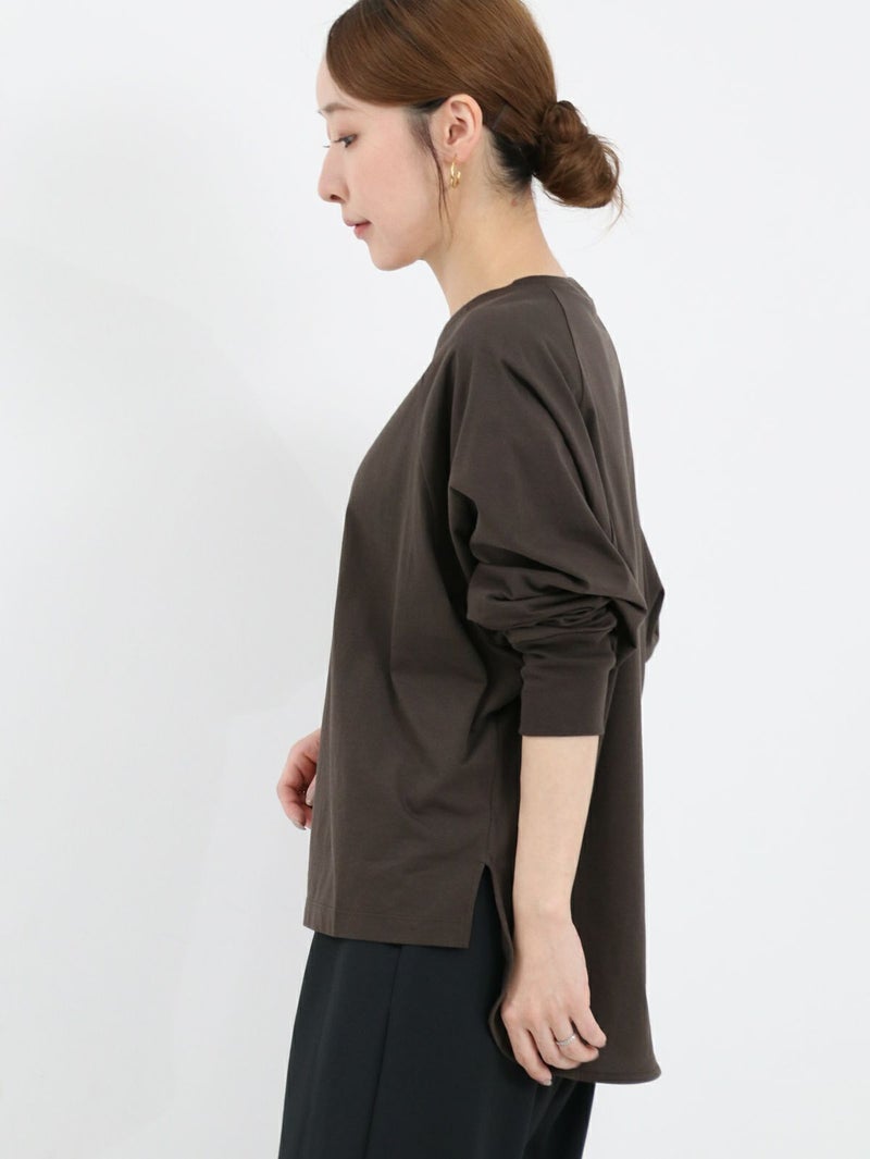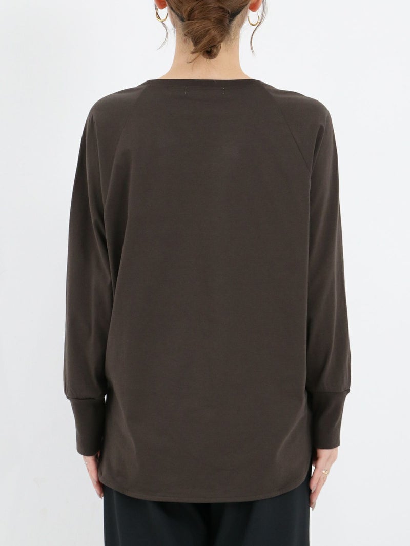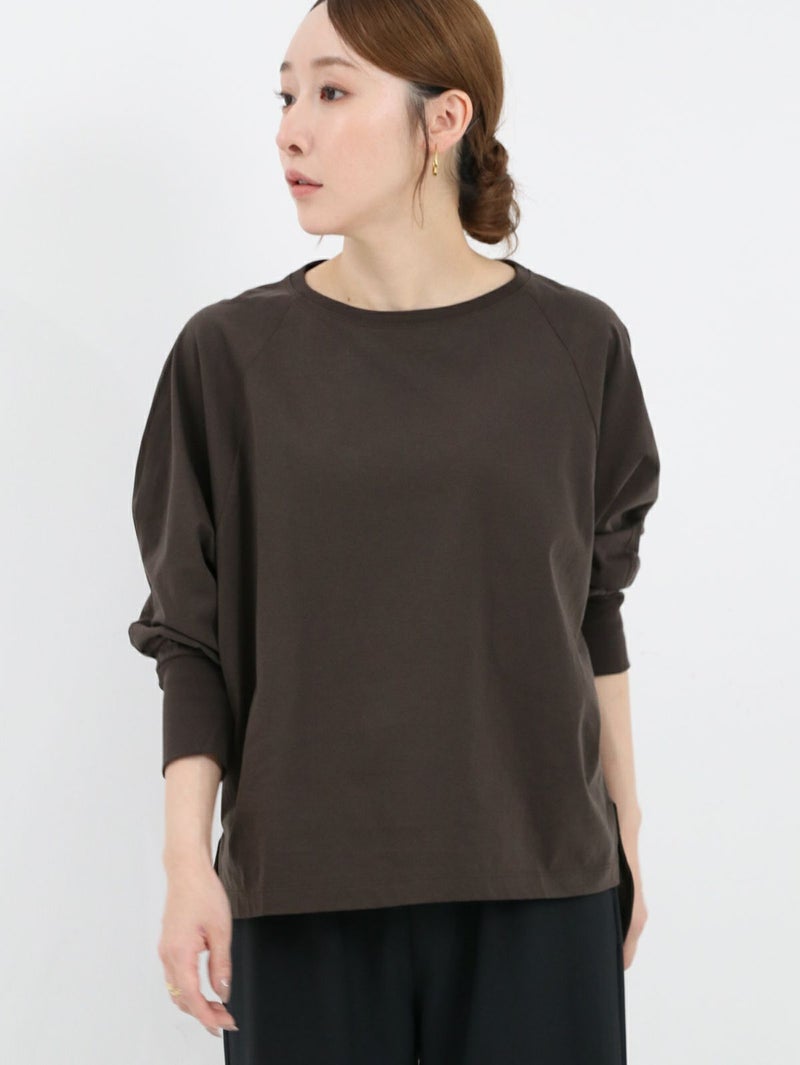 ゆとりを出した肩幅・身幅に長すぎない着丈のシルエット。アームと袖幅を広めにしたラグランスリーブに袖口にリブを付けた9分袖のデザインがポイントです。