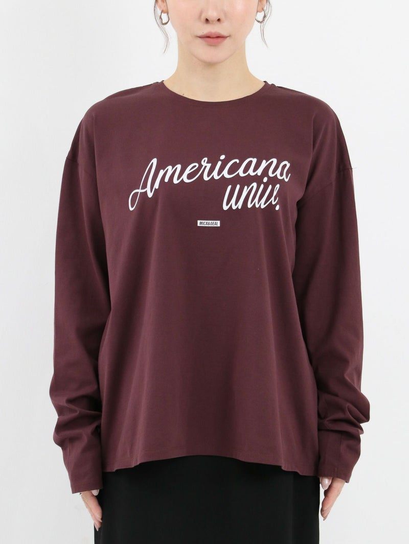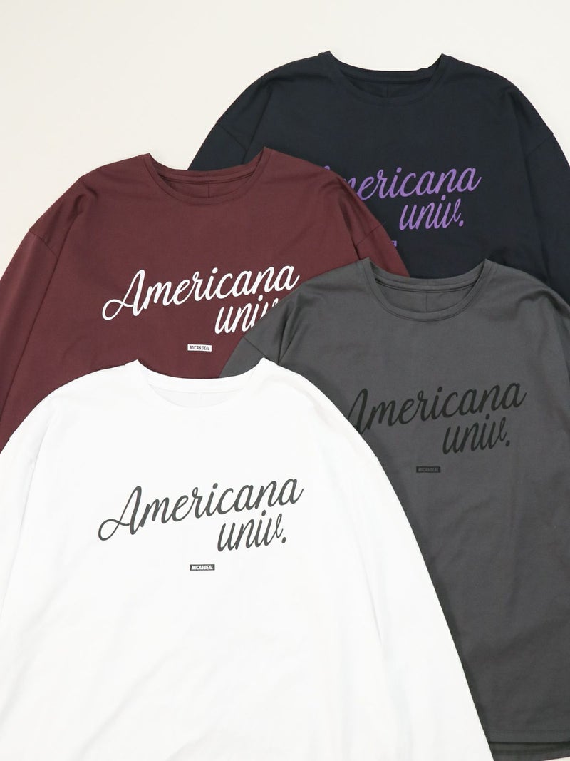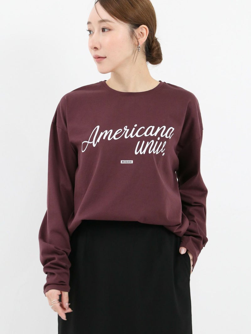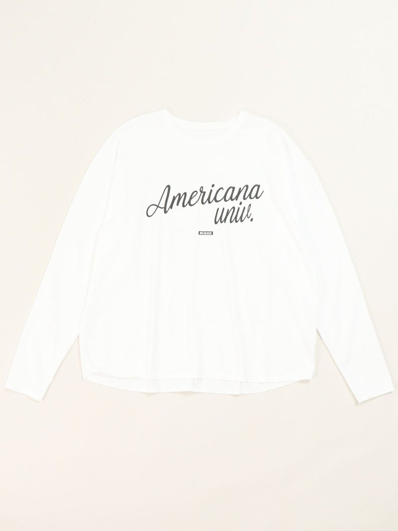AMERICANA×MICA&DEALコラボレーションTシャツ。 MICA&DEAL定番のヘムラウンドロングTシャツにAMERICANAのロゴを胸元に施し、袖口には刺繍ロゴを入れてポイントに。カジュアルスタイルはもちろん、スカートと合わせてフェミニンに仕上げたり、アクセサリーなどと合わせてシックに着こなしていただくのもおすすめです。