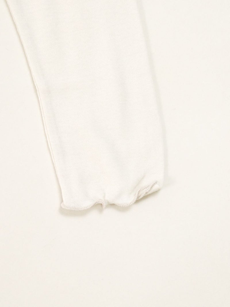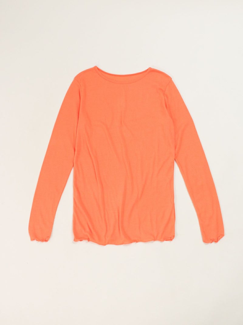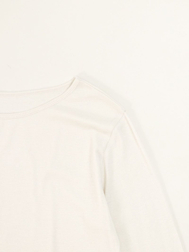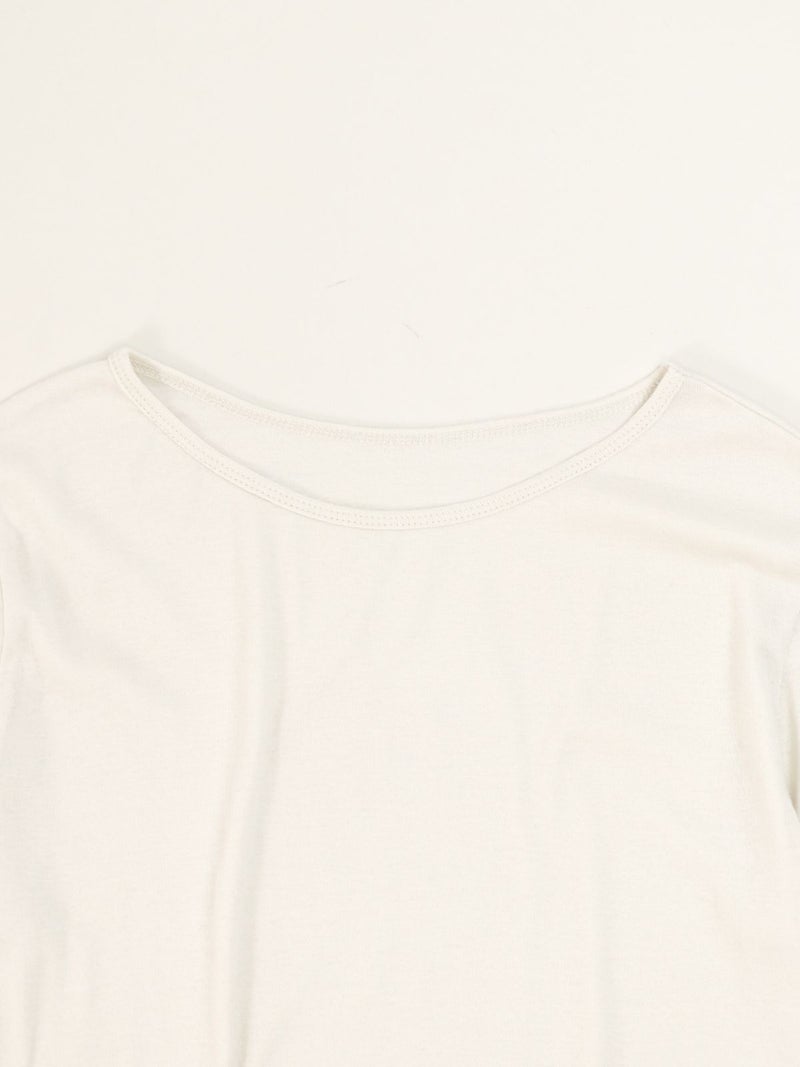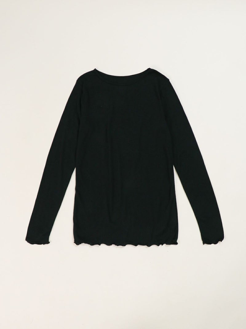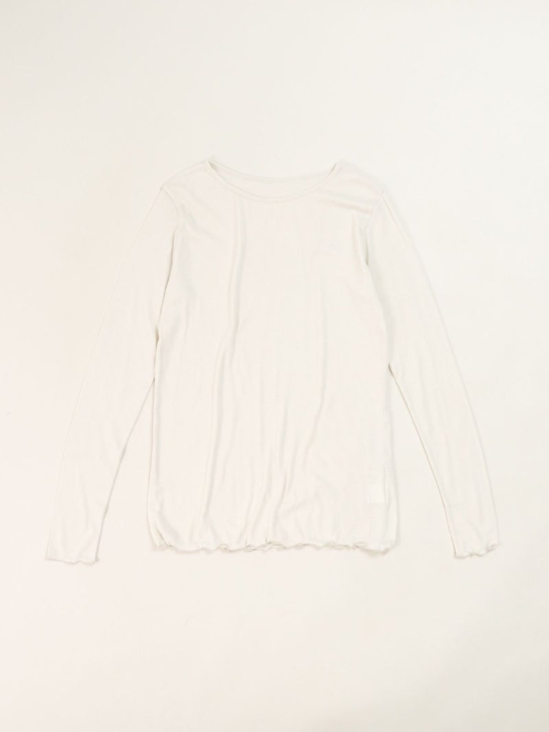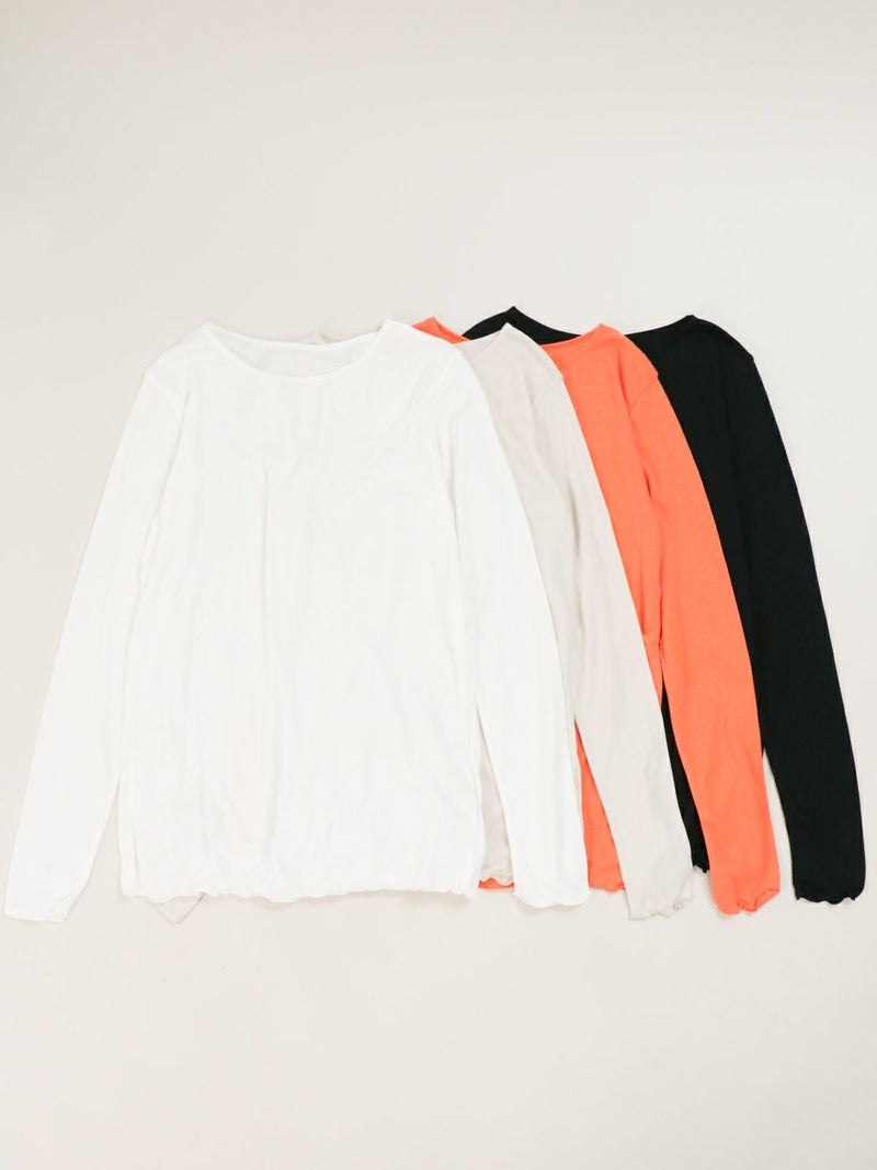 さらりとした肌触りで伸縮性のあるコットン素材のクルーネック。 袖口と裾のメロウデザインと程よいフィット感が女性らしいディテールで1枚着としてはもちろん、ニットやジャケットのインナーにもぴったりです。