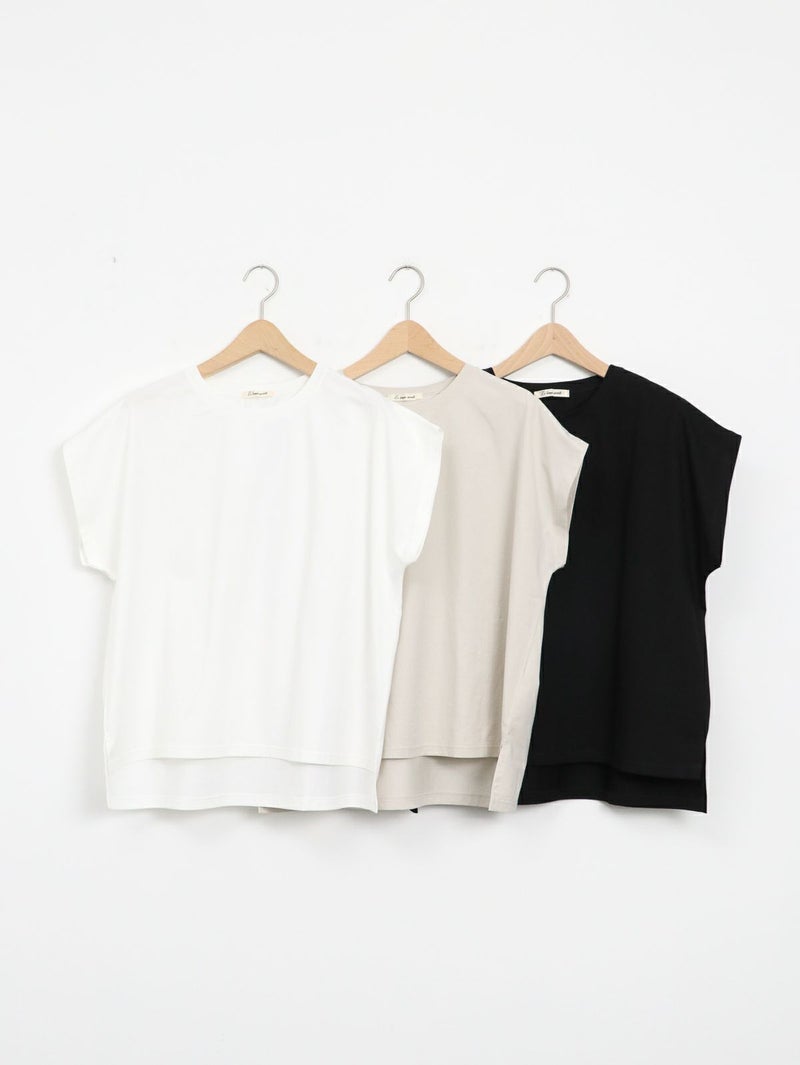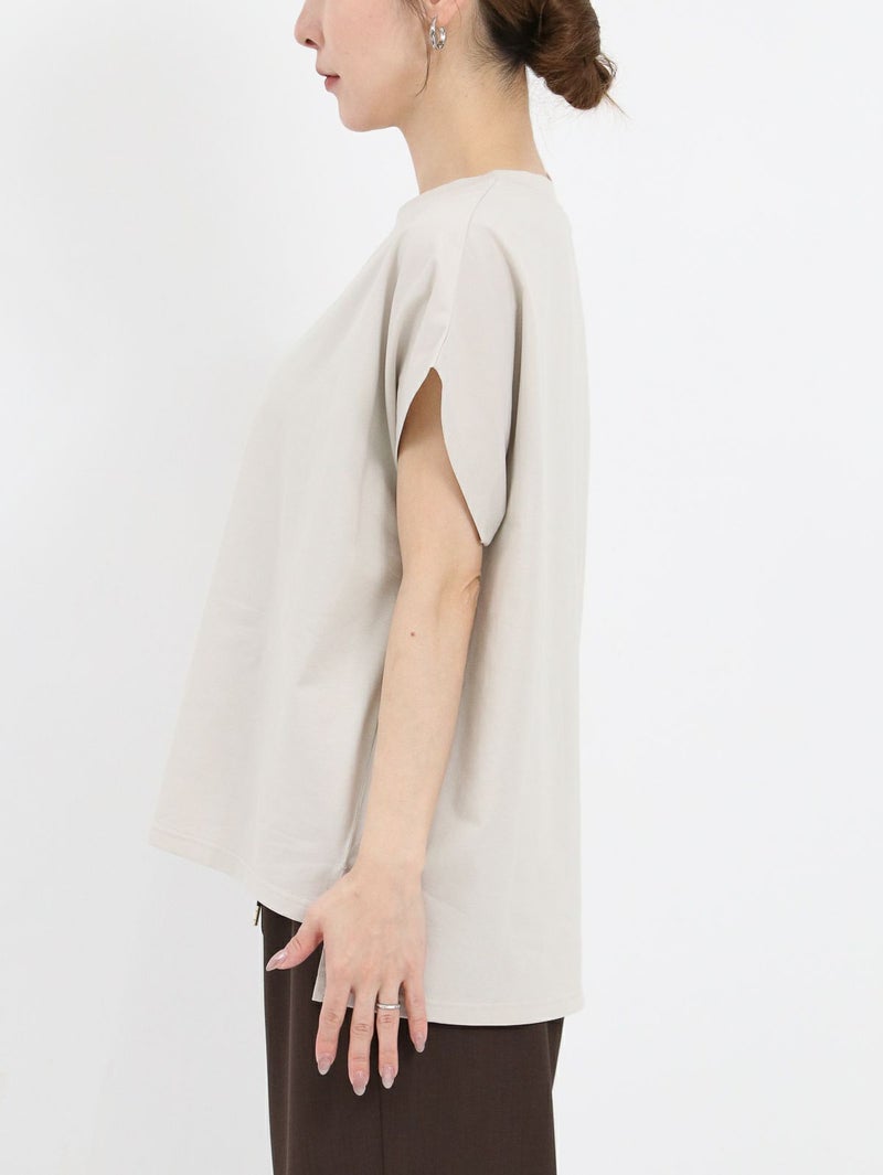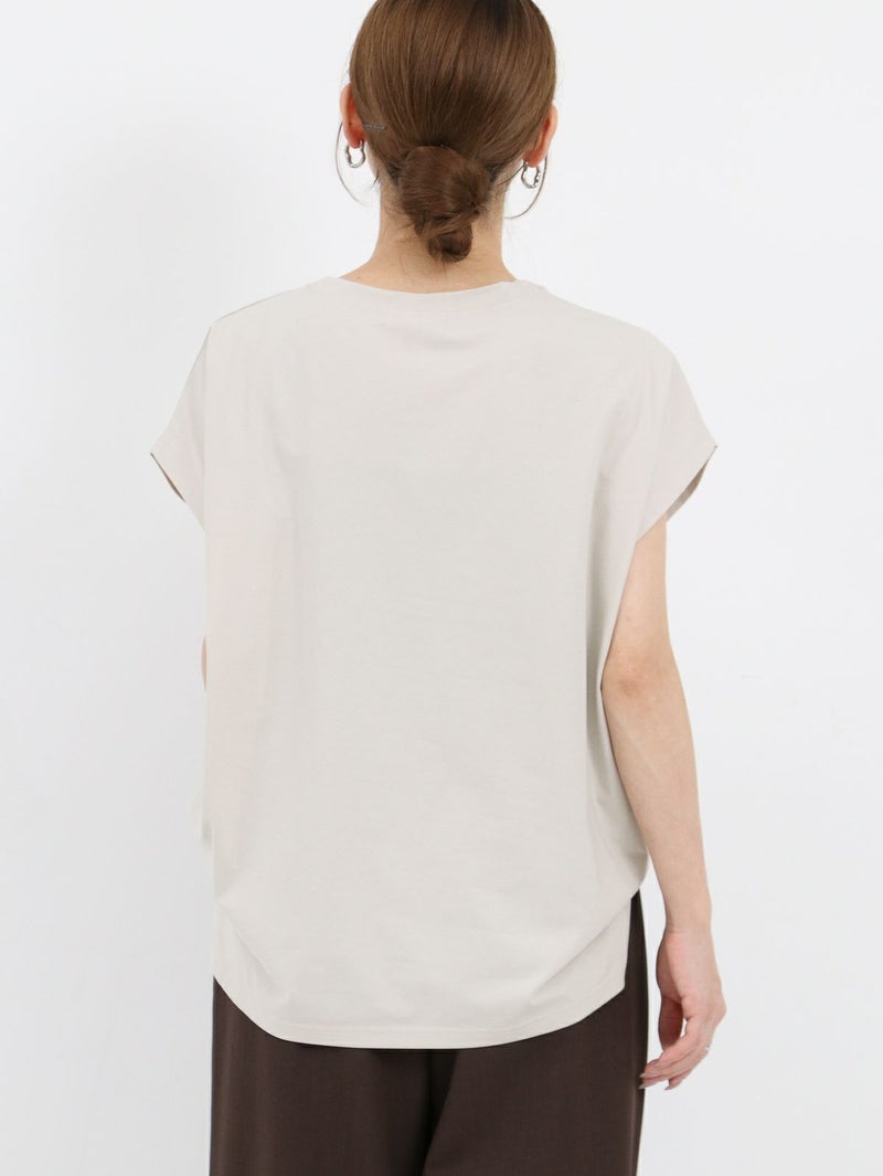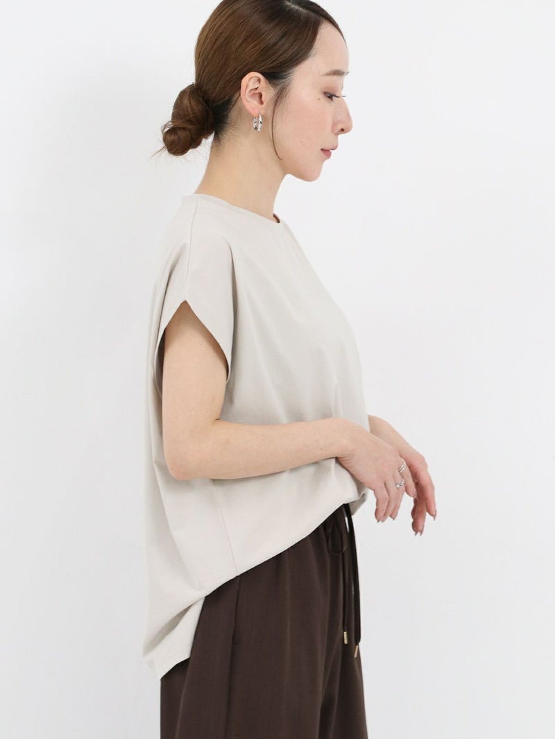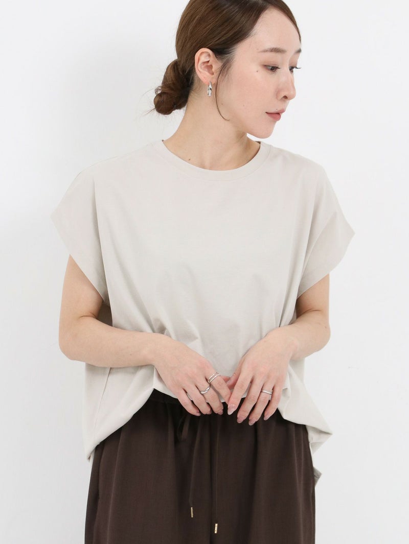 まだ暑いこの季節に気持ちの良い接触冷感機能素材。ゆったりとしたシルエットですが、これからのシーズン、シャツやカーディガンのインナーに活躍する一着です。