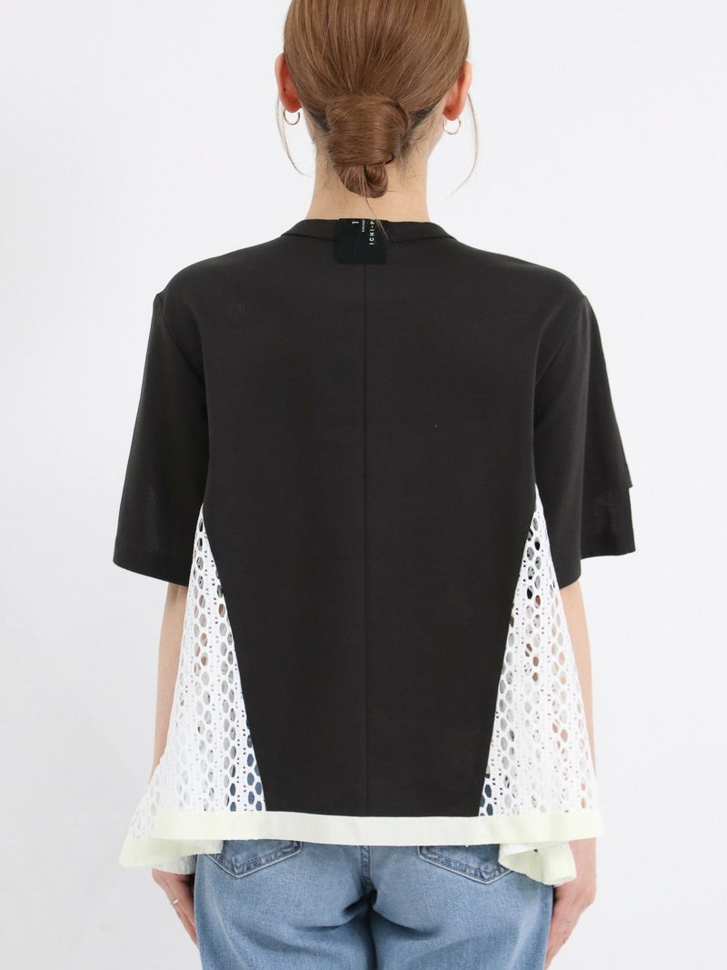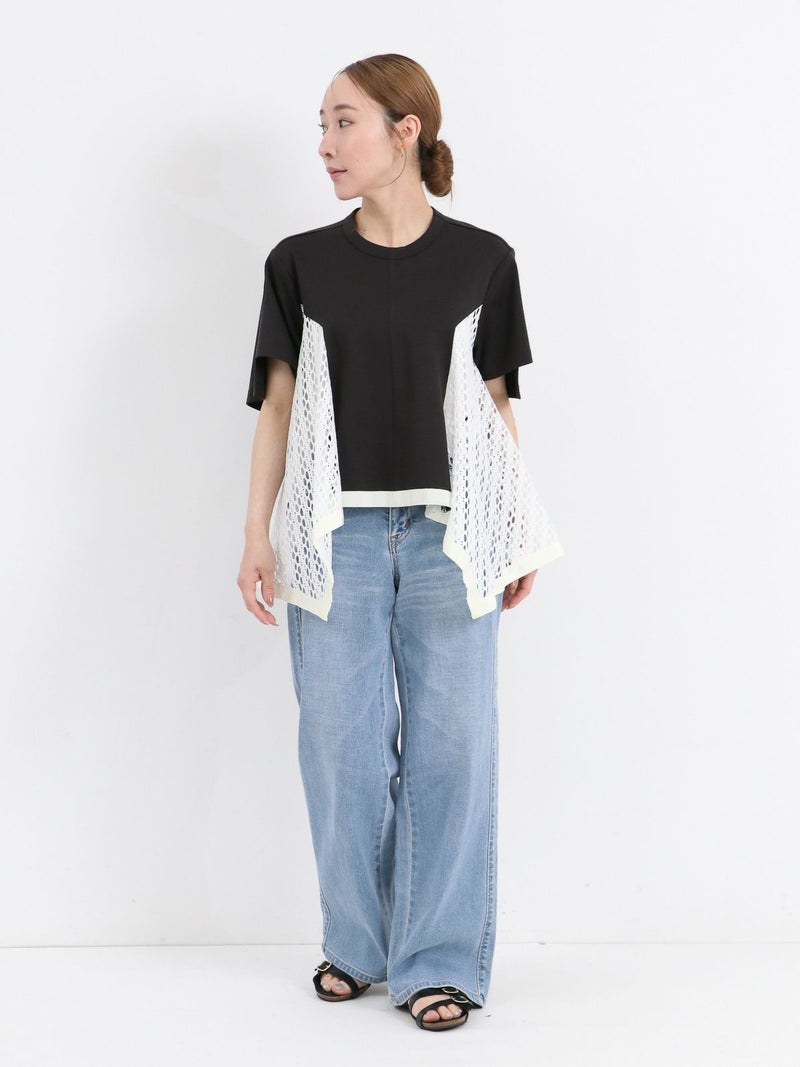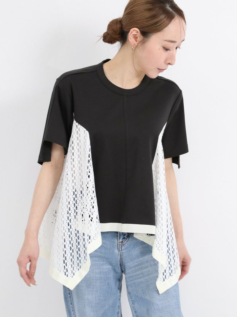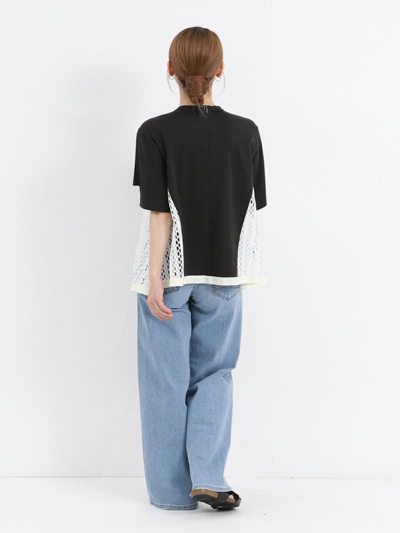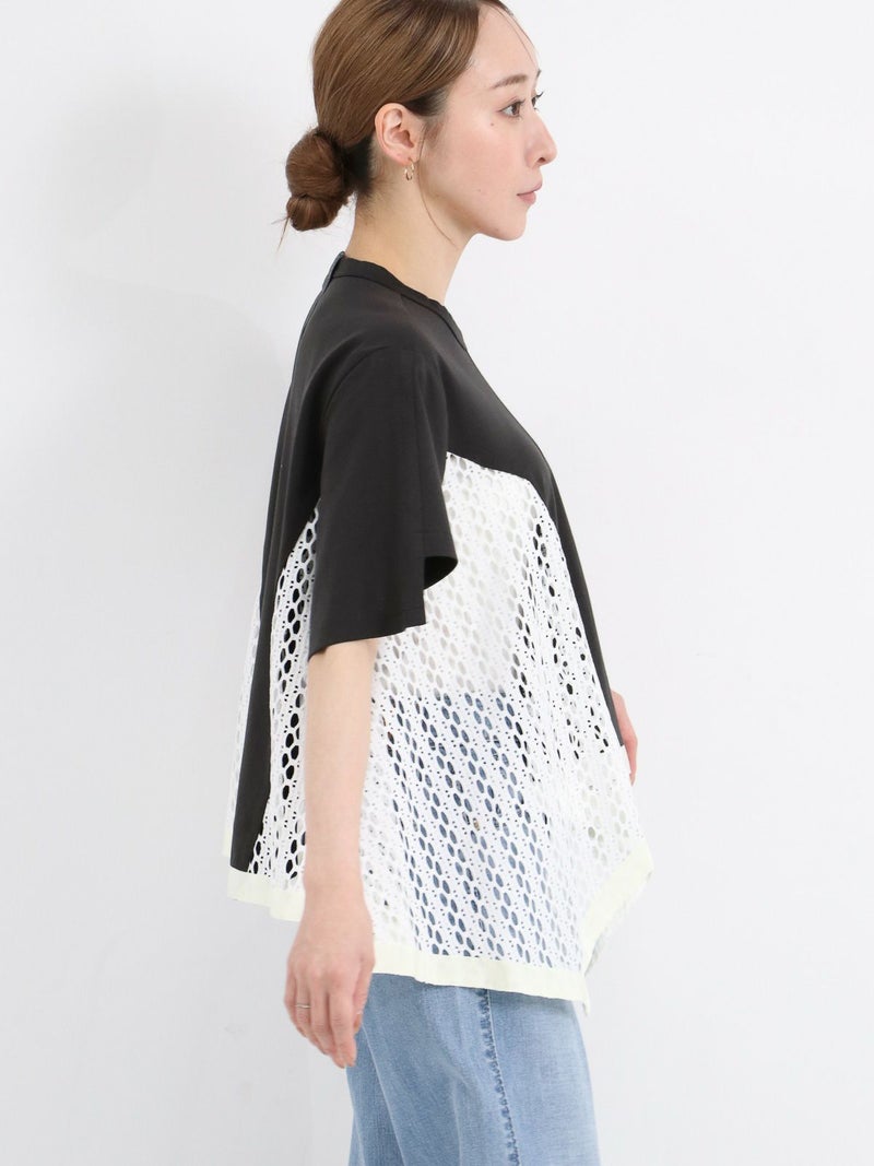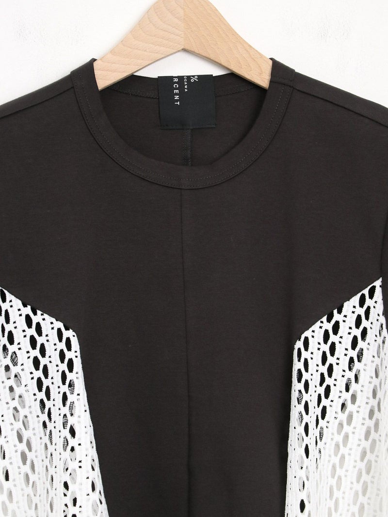 Tシャツを解体して、脇部分にレースを施しました。切替えられたデザインは360度どこから見ても1枚で着映えするよう、拘りが詰まっています。 脇下の部分は着用した際に透け防止のため裏地を付けています。