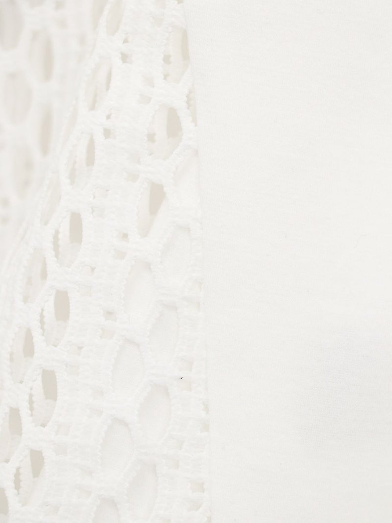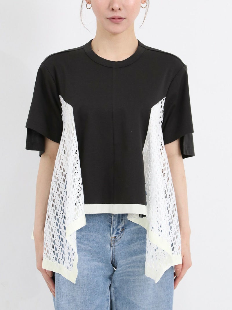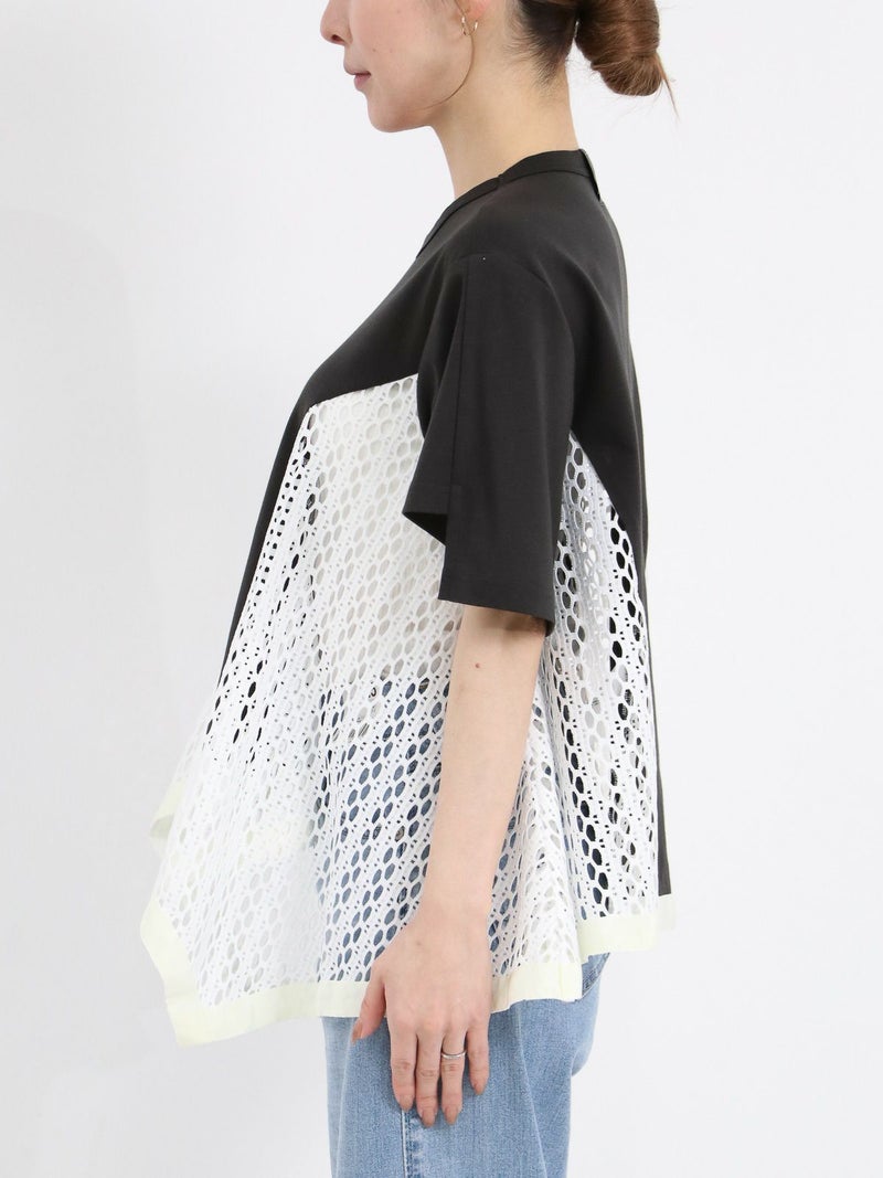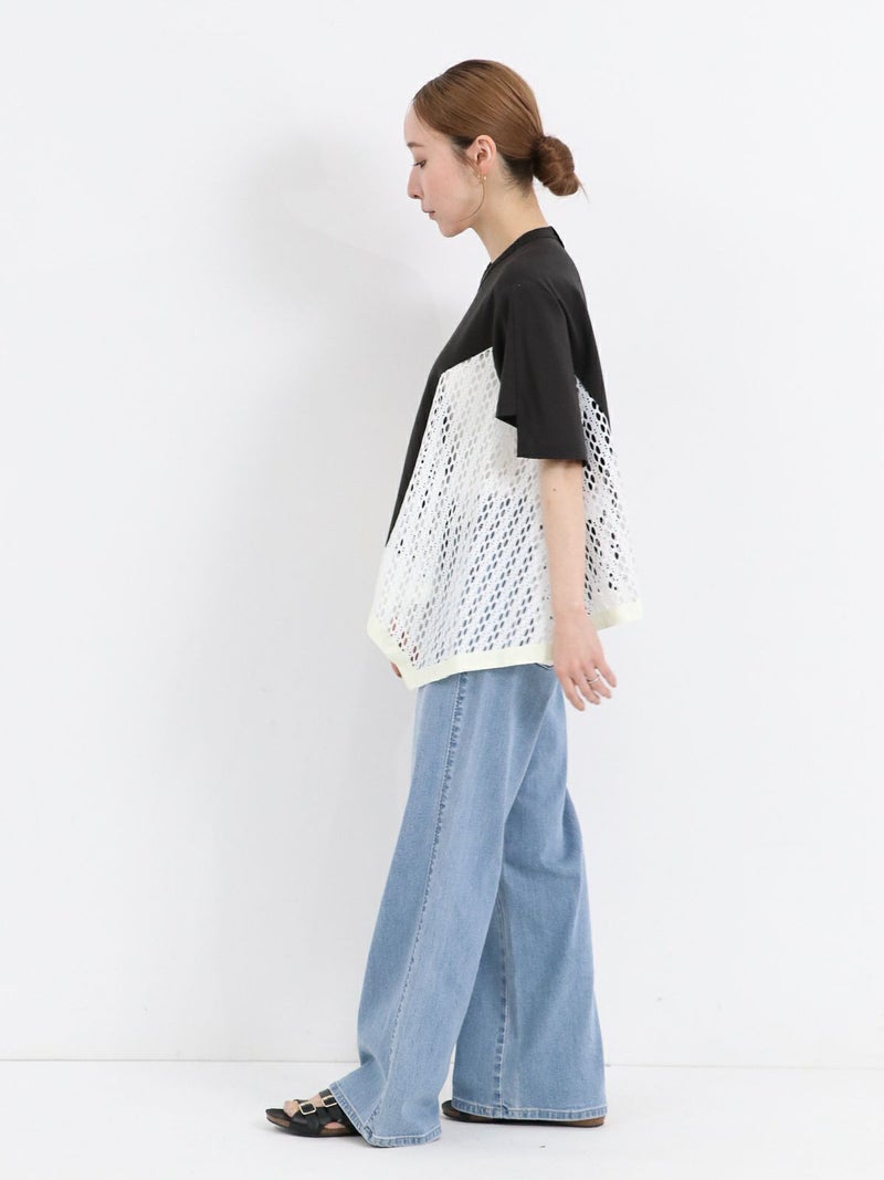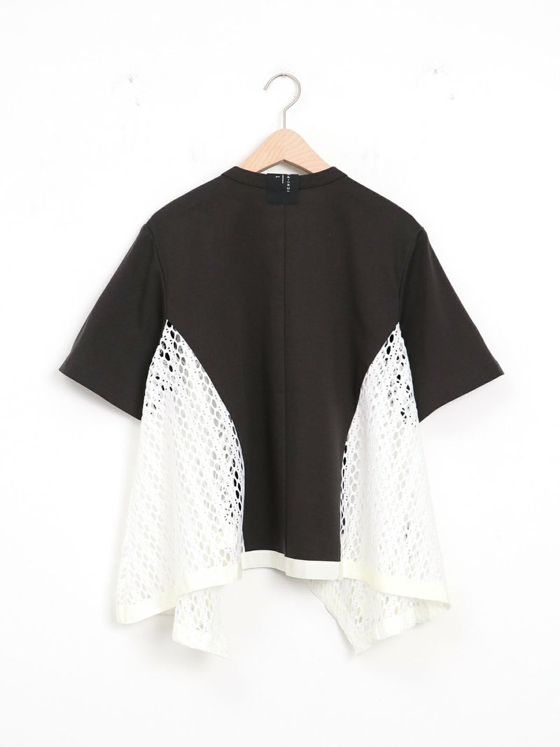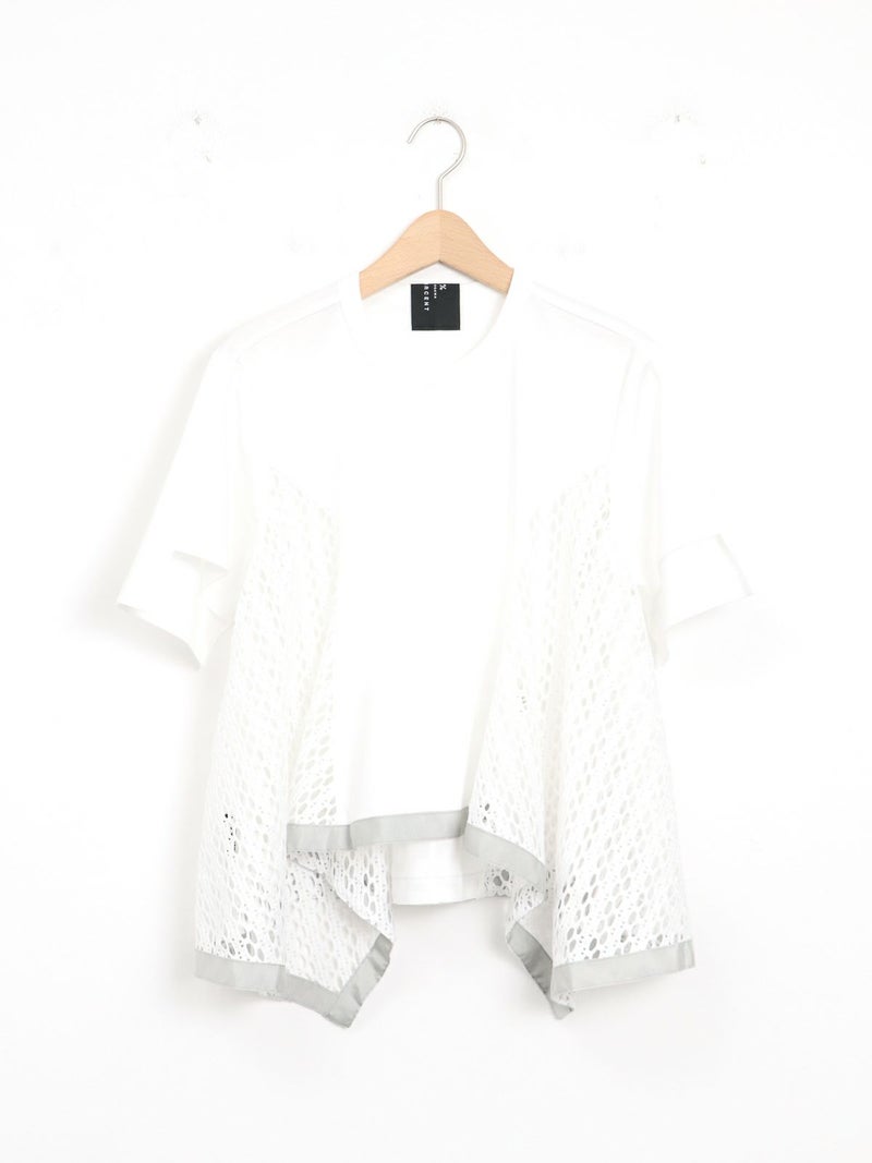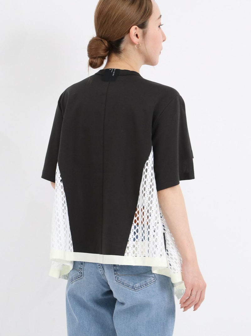 Tシャツを解体して、脇部分にレースを施しました。切替えられたデザインは360度どこから見ても1枚で着映えするよう、拘りが詰まっています。 脇下の部分は着用した際に透け防止のため裏地を付けています。