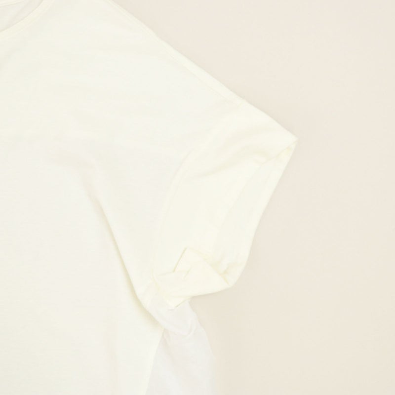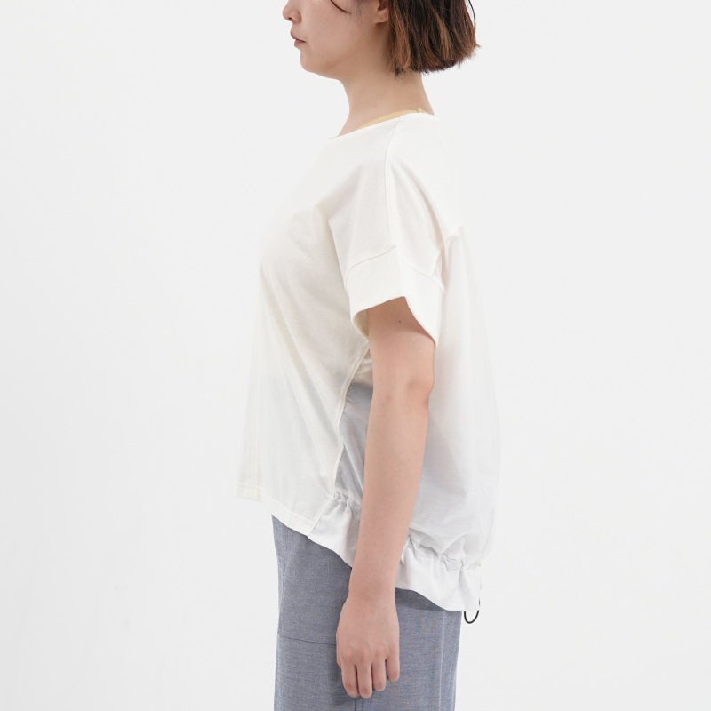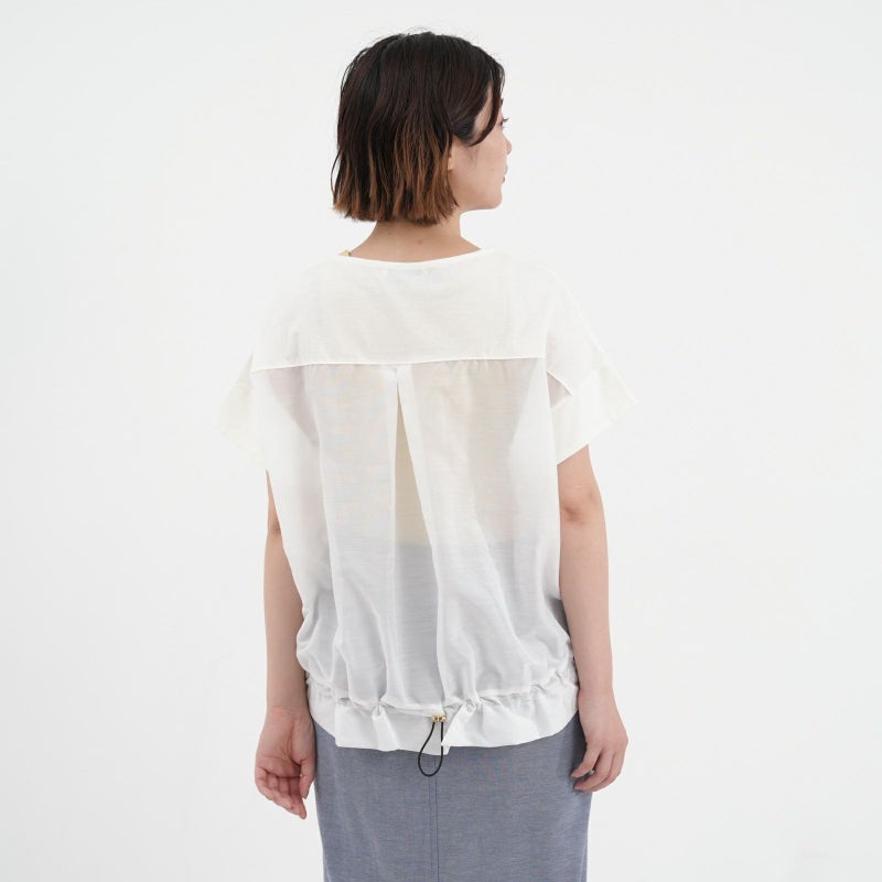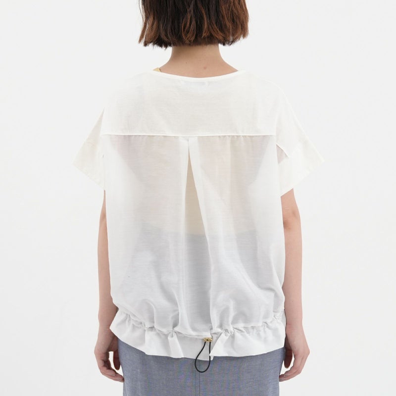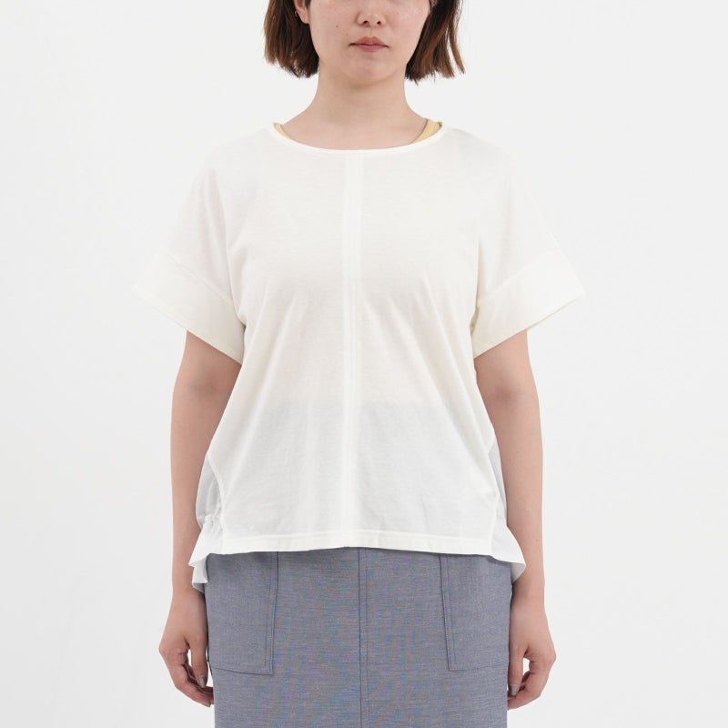 コットン100%で着心地の良い天竺を使用した半袖プルオーバー。 一見シンプルに見えて、バックで切り替えたシアー素材が上品さを醸し出し涼しげな一枚です。キレイめ~大人カジュアルまで幅広い着こなしが完成します。