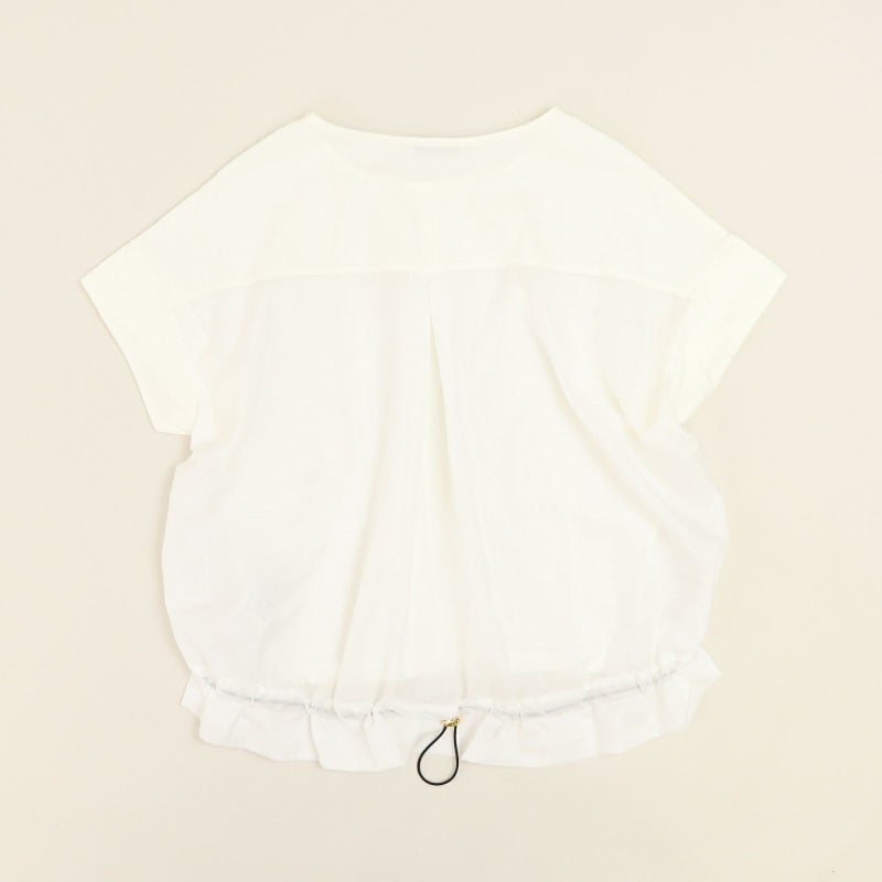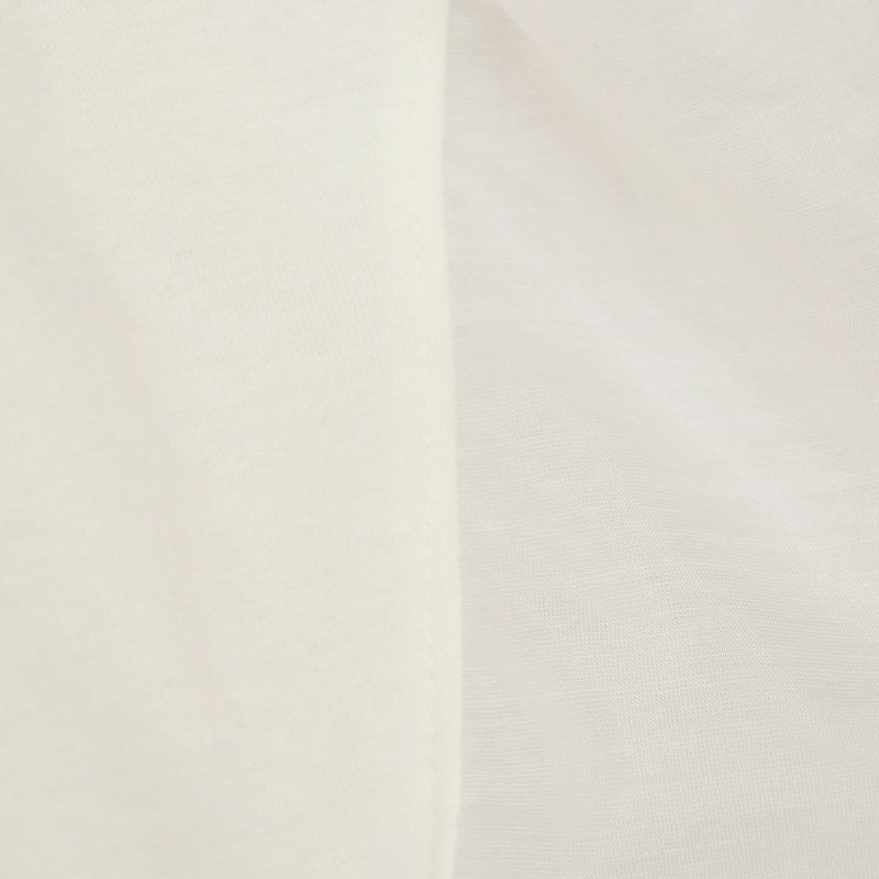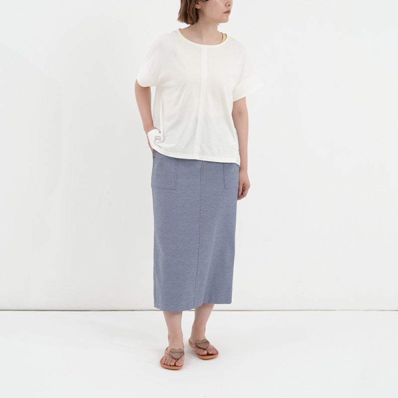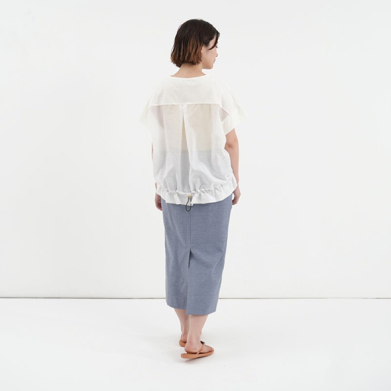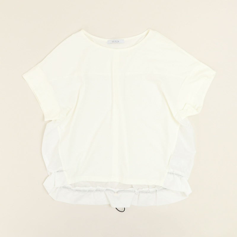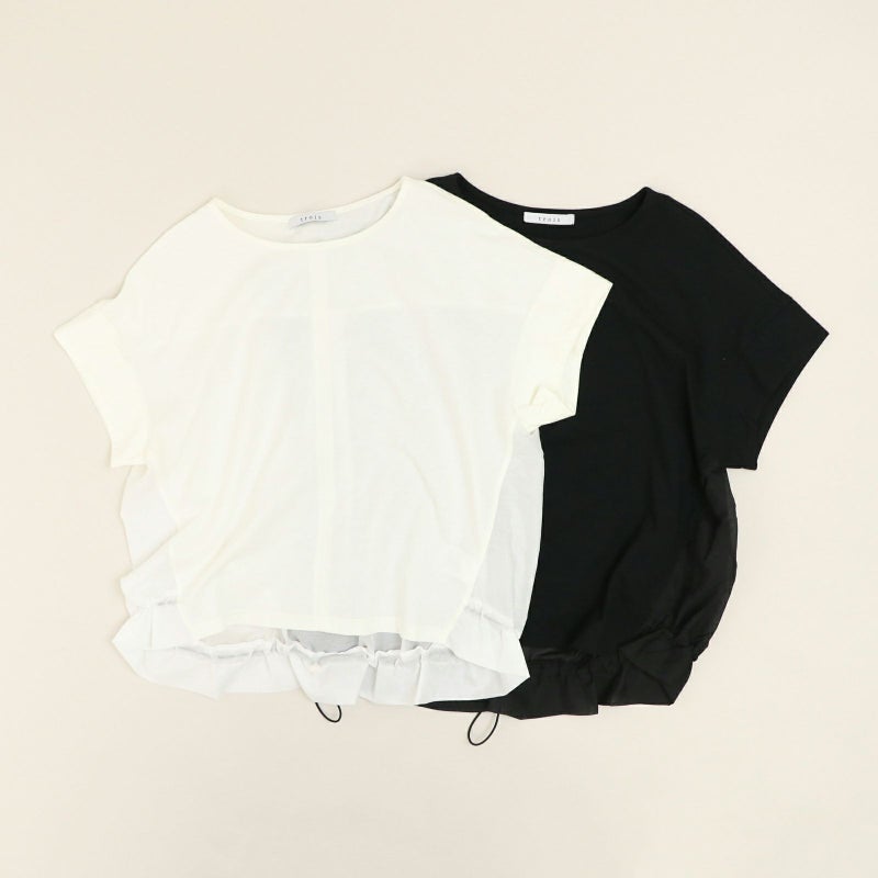 コットン100%で着心地の良い天竺を使用した半袖プルオーバー。 一見シンプルに見えて、バックで切り替えたシアー素材が上品さを醸し出し涼しげな一枚です。キレイめ~大人カジュアルまで幅広い着こなしが完成します。