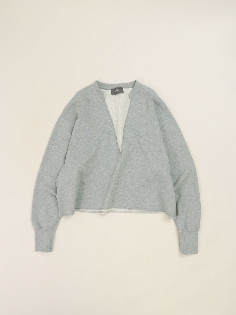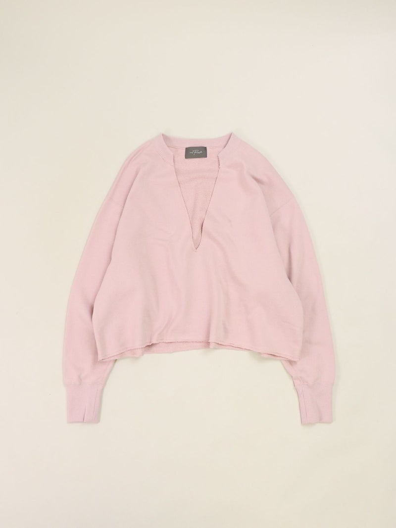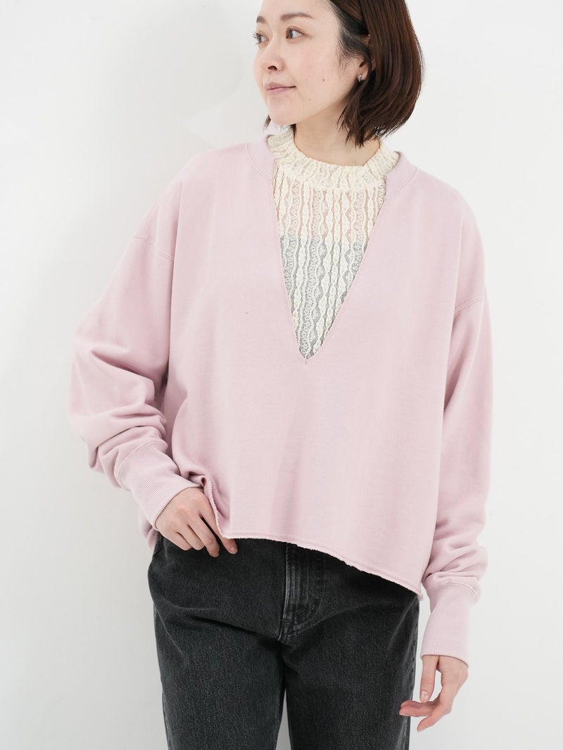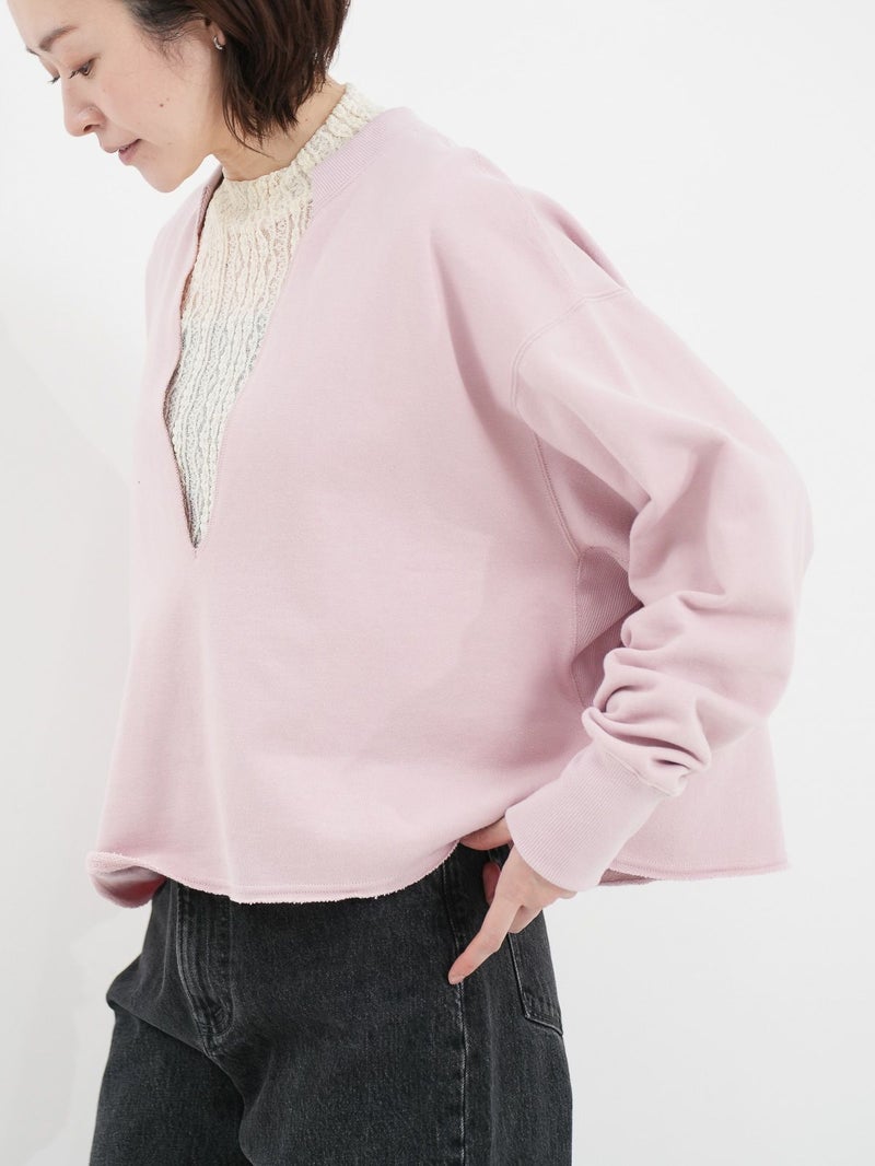 インナー次第で表情が変わる、深Vネックトップス。 大胆な深Vデザインで、合わせるインナーによって印象をアレンジできる1枚。クロップド丈を活かし、シャツやワンピースとのレイヤードも楽しめます。裾はカットオフ仕様で、さりげないこなれ感をプラス。タオルのようにパイル状に編み立てた柔らかな裏毛素材を使用し、適度な保温性と吸水性で蒸れにくく、快適な着心地です。