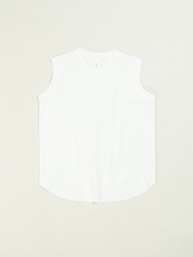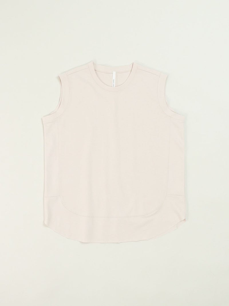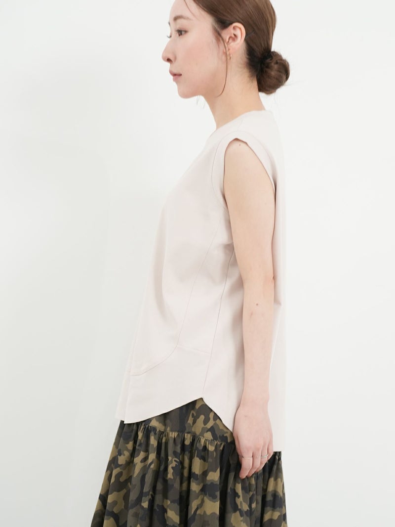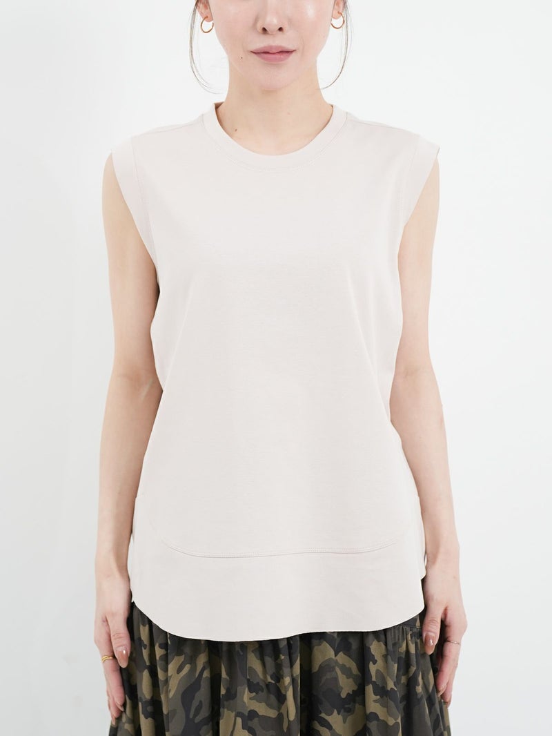 定番半袖/長袖カットソーのノースリーブver. サイドから裾にかけての切替やバックスリットなどポイントとなるデザインはそのままに春夏に活躍するノースリーブにデザインに。薄手で滑らかな肌触りのポリエステル混素材を使用。完成度が高く、1枚着はもちろんレイヤードスタイルにもおすすめです。