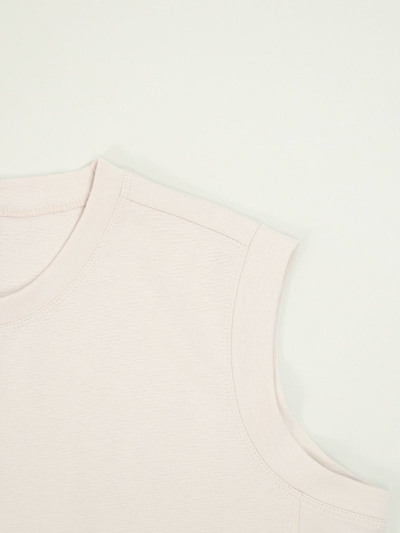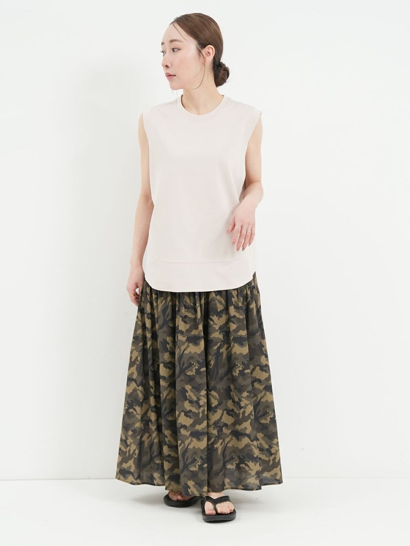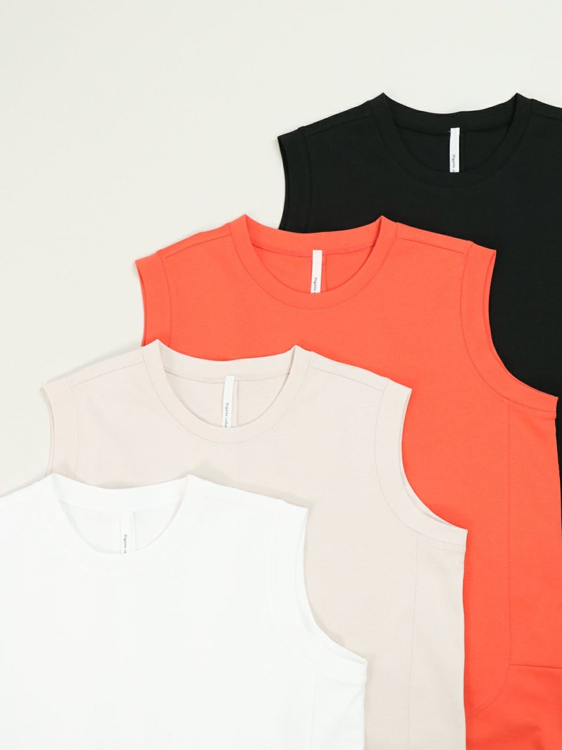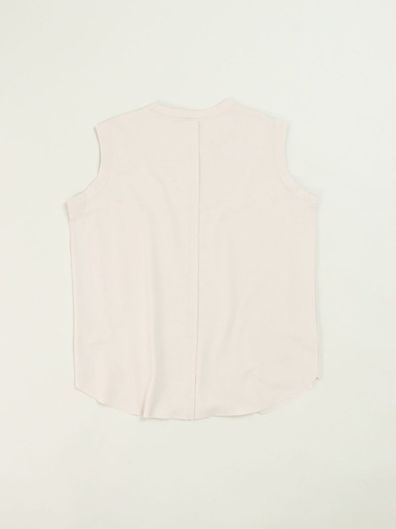 定番半袖/長袖カットソーのノースリーブver. サイドから裾にかけての切替やバックスリットなどポイントとなるデザインはそのままに春夏に活躍するノースリーブにデザインに。薄手で滑らかな肌触りのポリエステル混素材を使用。完成度が高く、1枚着はもちろんレイヤードスタイルにもおすすめです。