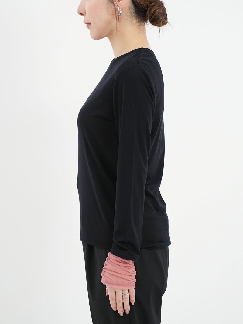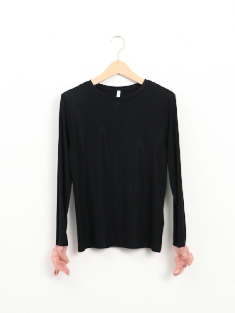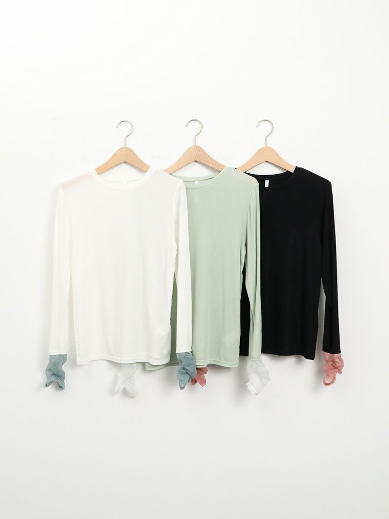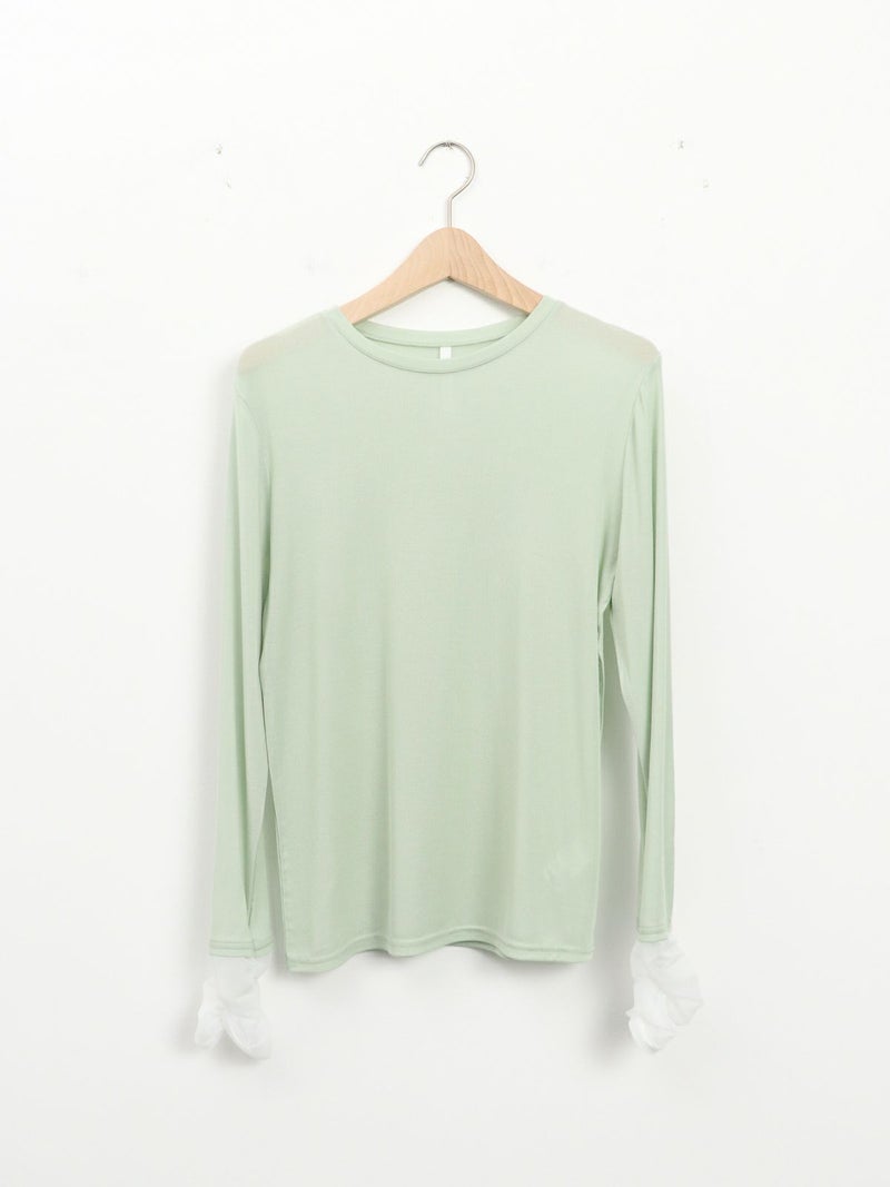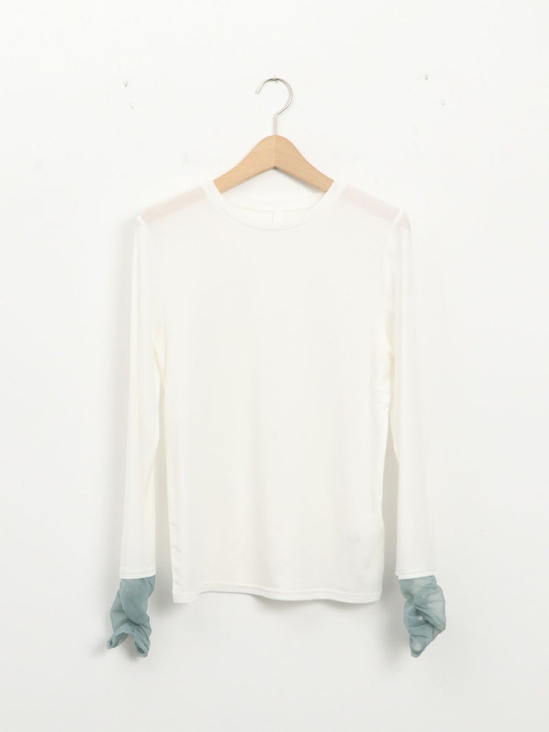 配色になった袖口が特徴的なプルオーバー。 シフォンにシャーリングを加え、カットソー部分は少し光沢のあるセルロースのストレッチ素材を使用しており気持ちよく着用できる1枚です。