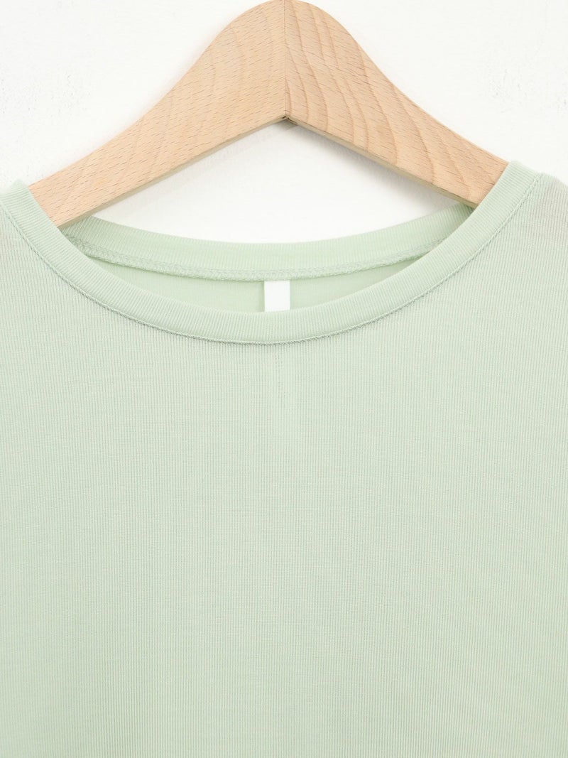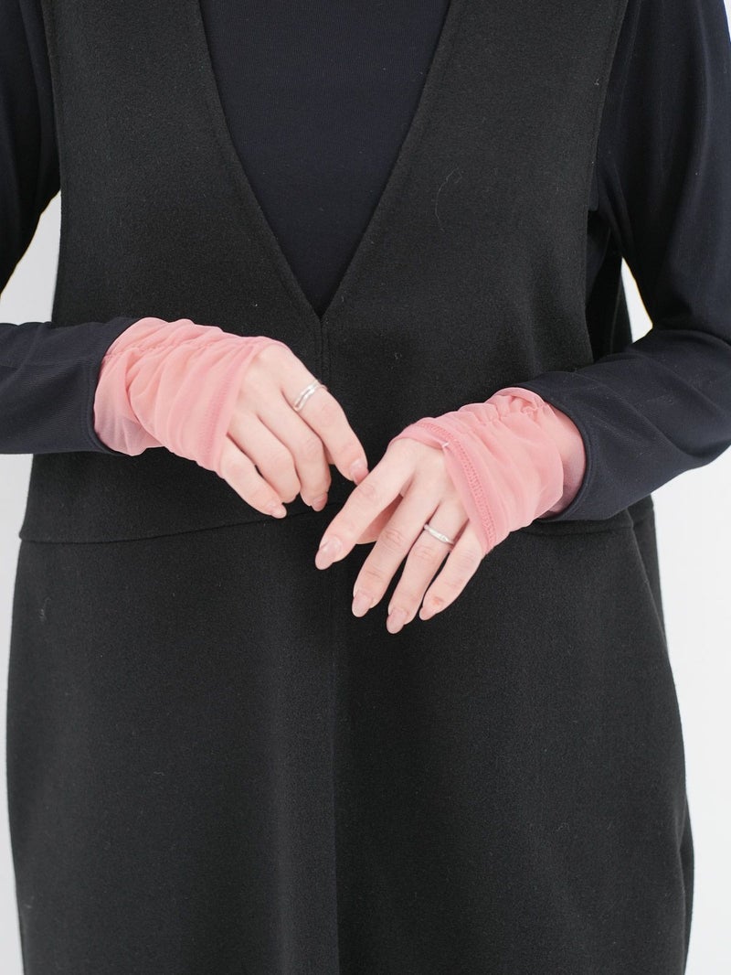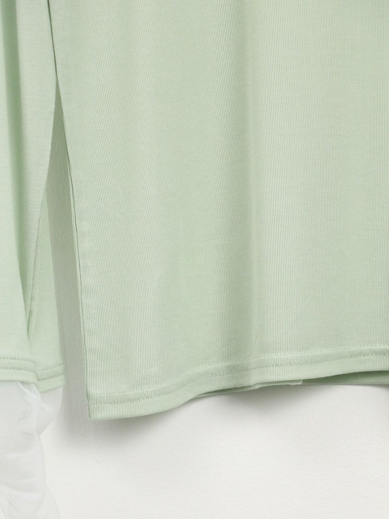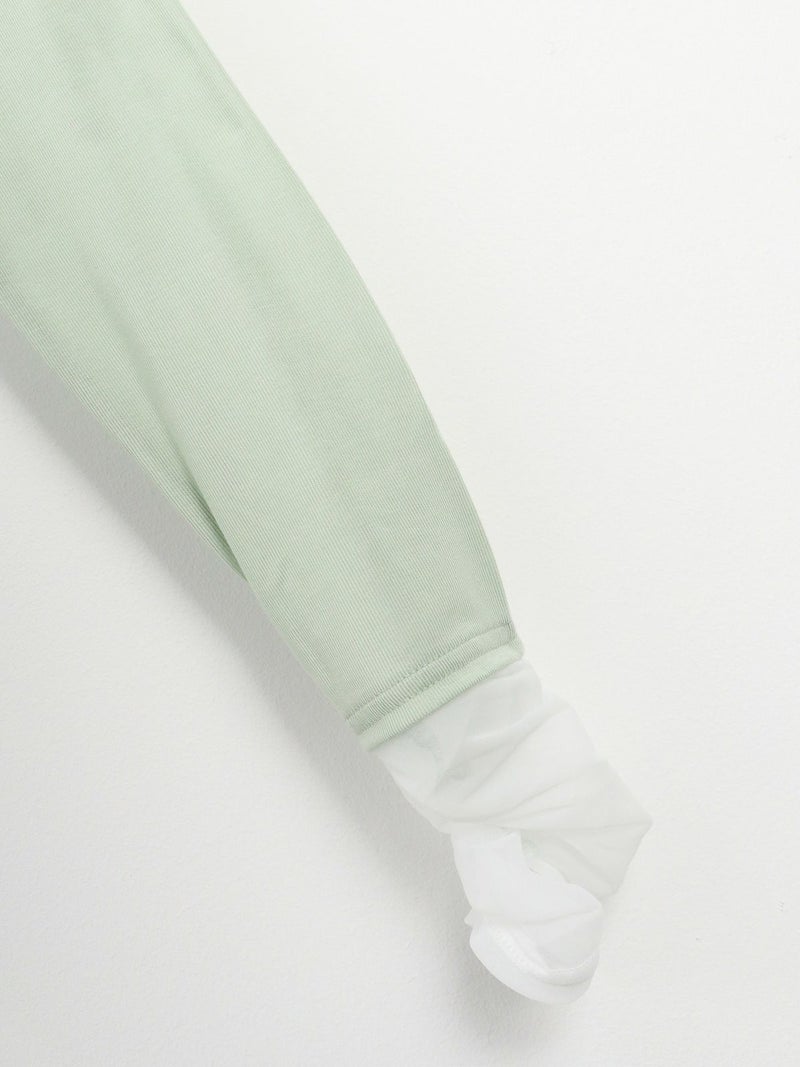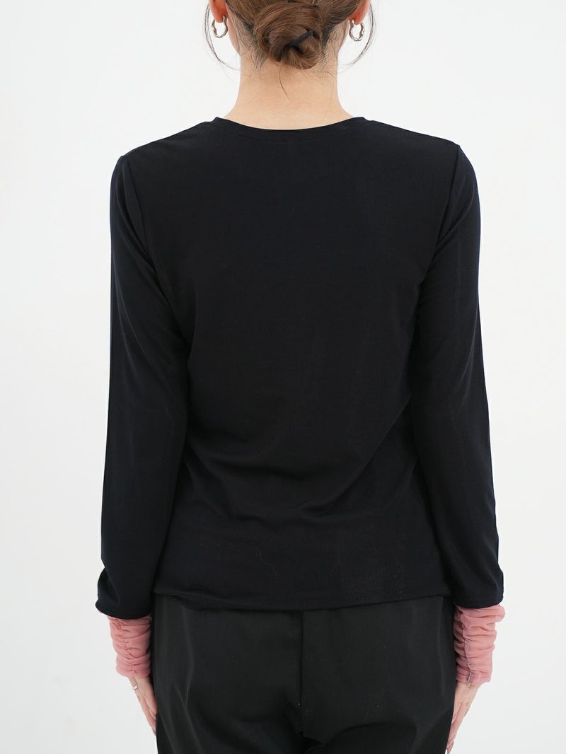 配色になった袖口が特徴的なプルオーバー。 シフォンにシャーリングを加え、カットソー部分は少し光沢のあるセルロースのストレッチ素材を使用しており気持ちよく着用できる1枚です。