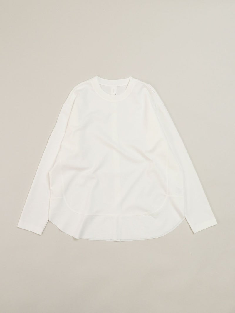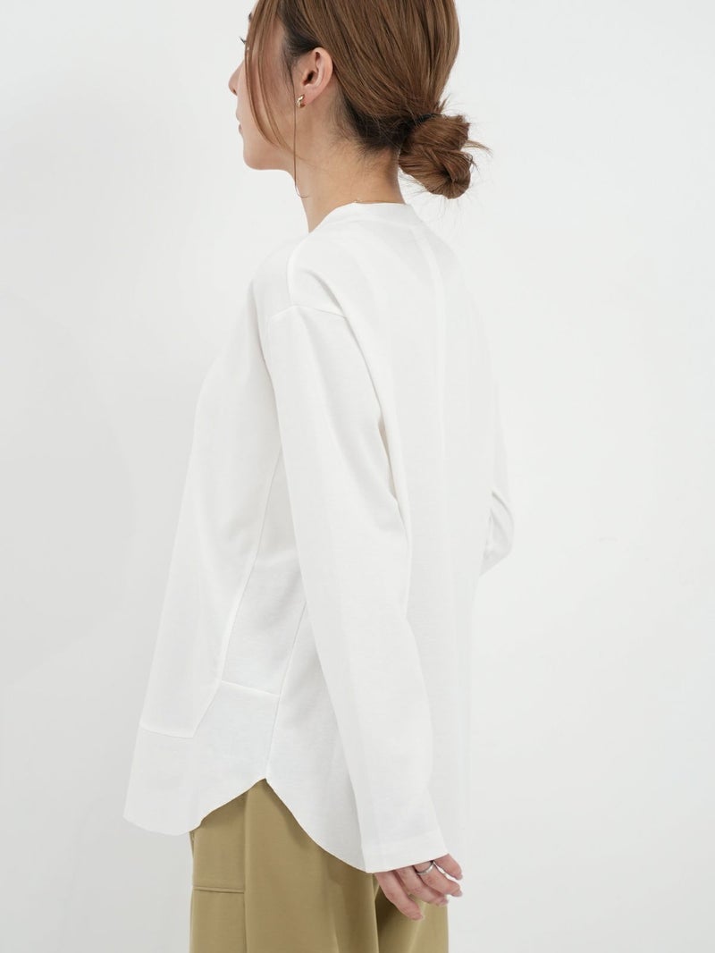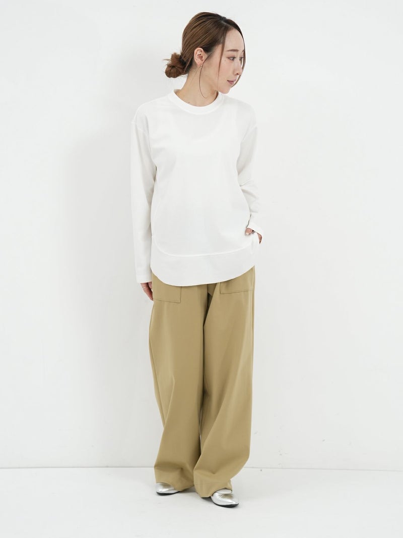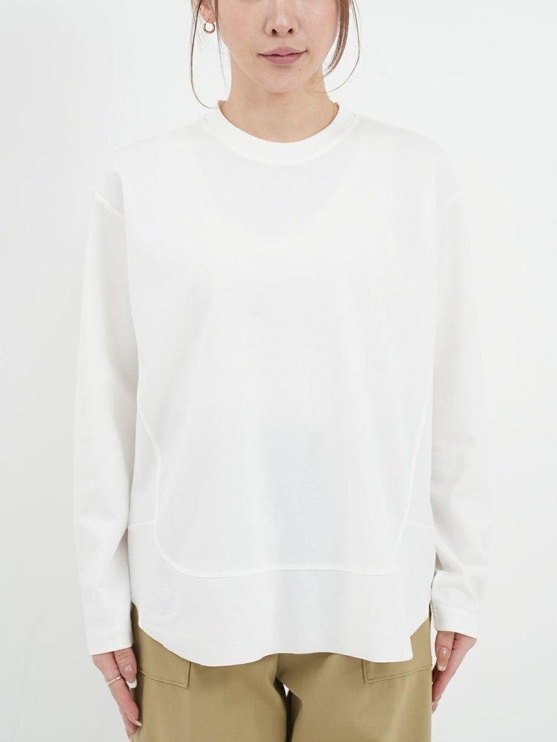シンプルながらも表面感があり、カジュアル過ぎない大人の定番カットソー。 程よいストレッチの効いた素材は、肌触りも滑らかで着心地も抜群。バックスタイルに浅めのスリット入りで、1枚で着ても活躍します。