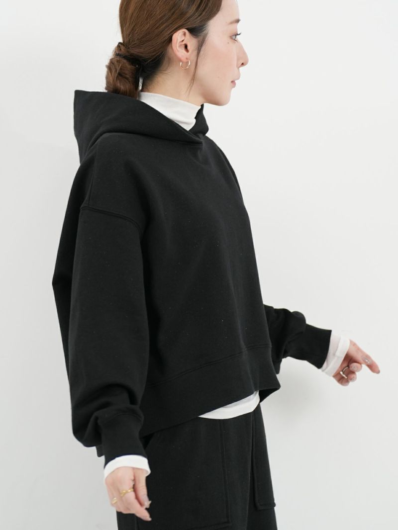 さりげなく光る大人の余裕を感じさせるフーディープルオーバー。 綿100%で肌触りが良く、光が当たるとほんのり煌めく上品なラメが、コーデにやわらかな華やかさを添えてくれます。ゆったりとしたシルエットと、袖口・裾のリブでリラックス感も◎ 左袖には筆記体のロゴ刺繍を施し、カジュアルな中にもこだわりを感じさせるデザインに仕上げました。