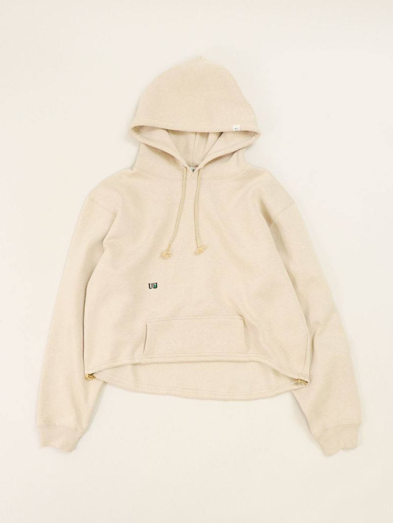 カレッジパーカーのプリントデザインを上下逆さまにして後ろ見頃にあしらいました。フードの立ち上がりやシルエットも計算された特別なパーカーです。