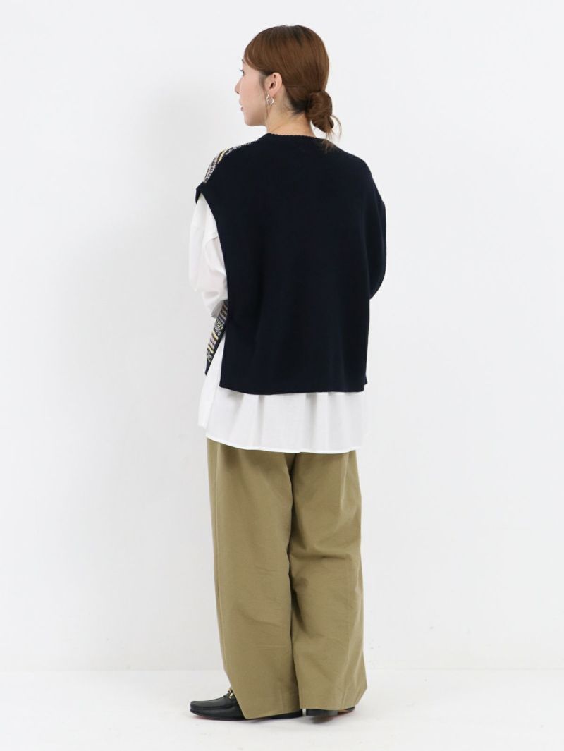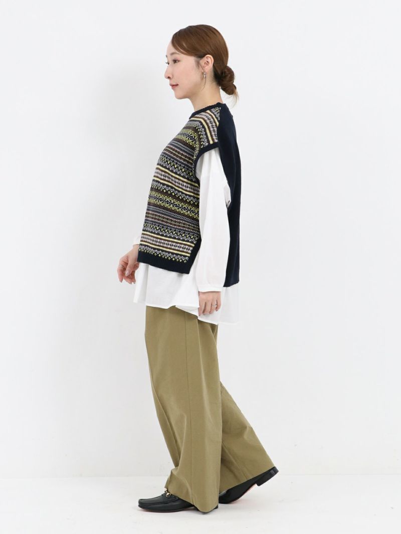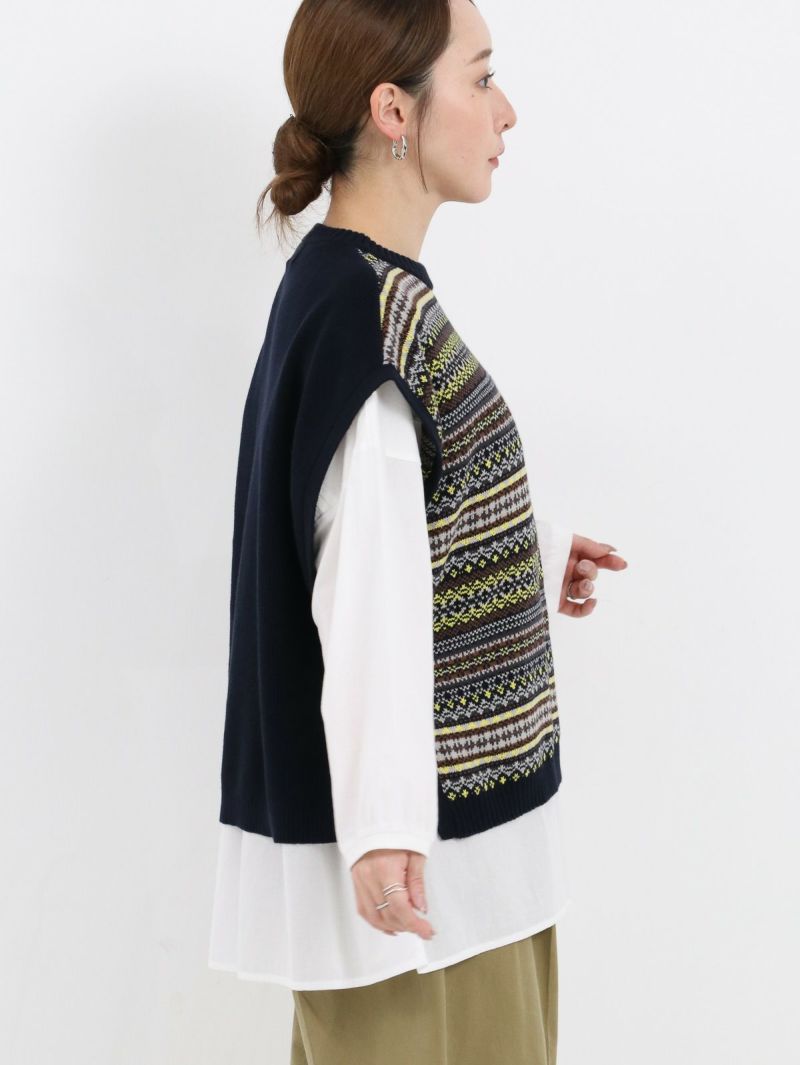 やわらかな風合いのコットン糸を使用したベスト。 前身頃は明るい配色がポイントのジャガード柄、後身頃は畦編みと前後で編地の違う1枚です。インナー次第で秋口から冬まで長く着用出来ます。