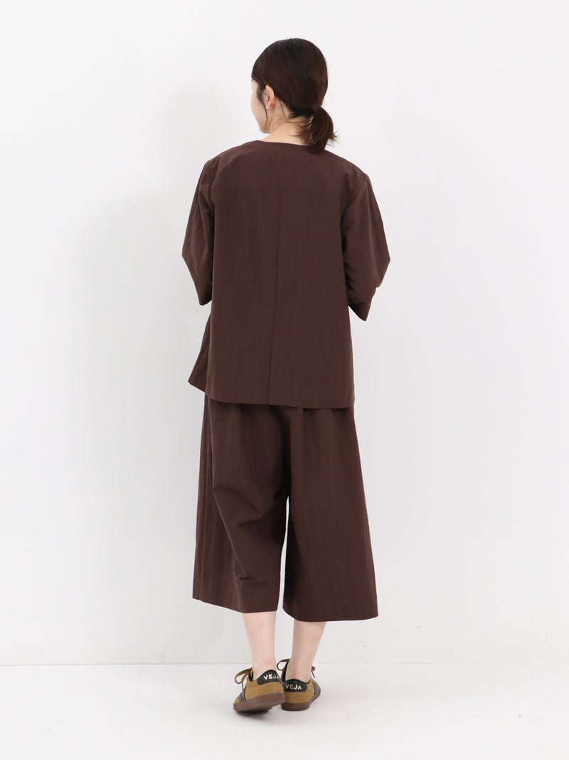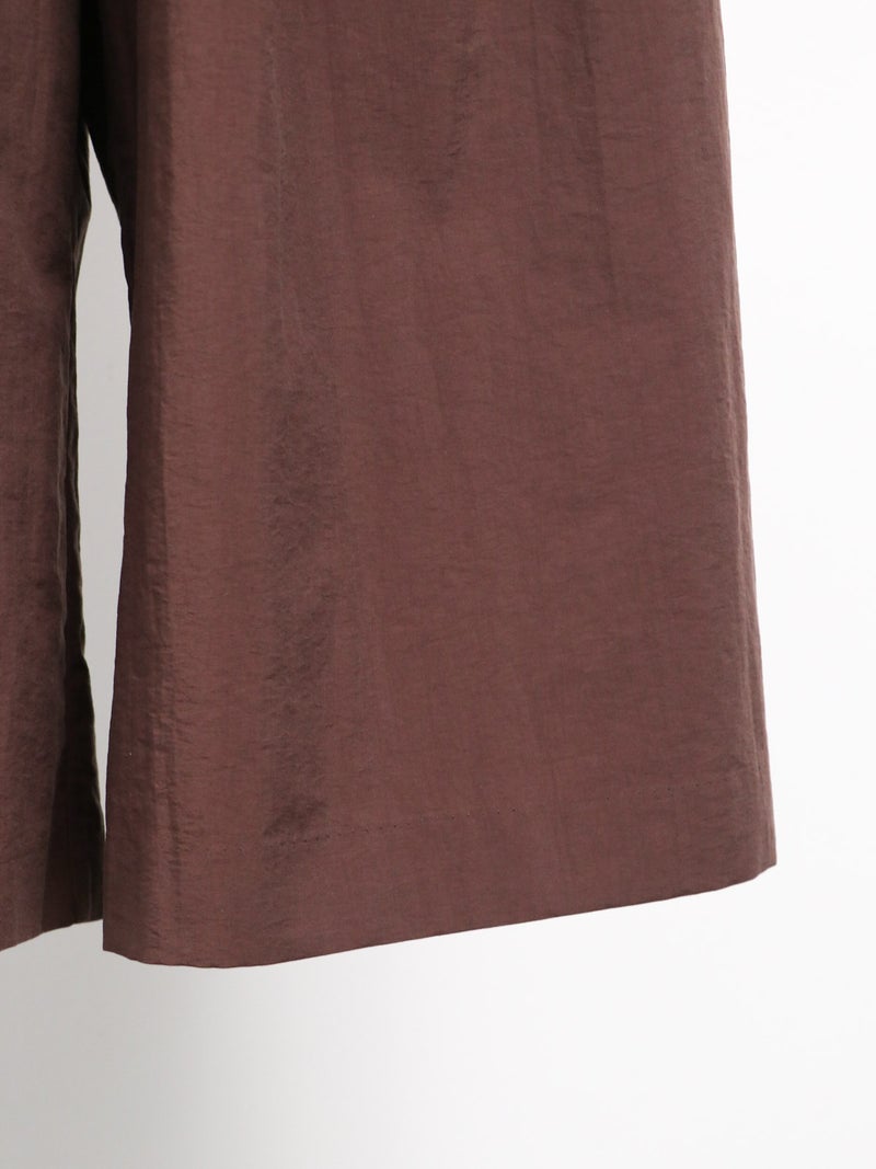 天然素材の様なナチュラルな風合いのナイロンハーフパンツ。 トレンド感のあるハーフパンツ。ふくらはぎをカバーしてくれる少し長めの着丈に、タック入りのウエストで綺麗なシルエットに仕上がっています。サラッとした肌触りで、夏のお出かけにも最適な素材感。撥水性があり、水や汚れにも強くお手入れしやすいところもポイント。同素材のジャケットとのセットアップもおすすめです。