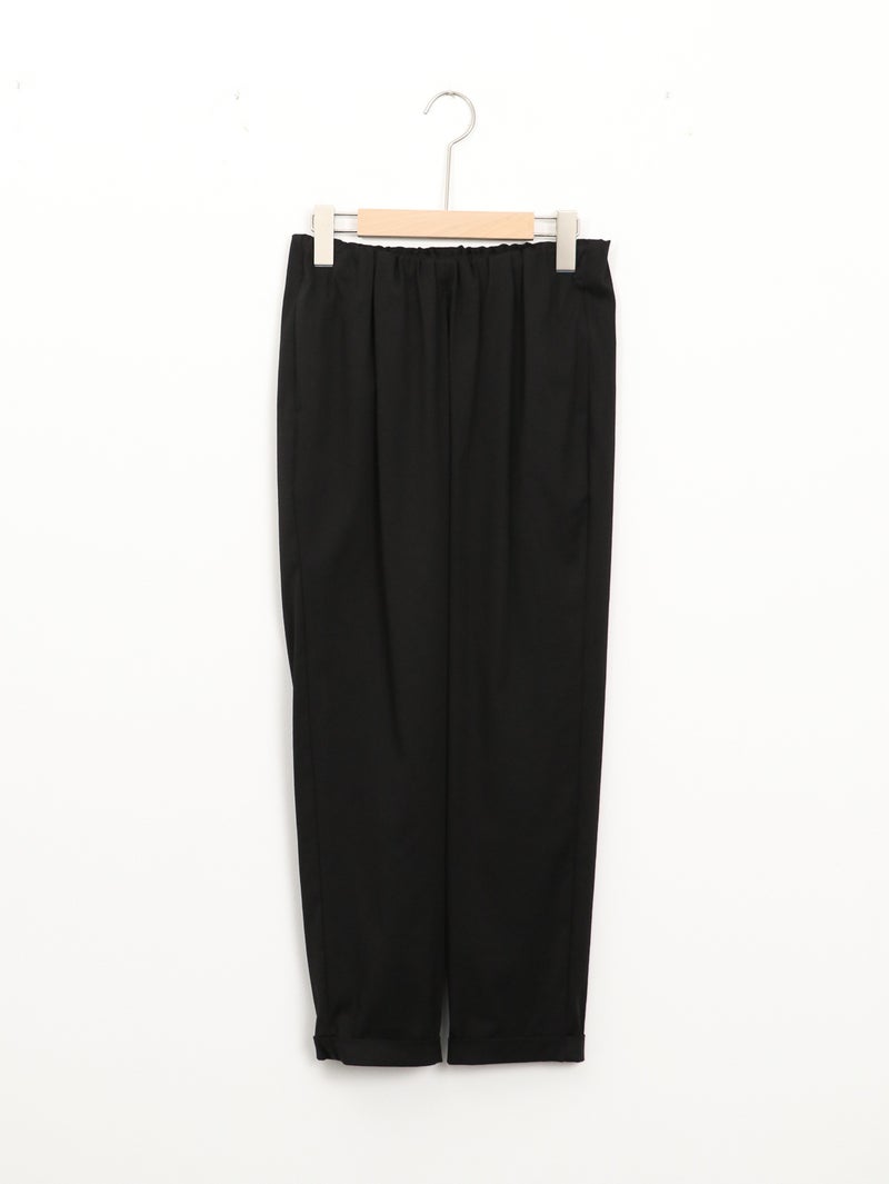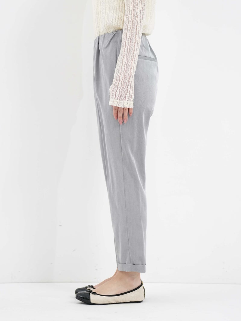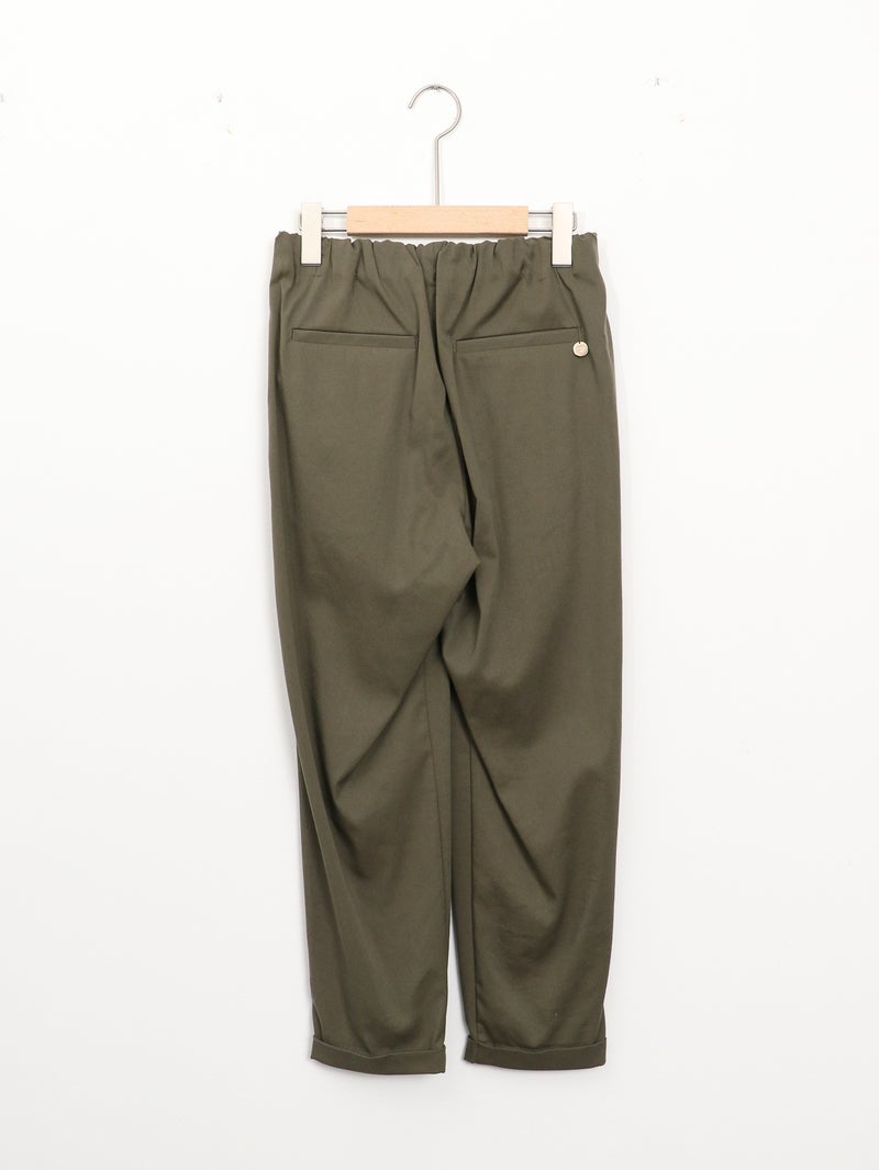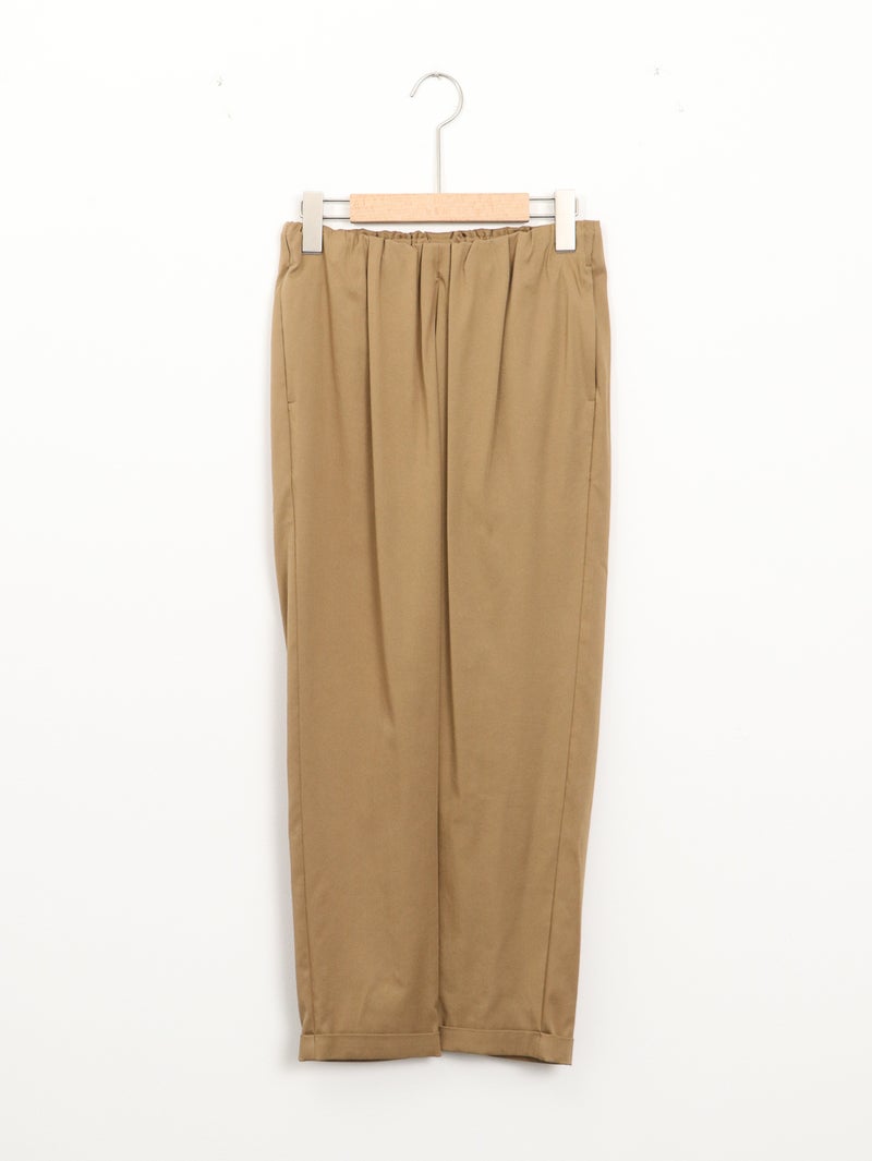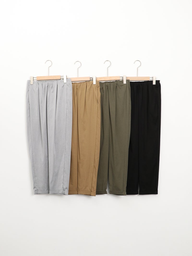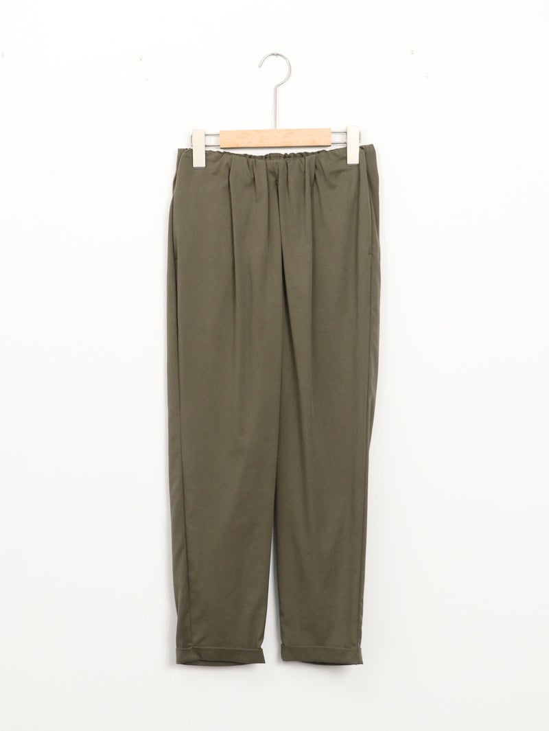 MARECHAL TERRE(マルシャル テル)定番のギャザーイージーパンツ。 ウエストは平ゴム仕様で、穿き心地はリラックス。両サイドにポケットを備え、デイリーに使いやすい一本です。足首がすっきり見えるクロップド丈に、ロールアップデザインが程よいアクセント。上品な光沢感と落ち感のある素材、きれいなテーパードラインが、イージーパンツながらきちんとした印象を演出します。カジュアルにもきれいめにも馴染み、オンオフ問わず活躍。一度穿くと手放せなくなる、バランスの取れた定番アイテムです。