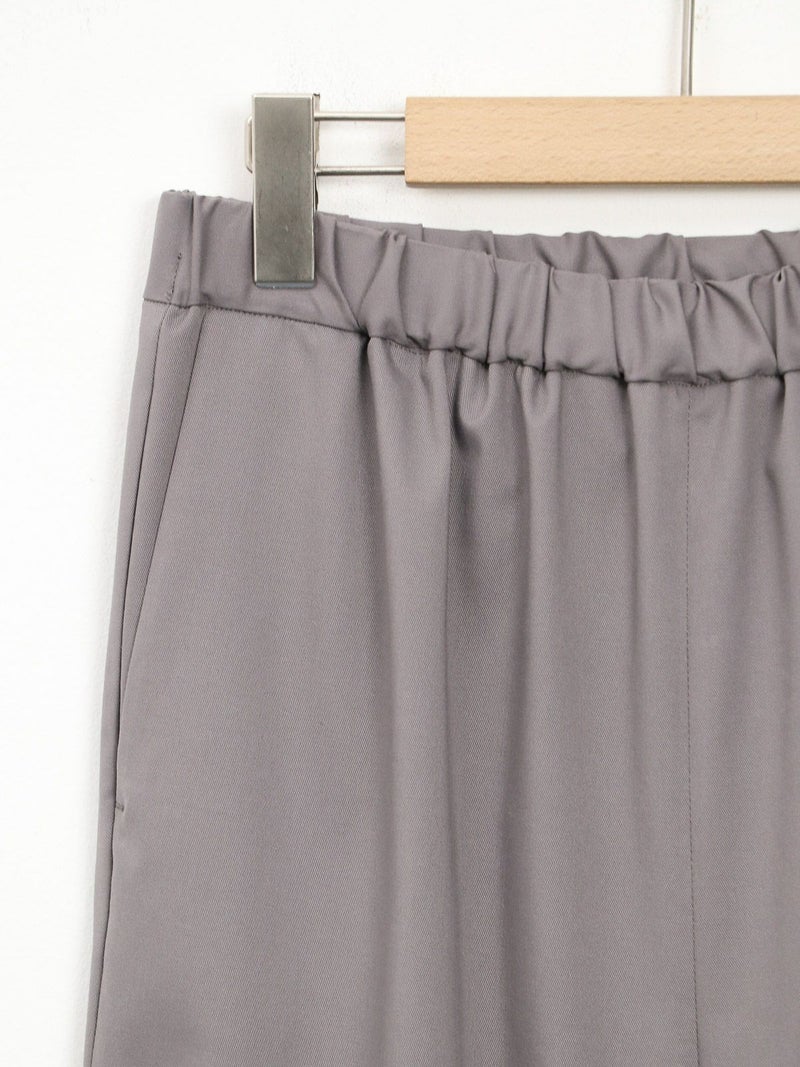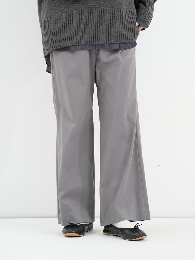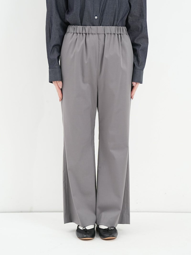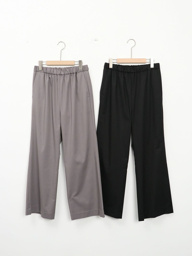 大袈裟すぎず程よいセミフレア感のパンツ。 バレエシューズやスニーカーでもバランスがとりやすい丈感。ウエストが総ゴムでストレスフリーな履き心地です。
