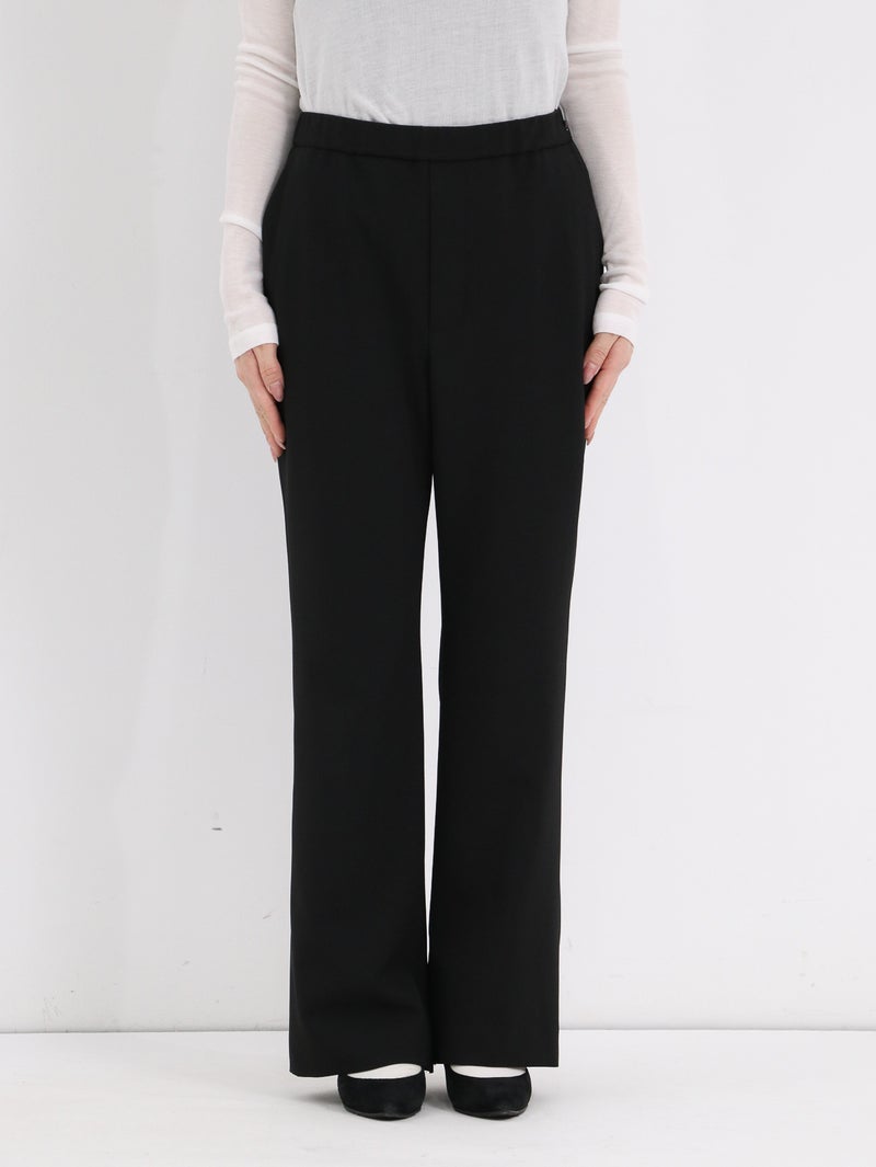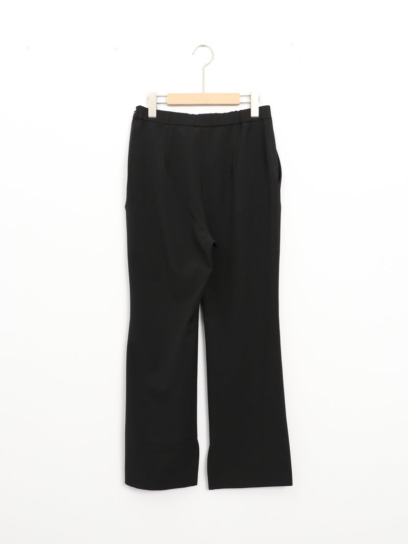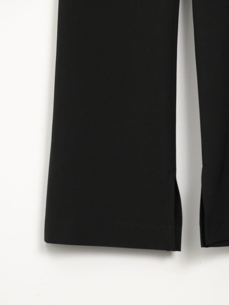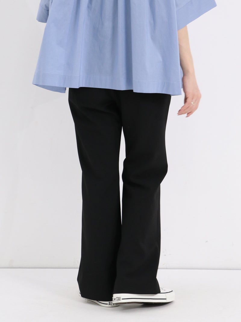 セミフレアのスリット入りパンツ。 脚長効果の高いキレイなシルエット。シワになりづらい素材感で、デイリーに活躍します。ウエストゴムのイージーな着心地でストレスフリー。キレイ目からカジュアルまで幅広いスタイリングに対応できます。