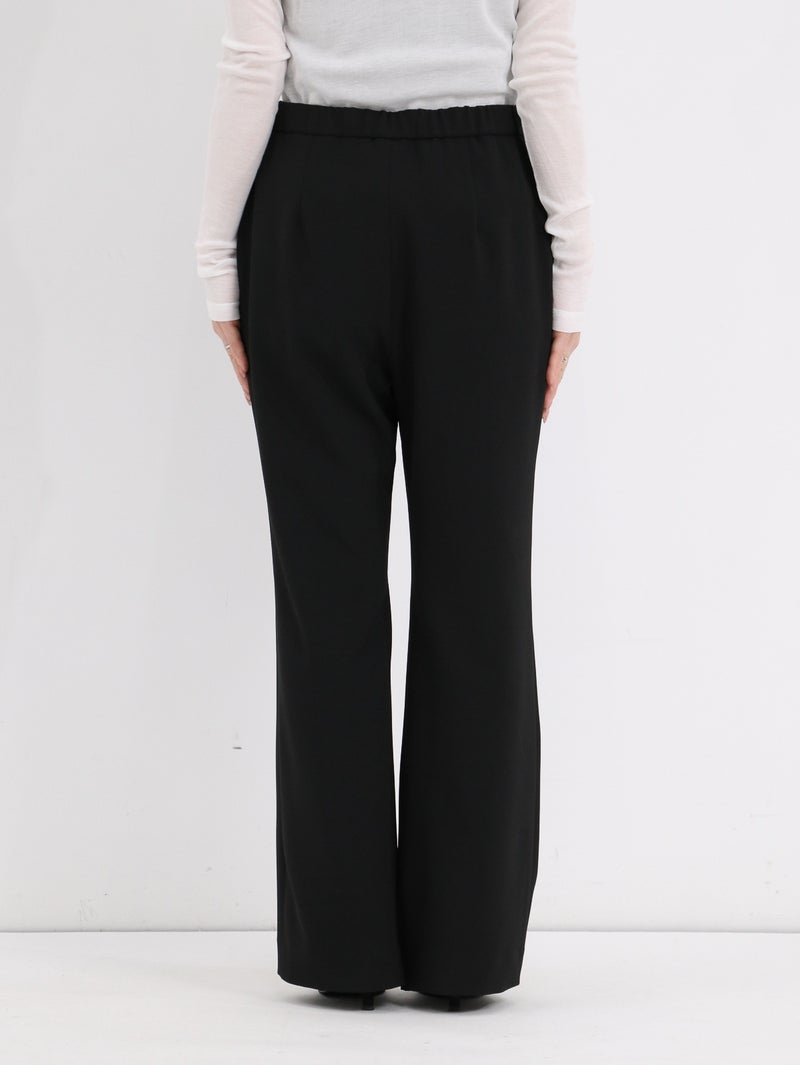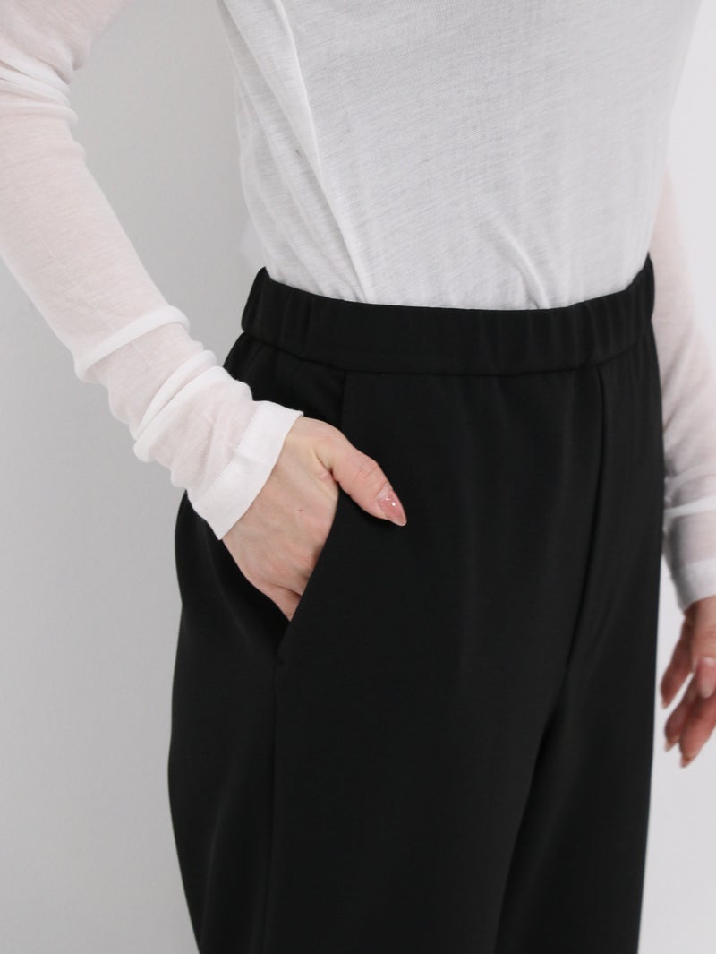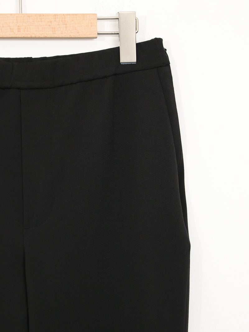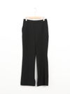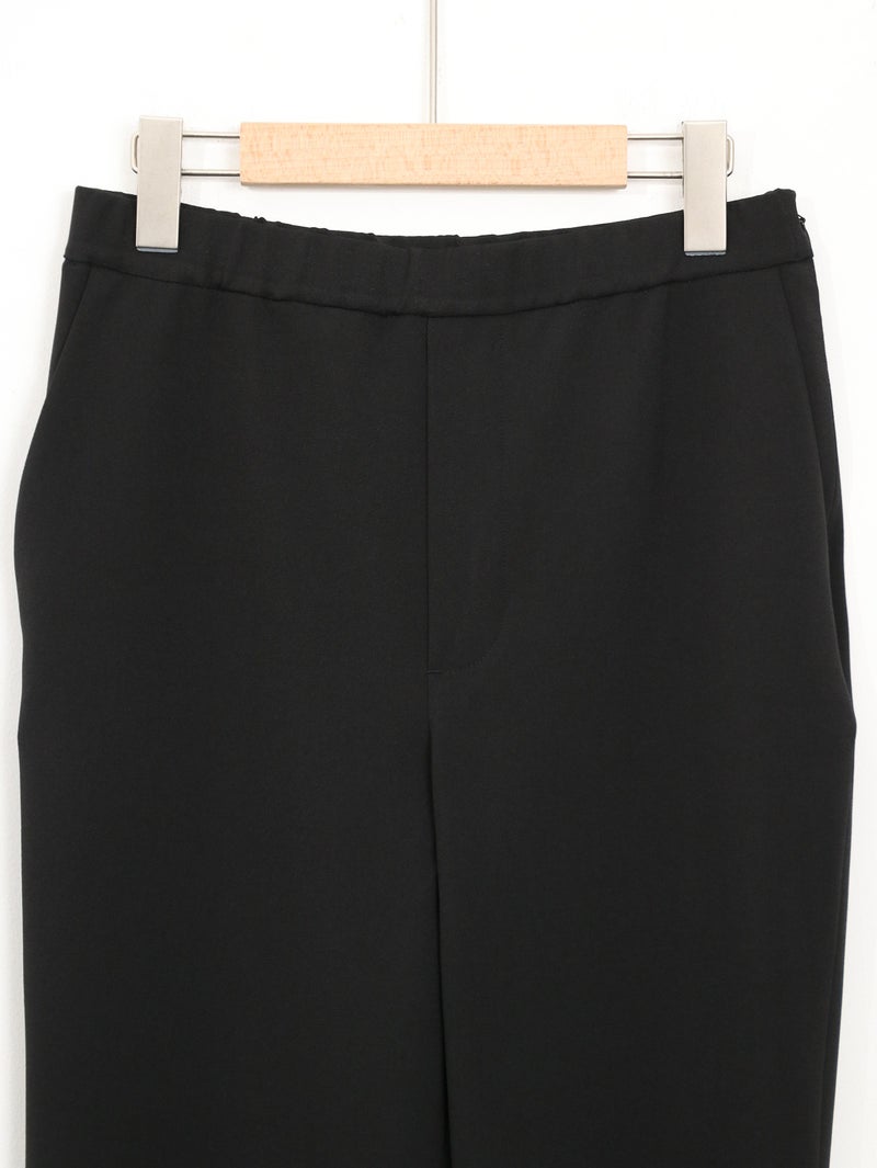 セミフレアのスリット入りパンツ。 脚長効果の高いキレイなシルエット。シワになりづらい素材感で、デイリーに活躍します。ウエストゴムのイージーな着心地でストレスフリー。キレイ目からカジュアルまで幅広いスタイリングに対応できます。