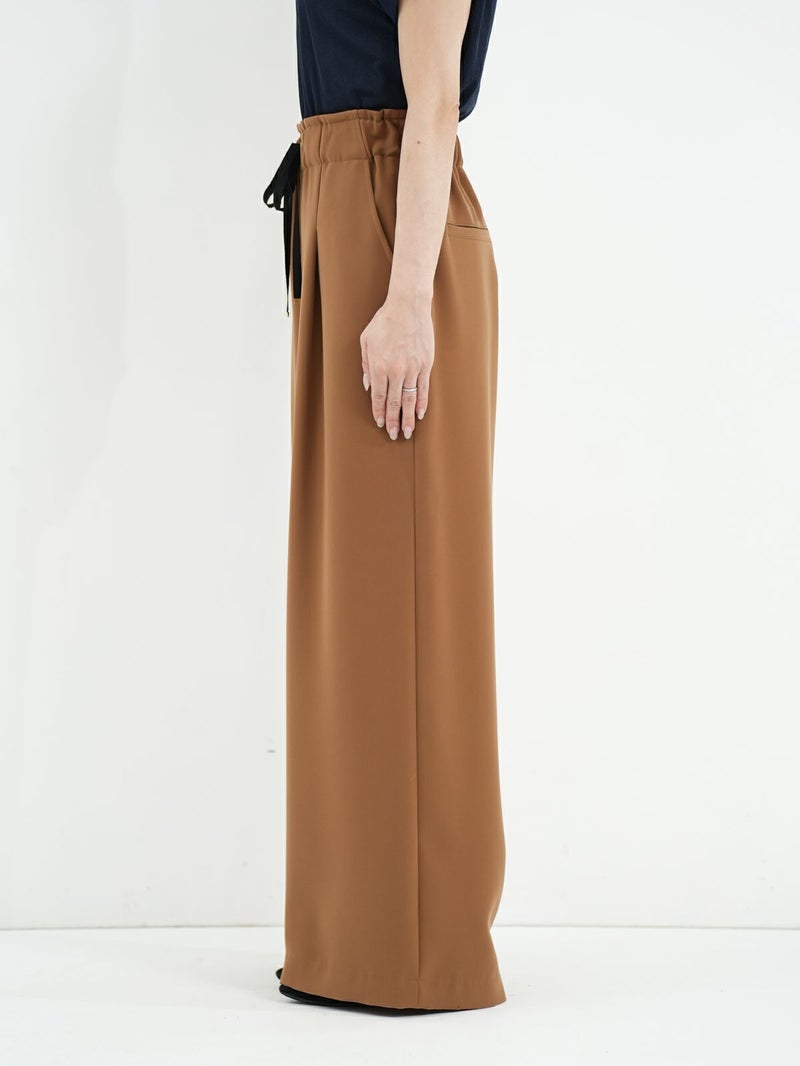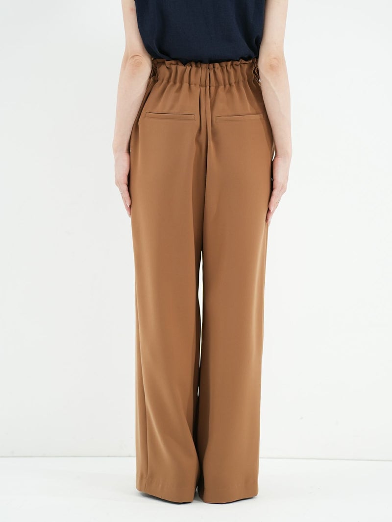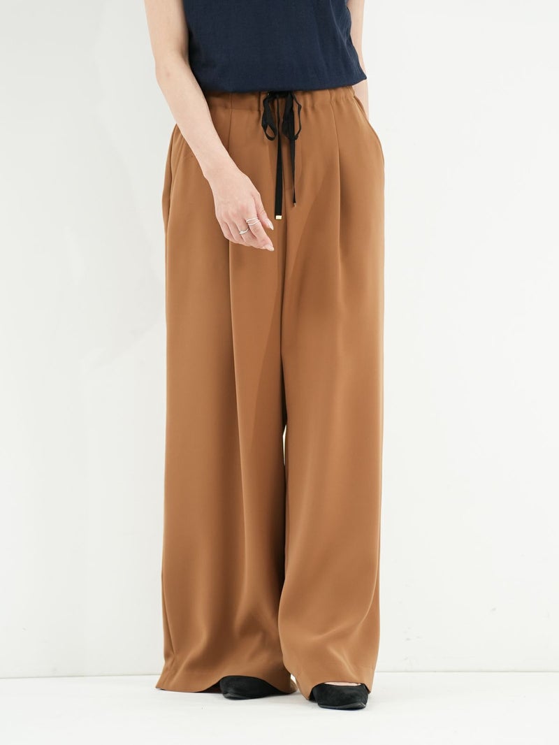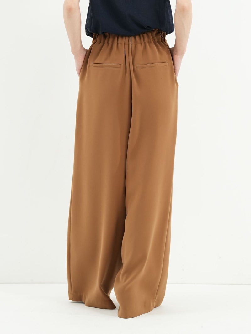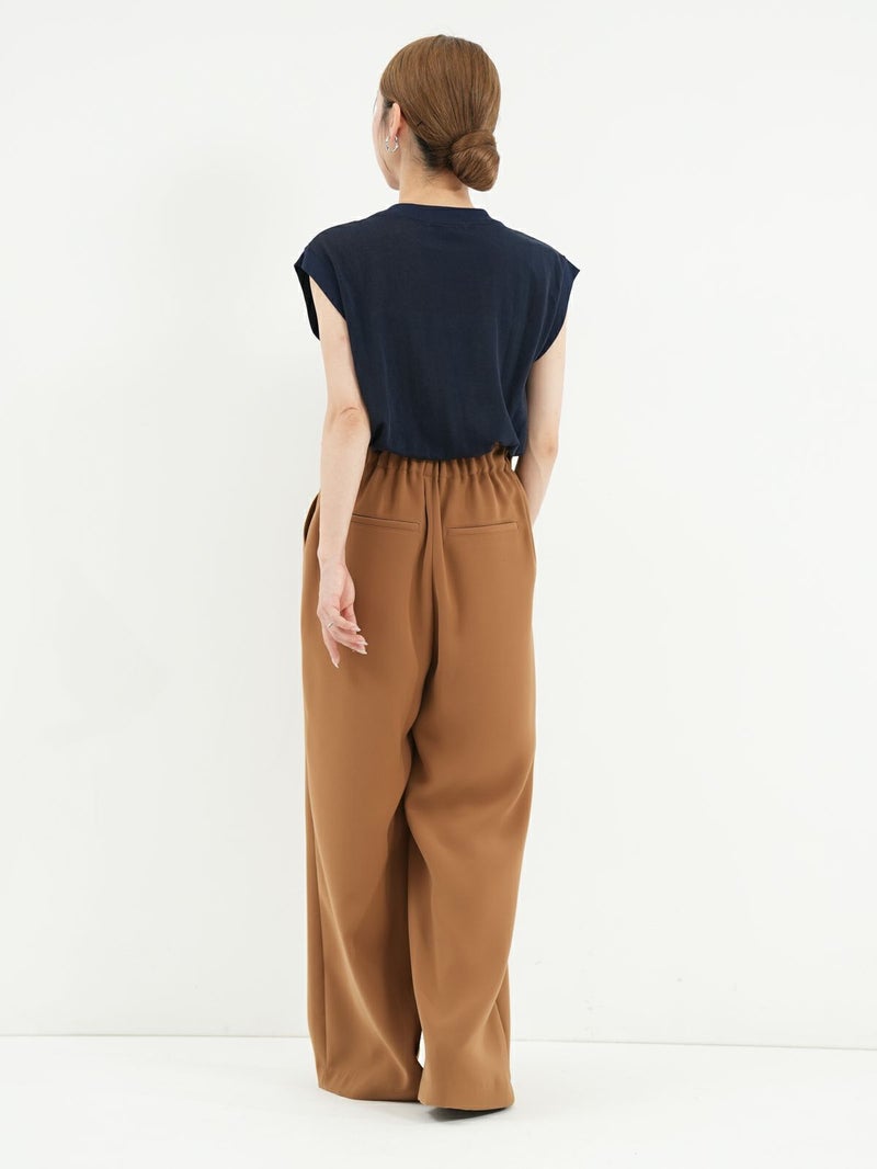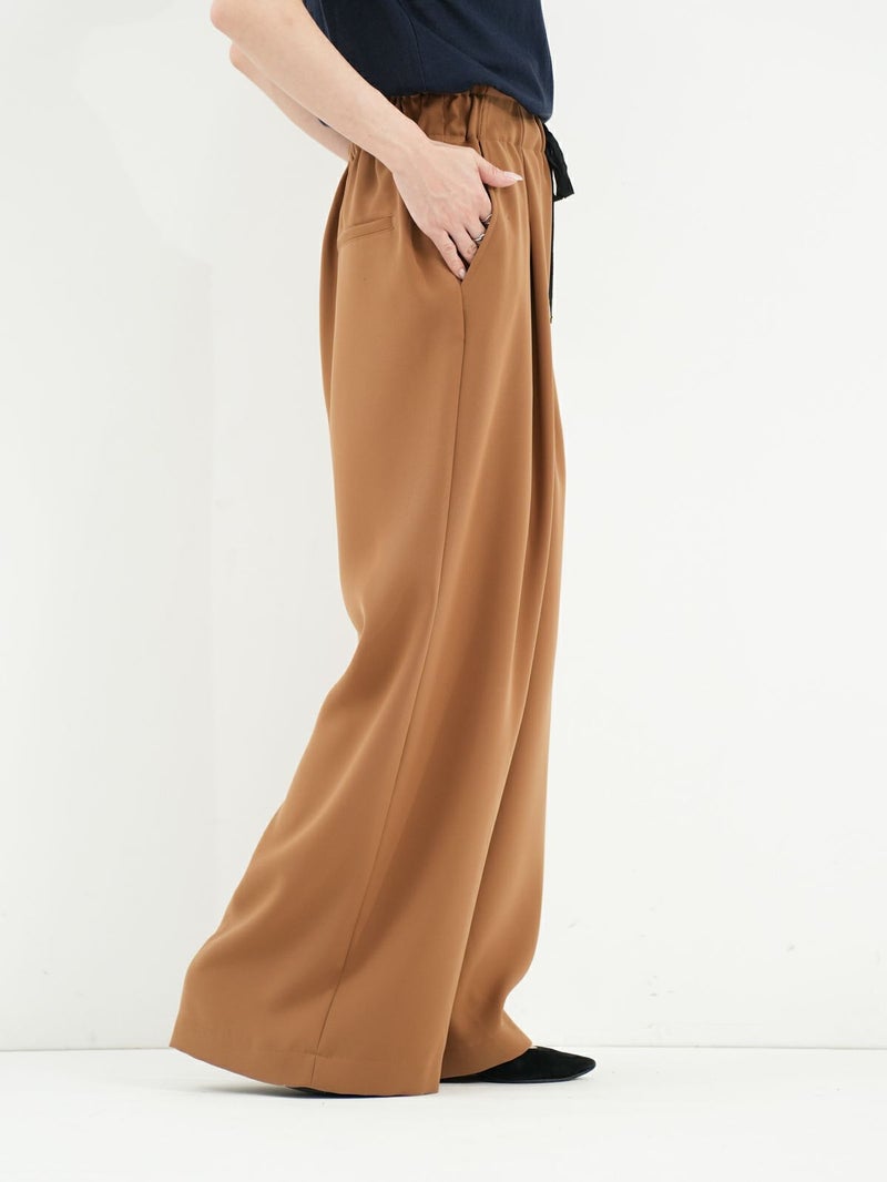 定番のダブルクロスを使用したワイドパンツ。 ドライタッチかつ伸縮性の優れた糸を使用し上品なドレープ感と光沢感が大人なシルエットを演出。 同素材のジレとセットアップでの着用もおすすめです。