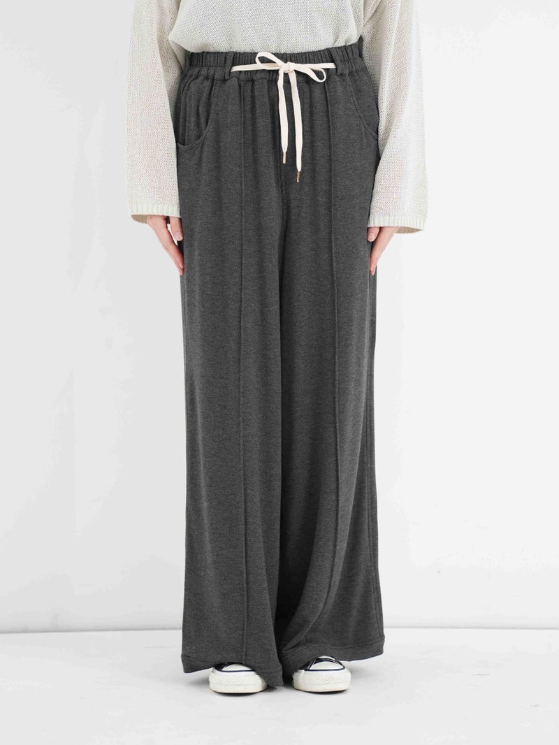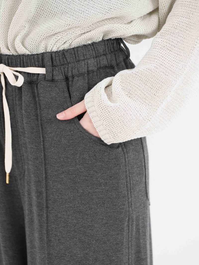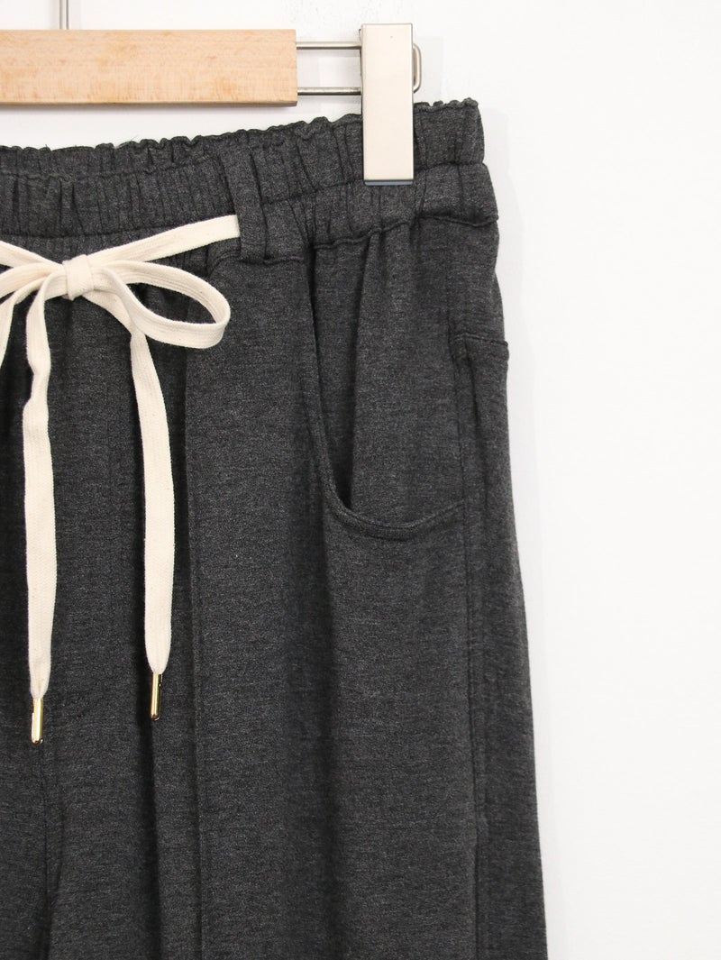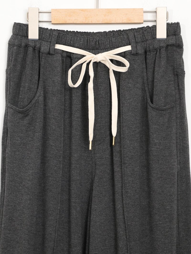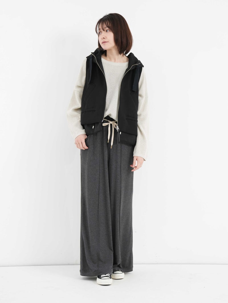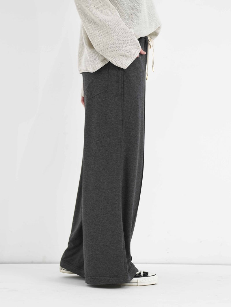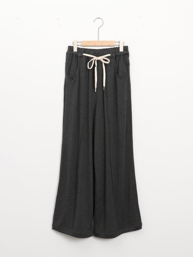 レーヨン混の落ち感のある裏毛を使用し、薄地で柔らかくとろみ感のあるパンツ。