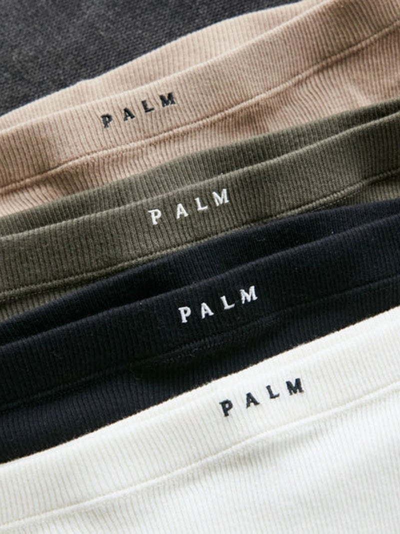 【 PALM / パーム 】 創業1906年のイギリスの小さな町ヒンクリー生まれのインナーブランド。 1900年代初期製のヴィンテージ編機を使い、糸にテンションをかけずに編まれる、ストレッチ性の高いふんわりとした風合いが特徴。縫製する部分が少ないことも有り、裁断時に出る裁断生地ゴミが少なく済む、環境にも優しい商品です。