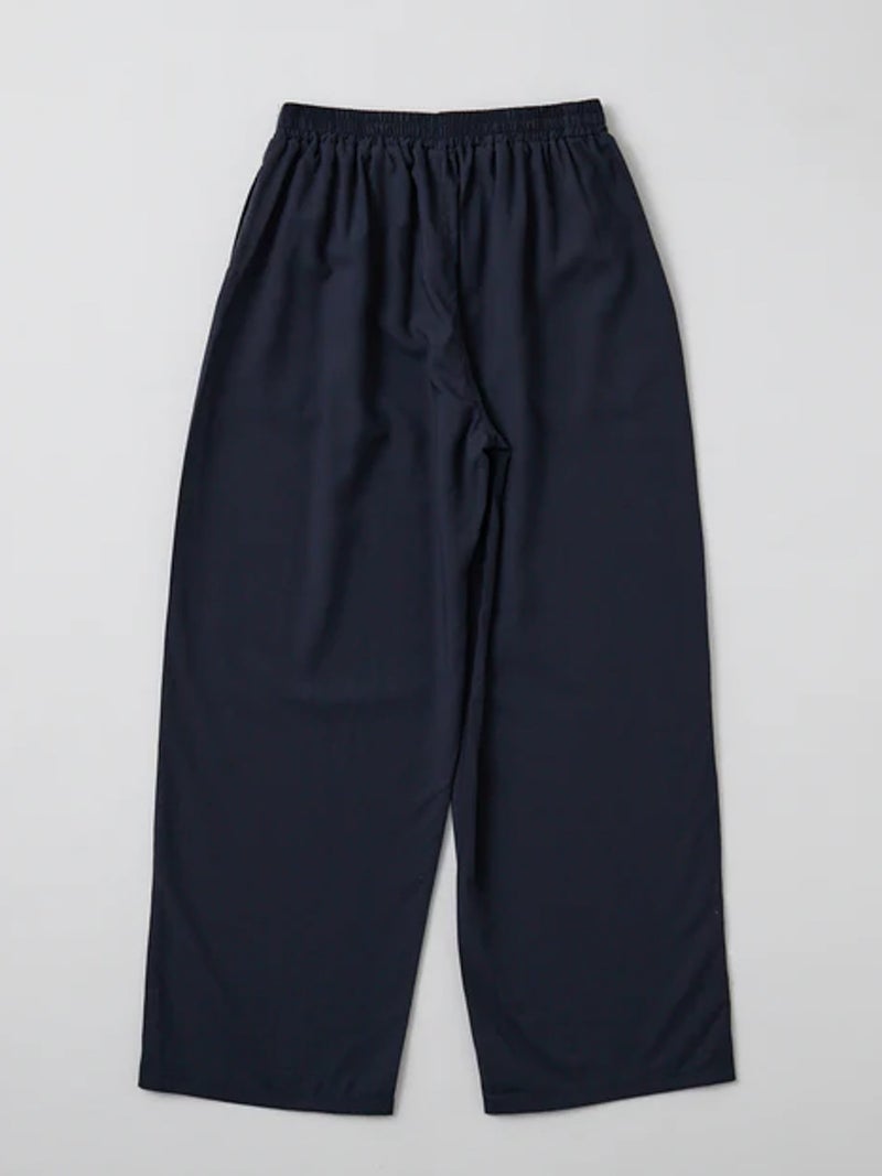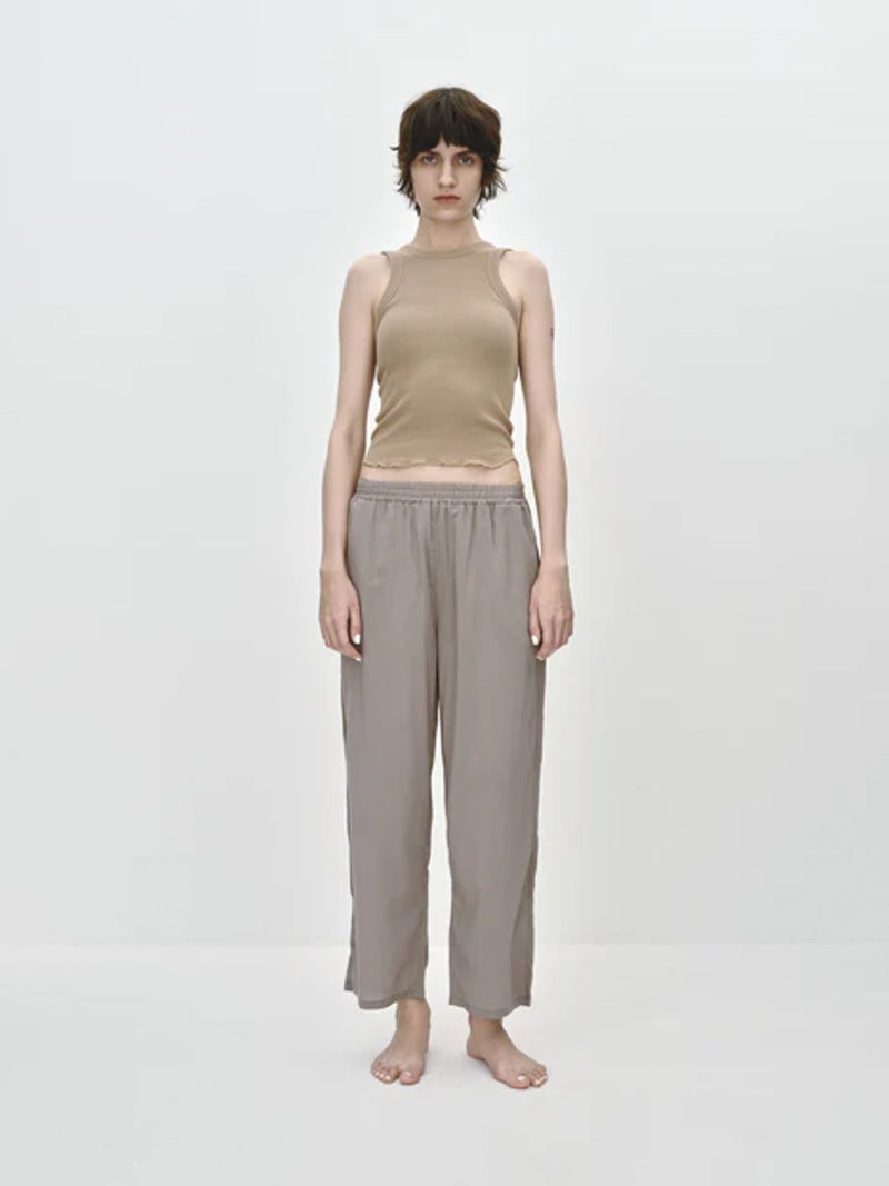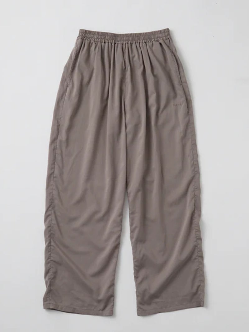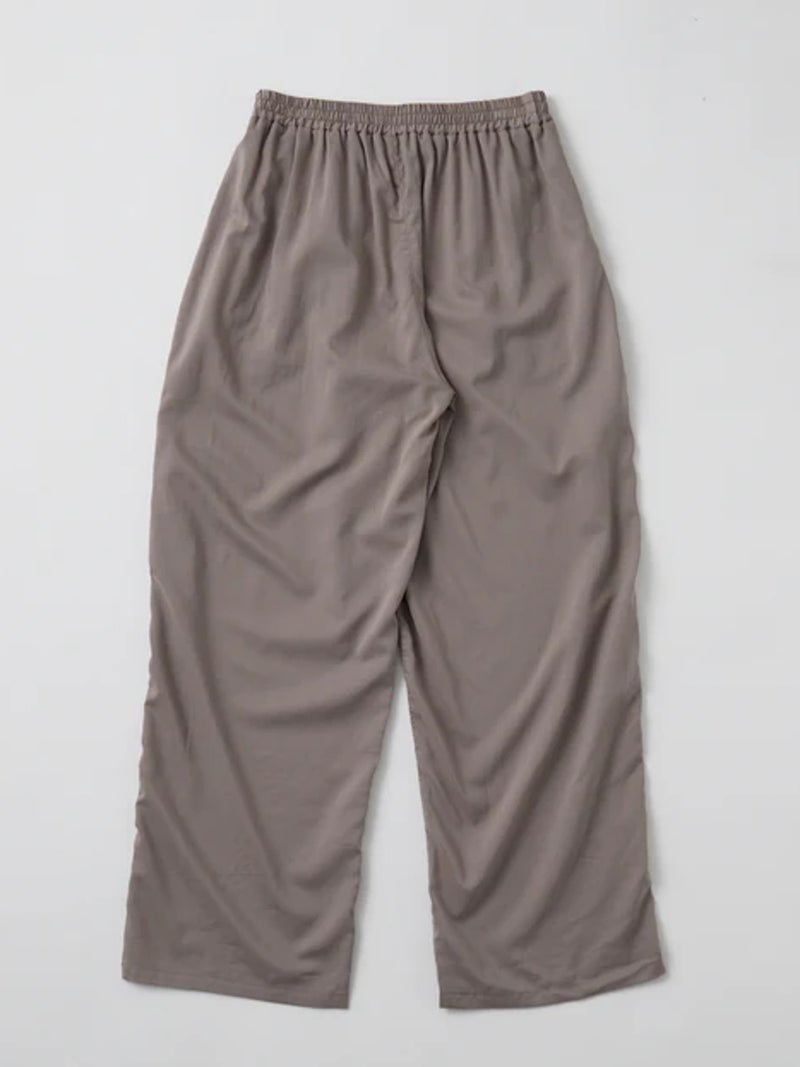 軽やかな着心地が魅力のスラックスパンツ。 透け感のある、なめらかで軽やかな素材を使用し、涼しく快適に着用できる一枚。リラックス感がありながらも、すっきりとした印象で着こなせます。PALMのインナーに合わせたルームウェアシリーズで、GATHER CAMISOLE(PLM2602004)とのセット着用も可能。さりげなく施された同色のPALM刺繍がアクセントになっています。