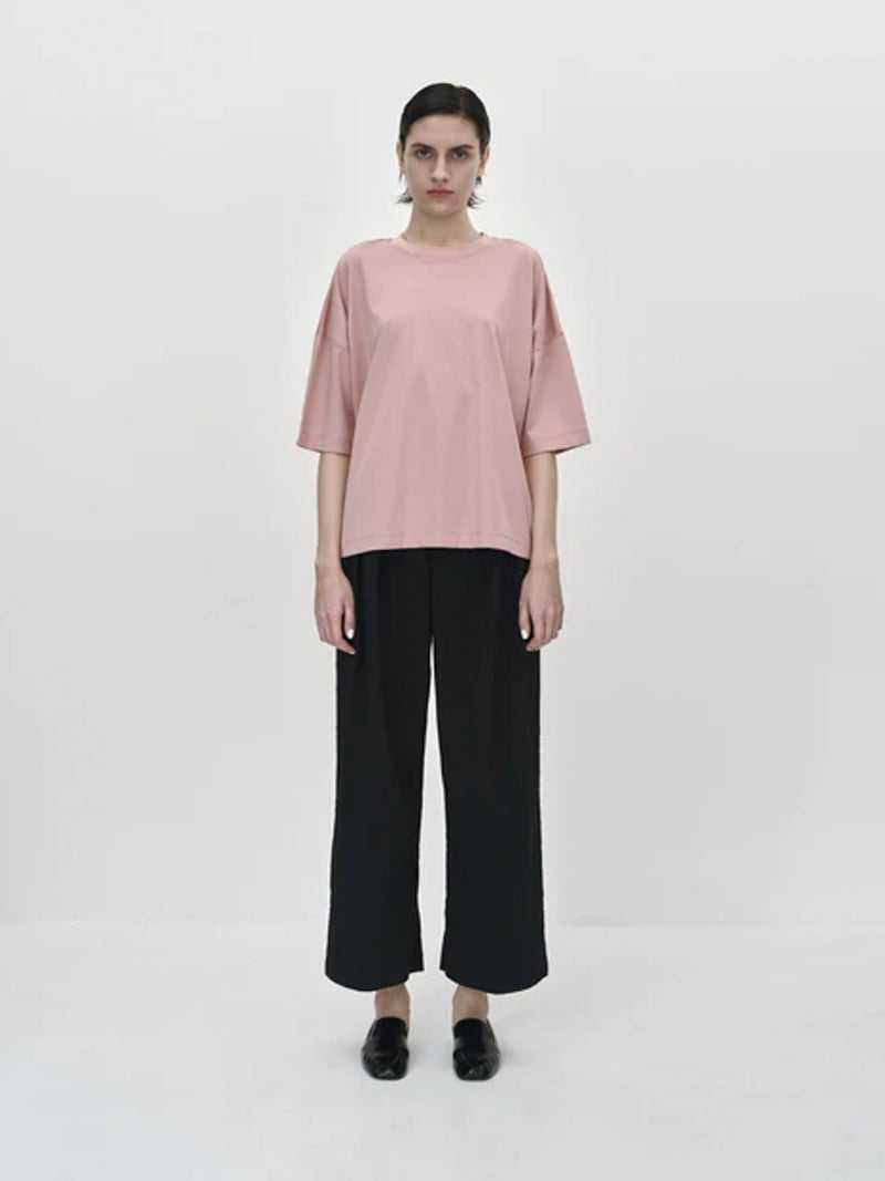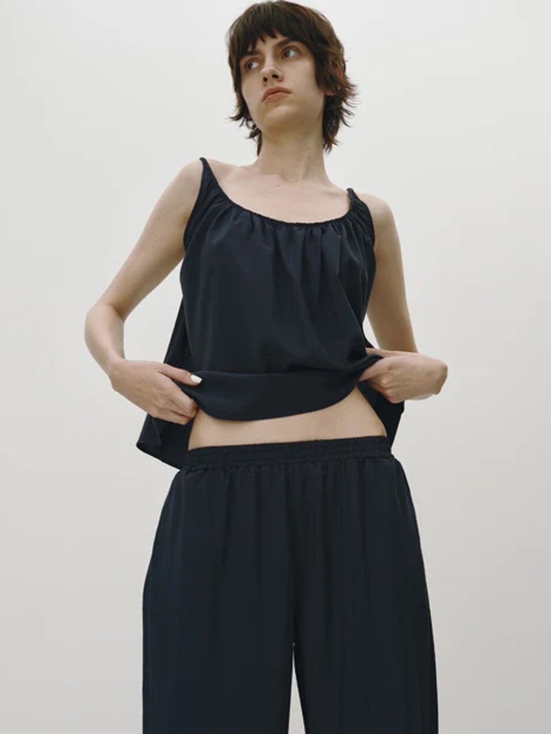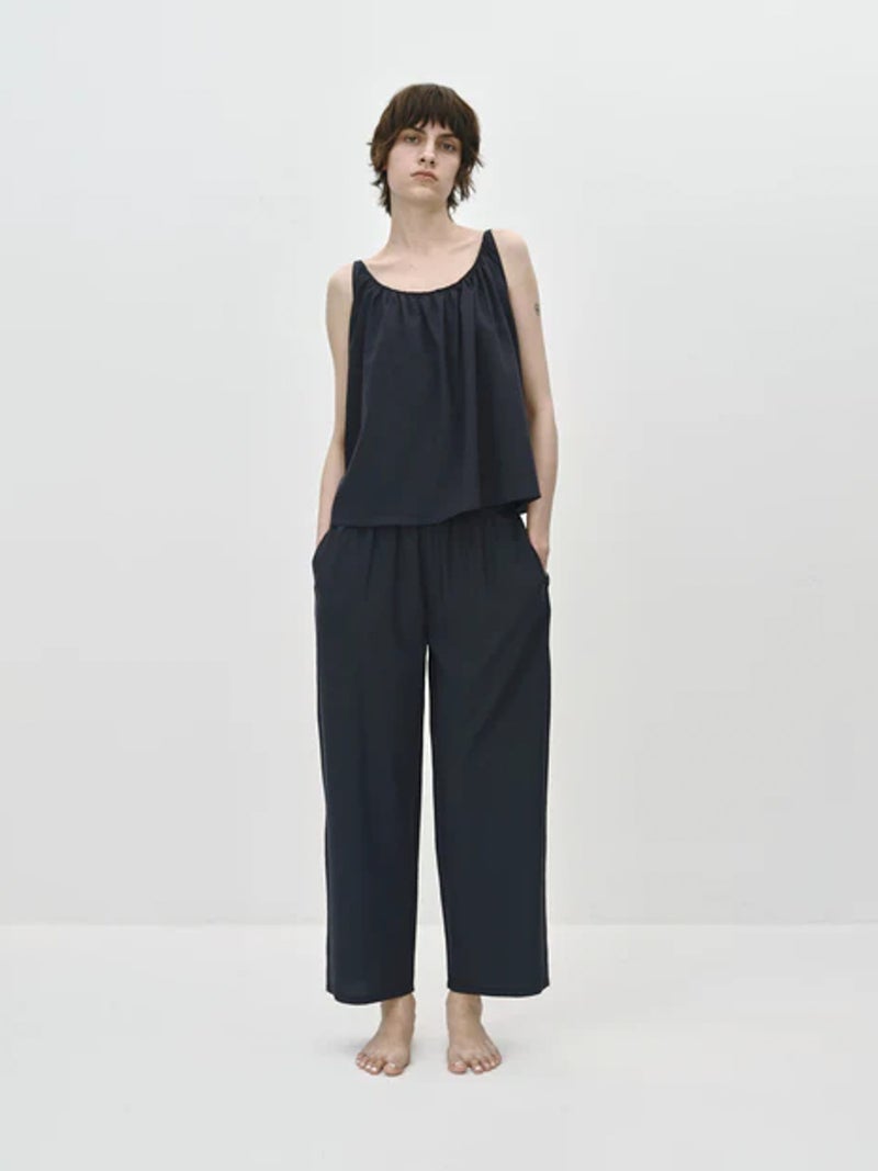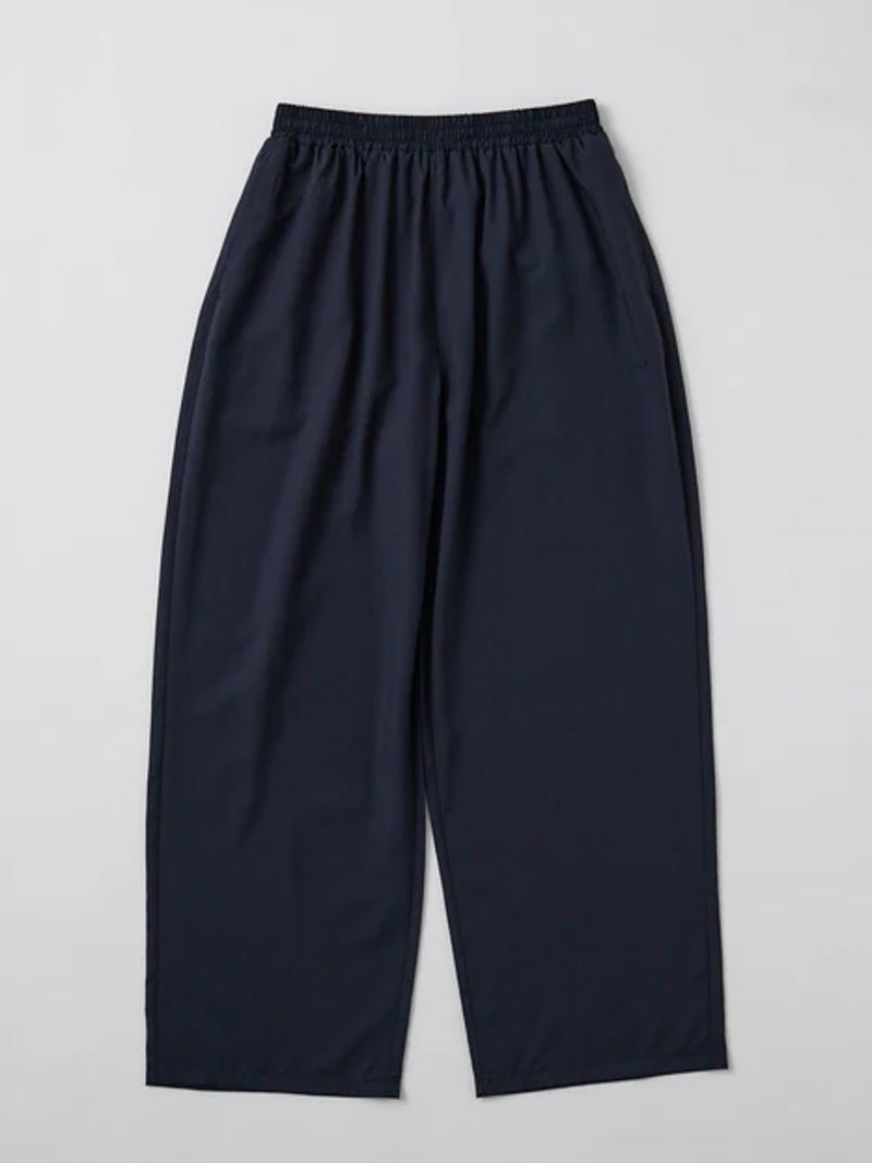 軽やかな着心地が魅力のスラックスパンツ。 透け感のある、なめらかで軽やかな素材を使用し、涼しく快適に着用できる一枚。リラックス感がありながらも、すっきりとした印象で着こなせます。PALMのインナーに合わせたルームウェアシリーズで、GATHER CAMISOLE(PLM2602004)とのセット着用も可能。さりげなく施された同色のPALM刺繍がアクセントになっています。