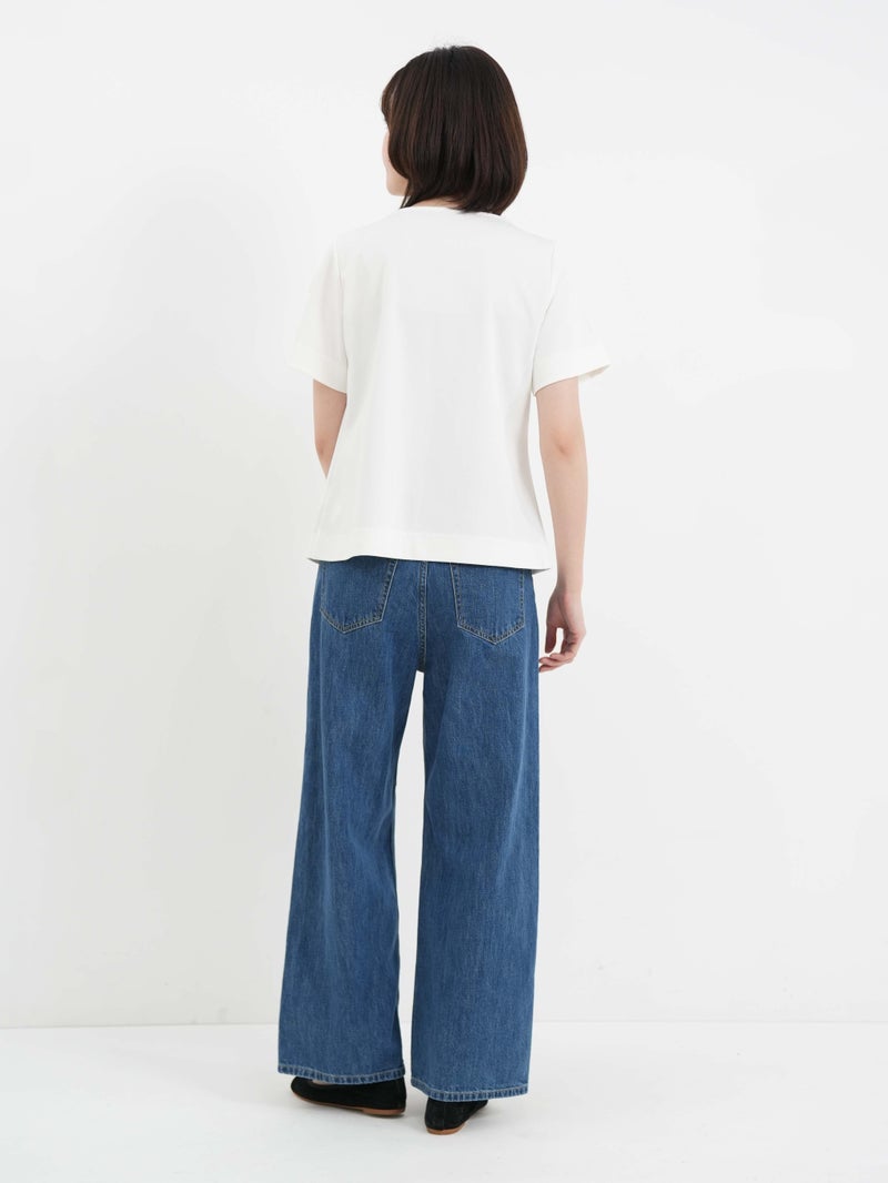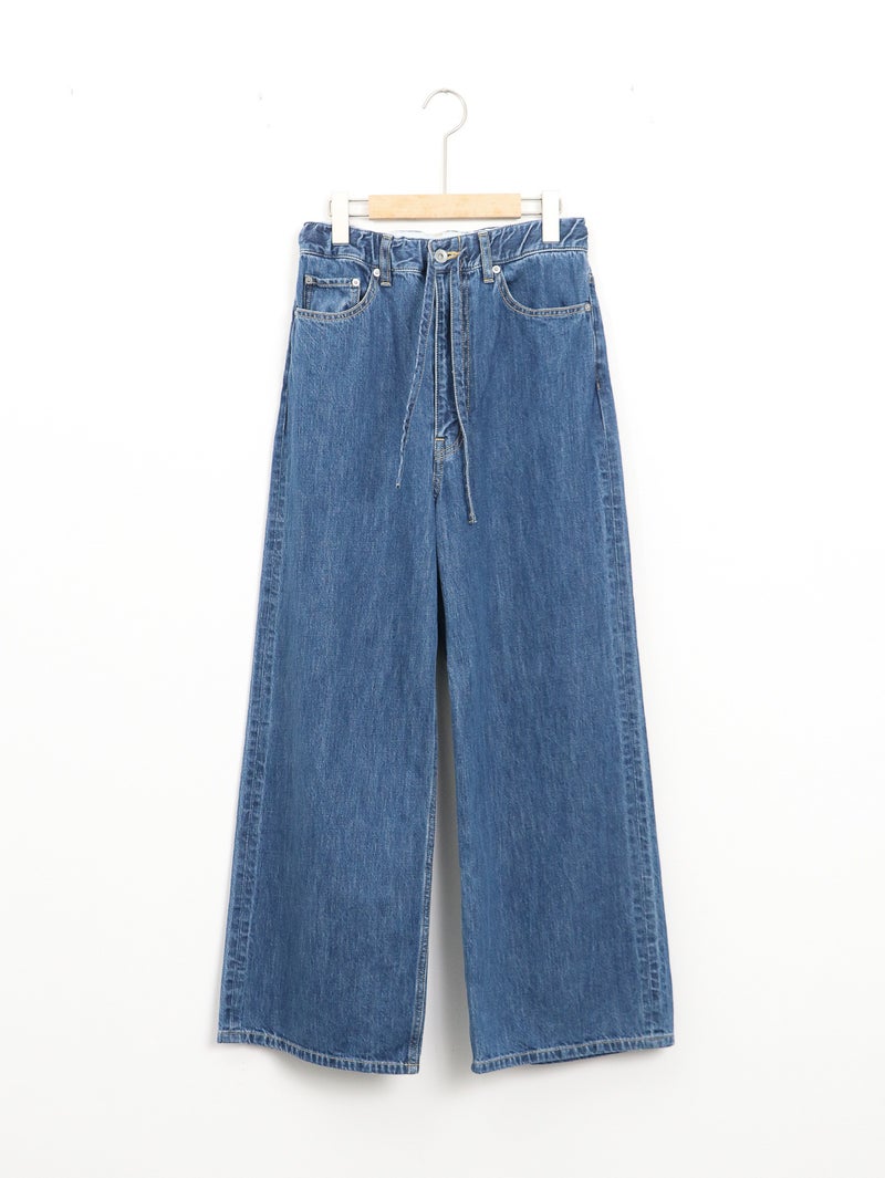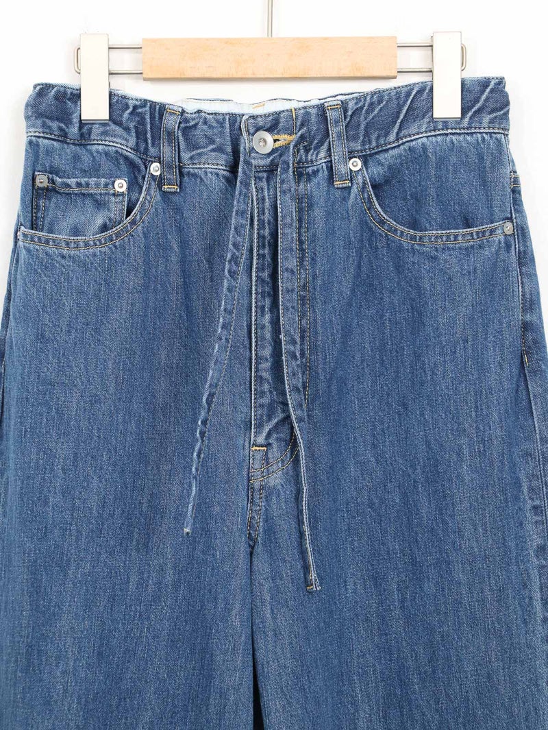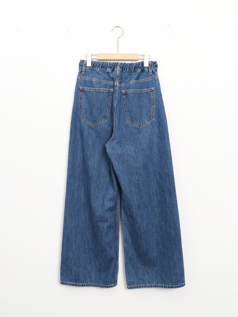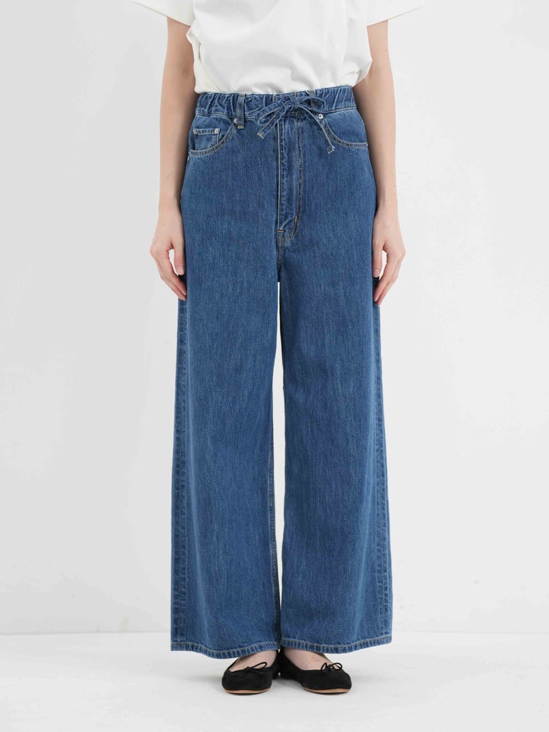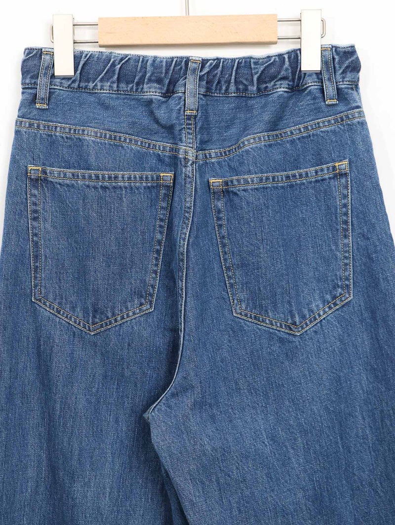軽くて柔らかく着心地の良い9オンスのジャパンデニム。 インディゴカラーをの良さを残したミディアムブリーチのデニムブルー。ウエストにゴムを用いたイージーデニム。カジュアルな雰囲気のなかに、上品さが感じられる1着です。