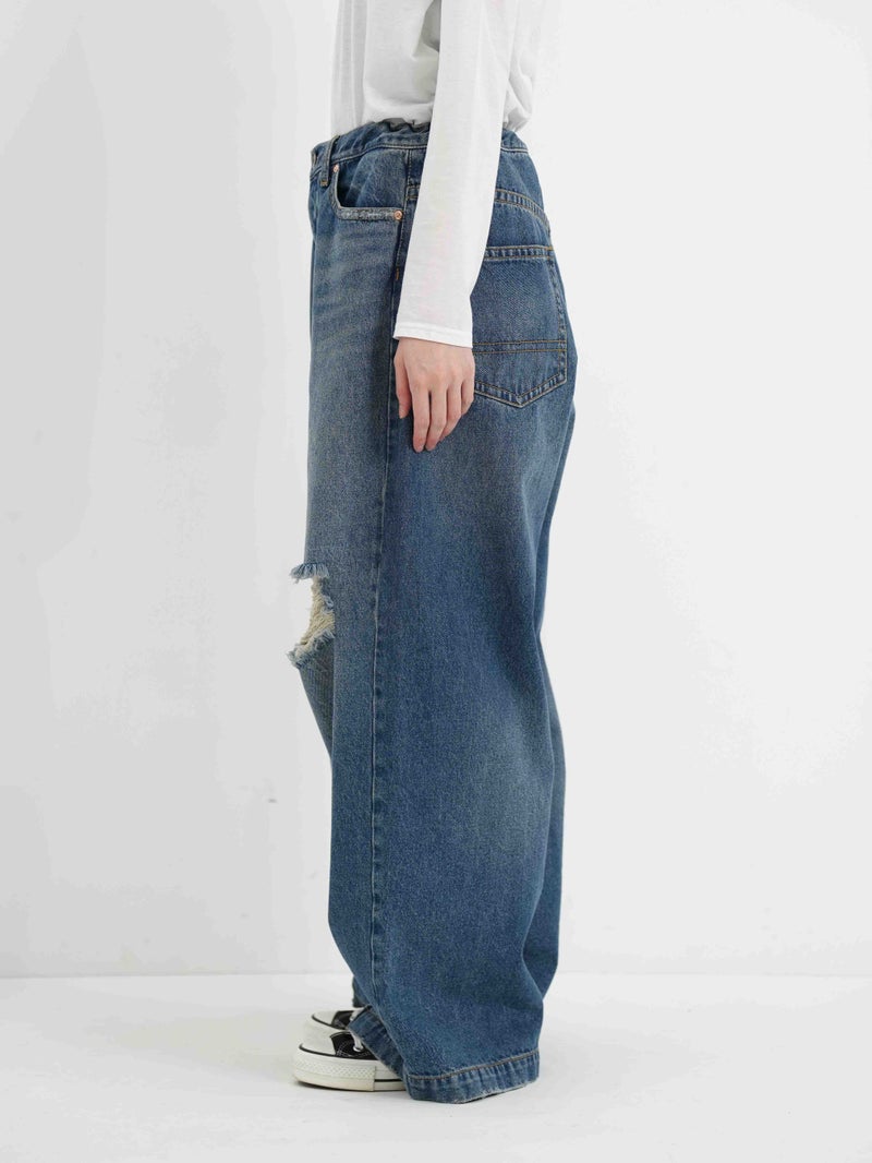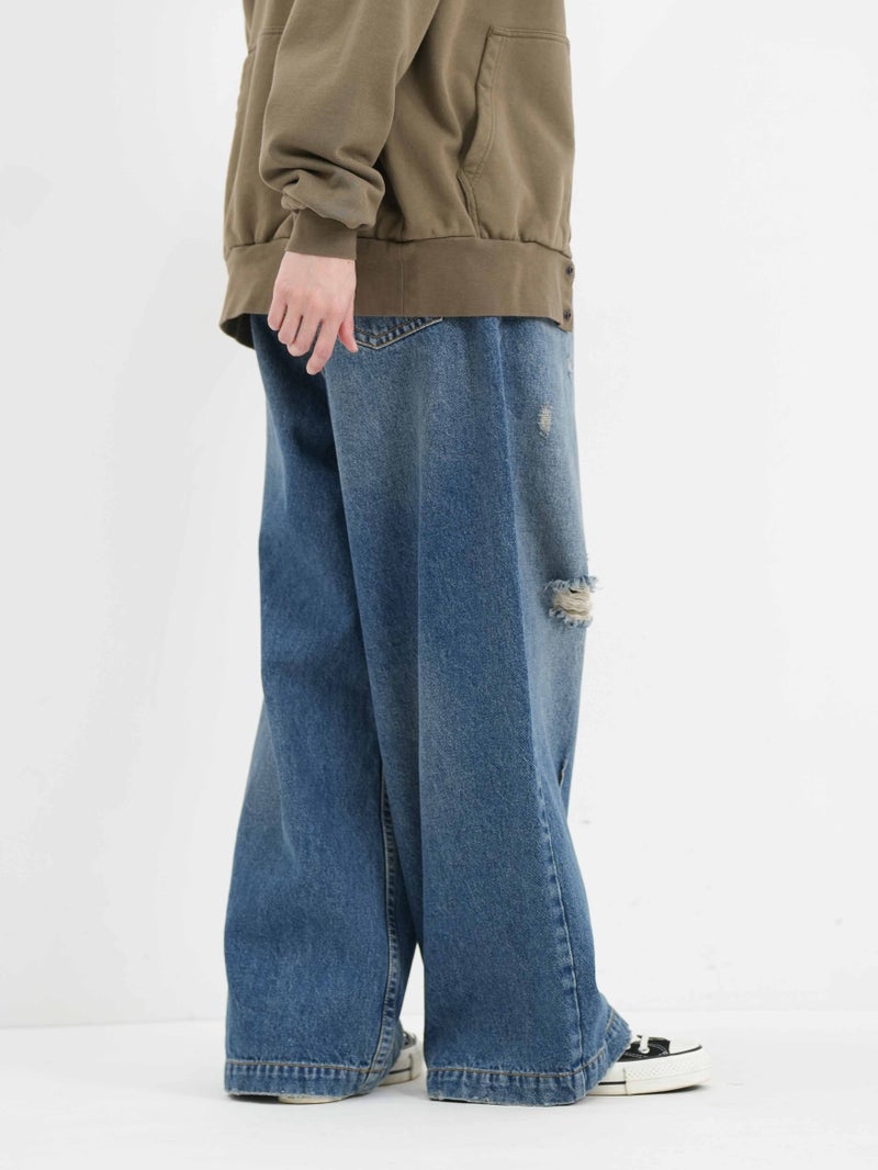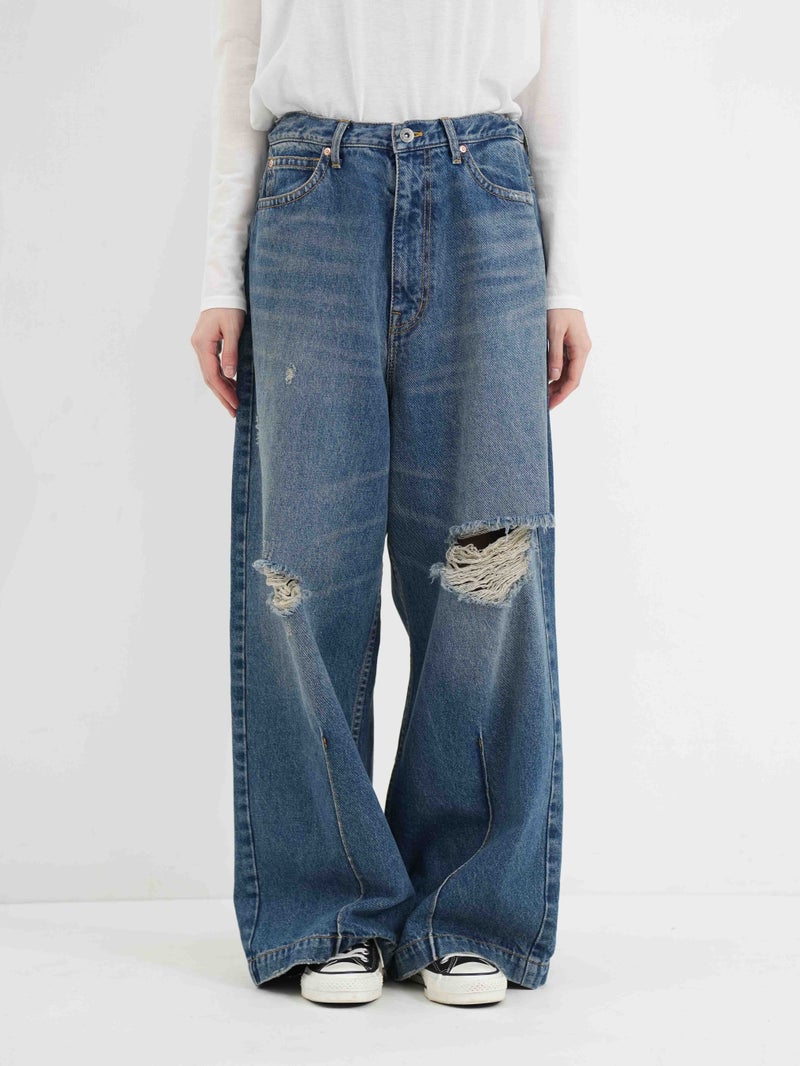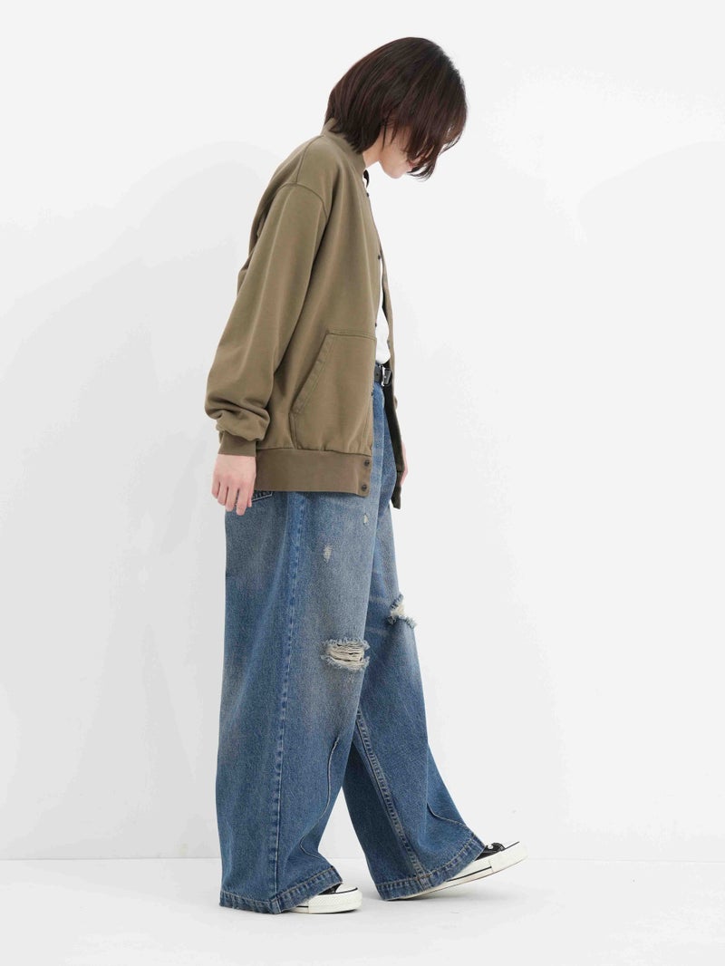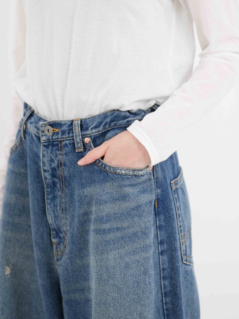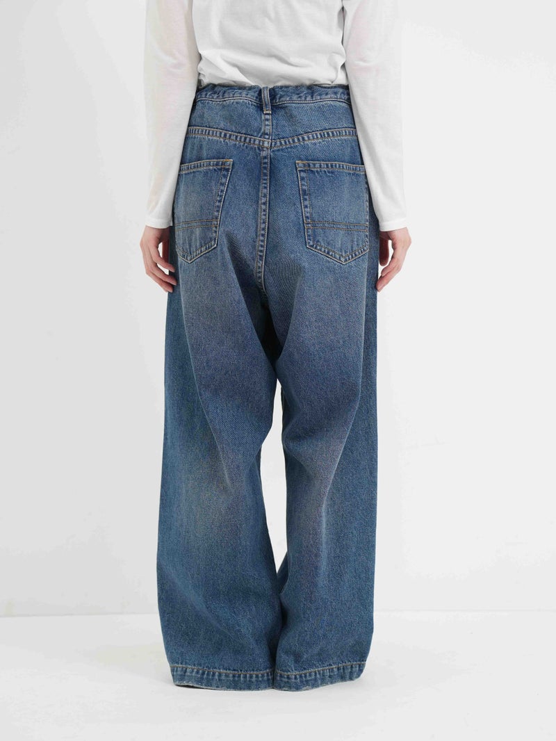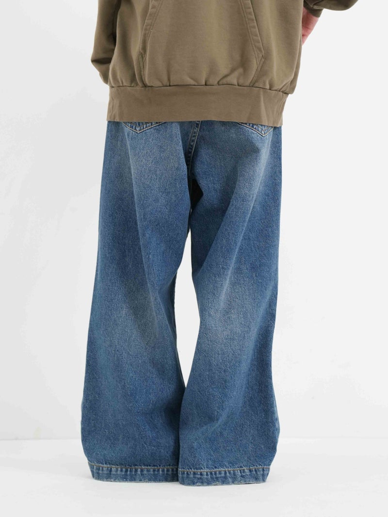 極太のシルエット、股上も深くルーズフィットで楽しんで頂ける定番ストレートジーンズ。 ウエスト裏にはドローコードを搭載しているのでノーベルトでもしっかりホールドしてくれます。ステッチピッチカウントも大きく取ることで表情が豊かなジーンズになりました。リアリティのあるダメージや色落ちでヴィンテージ感漂わせる1本に、14オンスで肉厚ながらしなやかな風合いに仕上げました。
